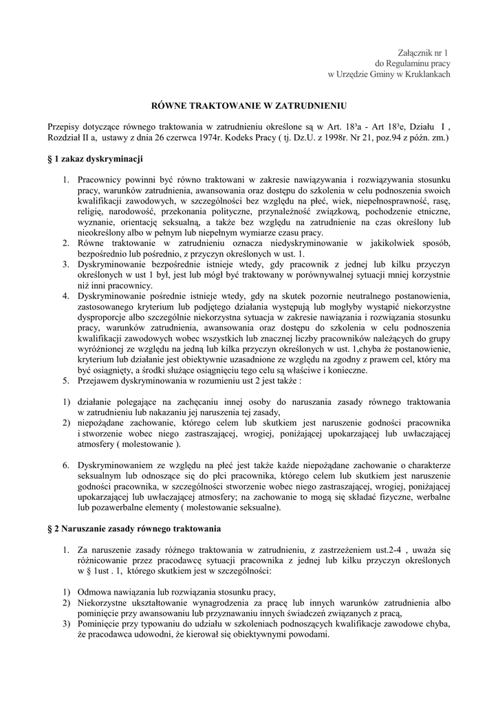 Załącznik nr 1 do Regulaminu pracy w Urzędzie Gminy w Kruklankach RÓWNE TRAKTOWANIE W ZATRUDNIENIU Przepisy dotyczące równego traktowania w zatrudnieniu określone są w Art. 18³a - Art 18³e, Działu I , Rozdział II a, ustawy z dnia 26 czerwca 1974r. Kodeks Pracy ( tj. Dz.U. z 1998r. Nr 21, poz.94 z późn. zm.) § 1 zakaz dyskryminacji 1. Pracownicy powinni być równo traktowani w zakresie nawiązywania i rozwiązywania stosunku pracy, warunków zatrudnienia, awansowania oraz dostępu do szkolenia w celu podnoszenia swoich kwalifikacji zawodowych, w szczególności bez względu na płeć, wiek, niepełnosprawność, rasę, religię, narodowość, przekonania polityczne, przynależność związkową, pochodzenie etniczne, wyznanie, orientację seksualną, a także bez względu na zatrudnienie na czas określony lub nieokreślony albo w pełnym lub niepełnym wymiarze czasu pracy. 2. Równe traktowanie w zatrudnieniu oznacza niedyskryminowanie w jakikolwiek sposób, bezpośrednio lub pośrednio, z przyczyn określonych w ust. 1. 3. Dyskryminowanie bezpośrednie istnieje wtedy, gdy pracownik z jednej lub kilku przyczyn określonych w ust 1 był, jest lub mógł być traktowany w porównywalnej sytuacji mniej korzystnie niż inni pracownicy. 4. Dyskryminowanie pośrednie istnieje wtedy, gdy na skutek pozornie neutralnego postanowienia, zastosowanego kryterium lub podjętego działania występują lub mogłyby wystąpić niekorzystne dysproporcje albo szczególnie niekorzystna sytuacja w zakresie nawiązania i rozwiązania stosunku pracy, warunków zatrudnienia, awansowania oraz dostępu do szkolenia w celu podnoszenia kwalifikacji zawodowych wobec wszystkich lub znacznej liczby pracowników należących do grupy wyróżnionej ze względu na jedną lub kilka przyczyn określonych w ust. 1,chyba że postanowienie, kryterium lub działanie jest obiektywnie uzasadnione ze względu na zgodny z prawem cel, który ma być osiągnięty, a środki służące osiągnięciu tego celu są właściwe i konieczne. 5. Przejawem dyskryminowania w rozumieniu ust 2 jest także : 1) działanie polegające na zachęcaniu innej osoby do naruszania zasady równego traktowania w zatrudnieniu lub nakazaniu jej naruszenia tej zasady, 2) niepożądane zachowanie, którego celem lub skutkiem jest naruszenie godności pracownika i stworzenie wobec niego zastraszającej, wrogiej, poniżającej upokarzającej lub uwłaczającej atmosfery ( molestowanie ). 6. Dyskryminowaniem ze względu na płeć jest także każde niepożądane zachowanie o charakterze seksualnym lub odnoszące się do płci pracownika, którego celem lub skutkiem jest naruszenie godności pracownika, w szczególności stworzenie wobec niego zastraszającej, wrogiej, poniżającej upokarzającej lub uwłaczającej atmosfery; na zachowanie to mogą się składać fizyczne, werbalne lub pozawerbalne elementy ( molestowanie seksualne). § 2 Naruszanie zasady równego traktowania 1. Za naruszenie zasady różnego traktowania w zatrudnieniu, z zastrzeżeniem ust.2-4 , uważa się różnicowanie przez pracodawcę sytuacji pracownika z jednej lub kilku przyczyn określonych w § 1ust . 1, którego skutkiem jest w szczególności: 1) Odmowa nawiązania lub rozwiązania stosunku pracy, 2) Niekorzystne ukształtowanie wynagrodzenia za pracę lub innych warunków zatrudnienia albo pominięcie przy awansowaniu lub przyznawaniu innych świadczeń związanych z pracą, 3) Pominięcie przy typowaniu do udziału w szkoleniach podnoszących kwalifikacje zawodowe chyba, że pracodawca udowodni, że kierował się obiektywnymi powodami. 2. Zasady równego traktowania w zatrudnieniu nie naruszają działania polegające na : 1) niezatrudnianiu pracownika z jednej lub kilku przyczyn określonych w § 1 ust 1, jeżeli jest to uzasadnione na rodzaj pracy, warunki jej wykonywania lub wymagania zawodowe stawiane pracownikom, 2) wypowiedzeniu pracownikowi warunków zatrudnienia w zakresie wymiaru czasu pracy, jeżeli jest to uzasadnione przyczynami niedotyczącymi pracowników, 3) stosowanie środków, które różnicują sytuację prawną pracownika ze względu na ochronę rodzicielstwa, wiek lub niepełnosprawność pracownika, 4) ustalaniu warunków zatrudniania i zwalniania pracowników, zasad wynagradzania i awansowania oraz dostępu do szkolenia w celu podnoszenia kwalifikacji zawodowych z uwzględnieniem kryterium stażu pracy . 3. Nie stanowią naruszenia zasady równego traktowania w zatrudnieniu działania podejmowane przez określony czas, zmierzające do wyrównania szans wszystkich lub znacznej liczby pracowników wyróżnionych z jednej lub kilku przyczyn określonych w § 1 ust 1, przez zmniejszenie na korzyść takich pracowników faktycznych nierówności, w zakresie określonym w tym przepisie. 4. Różnicowanie pracowników ze względu na religię lub wyznanie nie stanowi naruszenia zasady równego traktowania w zatrudnieniu, jeżeli w związku z rodzajem i charakterem działalności prowadzonej w ramach kościołów i innych związków wyznaniowych, a także organizacji, których cel działania pozostaje w bezpośrednim związku z religią lub wyznaniem, religia lub wyznanie pracownika stanowi istotne, uzasadnione i usprawiedliwione wymaganie zawodowe. § 3 Prawo do jednakowego wynagrodzenia 1. Pracownicy mają prawo do jednakowego wynagrodzenia za jednakową pracę lub za pracę o jednakowej wartości. 2. Wynagrodzenie o którym mowa w ust. 1, obejmuje wszystkie składniki wynagrodzenia, bez względu na nazwę i charakter, a także inne świadczenia związane z pracą, przyznawane pracownikom w formie pieniężnej lub w innej formie niż pieniężna. 3. Pracami o jednakowej wartości są prace, których wykonywanie wymaga od pracowników porównywalnych kwalifikacji zawodowych, potwierdzonych dokumentami przewidzianymi w odrębnych przepisach lub praktyką i doświadczeniem zawodowym, a także porównywalnej odpowiedzialności i wysiłku. § 4 Ods