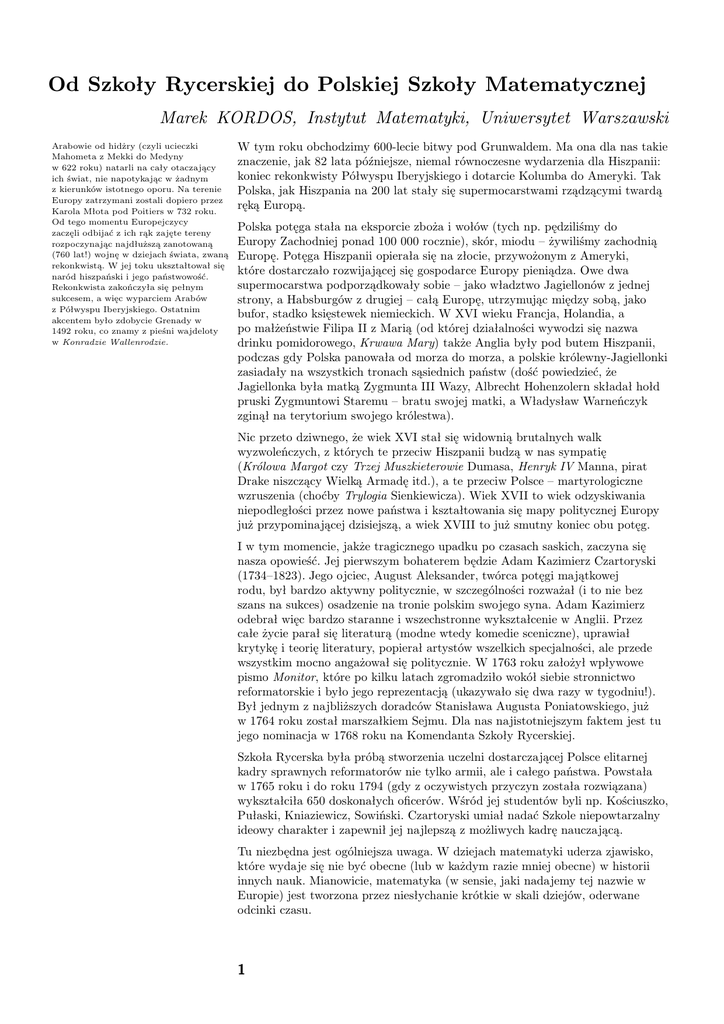 Od Szkoły Rycerskiej do Polskiej Szkoły Matematycznej Marek KORDOS, Instytut Matematyki, Uniwersytet Warszawski Arabowie od hidżry (czyli ucieczki Mahometa z Mekki do Medyny w 622 roku) natarli na cały otaczający ich świat, nie napotykając w żadnym z kierunków istotnego oporu. Na terenie Europy zatrzymani zostali dopiero przez Karola Młota pod Poitiers w 732 roku. Od tego momentu Europejczycy zaczęli odbijać z ich rąk zajęte tereny rozpoczynając najdłuższą zanotowaną (760 lat!) wojnę w dziejach świata, zwaną rekonkwistą. W jej toku ukształtował się naród hiszpański i jego państwowość. Rekonkwista zakończyła się pełnym sukcesem, a więc wyparciem Arabów z Półwyspu Iberyjskiego. Ostatnim akcentem było zdobycie Grenady w 1492 roku, co znamy z pieśni wajdeloty w Konradzie Wallenrodzie. W tym roku obchodzimy 600-lecie bitwy pod Grunwaldem. Ma ona dla nas takie znaczenie, jak 82 lata późniejsze, niemal równoczesne wydarzenia dla Hiszpanii: koniec rekonkwisty Półwyspu Iberyjskiego i dotarcie Kolumba do Ameryki. Tak Polska, jak Hiszpania na 200 lat stały się supermocarstwami rządzącymi twardą ręką Europą. Polska potęga stała na eksporcie zboża i wołów (tych np. pędziliśmy do Europy Zachodniej ponad 100 000 rocznie), skór, miodu – żywiliśmy zachodnią Europę. Potęga Hiszpanii opierała się na złocie, przywożonym z Ameryki, które dostarczało rozwijającej się gospodarce Europy pieniądza. Owe dwa supermocarstwa podporządkowały sobie – jako władztwo Jagiellonów z jednej strony, a Habsburgów z drugiej – całą Europę, utrzymując między sobą, jako bufor, stadko księstewek niemieckich. W XVI wieku Francja, Holandia, a po małżeństwie Filipa II z Marią (od której działalności wywodzi się nazwa drinku pomidorowego, Krwawa Mary) także Anglia były pod butem Hiszpanii, podczas gdy Polska panowała od morza do morza, a polskie królewny-Jagiellonki zasiadały na wszystkich tronach sąsiednich państw (dość powiedzieć, że Jagiellonka była matką Zygmunta III Wazy, Albrecht Hohenzolern składał hołd pruski Zygmuntowi Staremu – bratu swojej matki, a Władysław Warneńczyk zginął na terytorium swojego królestwa). Nic przeto dziwnego, że wiek XVI stał się widownią brutalnych walk wyzwoleńczych, z których te przeciw Hiszpanii budzą w nas sympatię (Królowa Margot czy Trzej Muszkieterowie Dumasa, Henryk IV Manna, pirat Drake niszczący Wielką Armadę itd.), a te przeciw Polsce – martyrologiczne wzruszenia (choćby Trylogia Sienkiewicza). Wiek XVII to wiek odzyskiwania niepodległości przez nowe państwa i kształtowania się mapy politycznej Europy już przypominającej dzisiejszą, a wiek XVIII to już smutny koniec obu potęg. I w tym momencie, jakże tragicznego upadku po czasach saskich, zaczyna się nasza opowieść. Jej pierwszym bohaterem będzie Adam Kazimierz Czartoryski (1734–1823). Jego ojciec, August Aleksander, twórca potęgi majątkowej rodu, był bardzo aktywny politycznie, w szczególności rozważał (i to nie bez szans na sukces) osadzenie na tronie polskim swojego syna. Adam Kazimierz odebrał więc bardzo staranne i wszechstronne wykształcenie w Anglii. Przez całe życie parał się literaturą (modne wtedy komedie sceniczne), uprawiał krytykę i teorię literatury, popierał artystów wszelkich specjalności, ale przede wszystkim mocno angażował się politycznie. W 1763 roku założył wpływowe pismo Monitor, które po kilku latach zgromadziło wokół siebie stronnictwo reformatorskie i było jego reprezentacją (ukazywało się dwa razy w tygodniu!). Był jednym z najbliższych doradców Stanisława Augusta Poniatowskiego, już w 1764 roku został marszałkiem Sejmu. Dla nas najistotniejszym faktem jest tu jego nominacja w 1768 roku na Komendanta Szkoły Rycerskiej. Szkoła Rycerska była próbą stworzenia uczelni dostarczającej Polsce elitarnej kadry sprawnych reformatorów nie tylko armii, ale i całego państwa. Powstała w 1765 roku i do roku 1794 (gdy z oczywistych przyczyn została rozwiązana) wykształciła 650 doskonałych oficerów. Wśród jej studentów byli np. Kościuszko, Pułaski, Kniaziewicz, Sowiński. Czartoryski umiał nadać Szkole niepowtarzalny ideowy charakter i zapewnił jej najlepszą z możliwych kadrę nauczającą. Tu niezbędna jest ogólniejsza uwaga. W dziejach matematyki uderza zjawisko, które wydaje się nie być obecne (lub w każdym razie mniej obecne) w historii innych nauk. Mianowicie, matematyka (w sensie, jaki nadajemy tej nazwie w Europie) jest tworzona przez niesłychanie krótkie w skali dziejów, oderwane odcinki czasu. 1 W większych bibliotekach można znaleźć broszurki noszące tytuł Poczet wielkich matematyków polskich (lub zbliżony), gdzie wymienione są postacie właściwie z każdej epoki. Warto jednak pamiętać, iż np. Wojciech z Brudzewa (1445–1497) był na tyle odpowiedzialnym uczonym, że gdy trafił mu się student o takich zdolnościach jak Mikołaj Kopernik, dołożył wszelkich starań, by zebrać fundusze na wysłanie go do Bolonii, gdzie matematyka nie tylko była, lecz także tworzyła się. To okres od wojen perskich do wojen punickich w Starożytności, od ekspansji arabskiej do wojen krzyżowych na Bliskim Wschodzie w Średniowieczu i od XVI wieku do naszych czasów – zaznaczenie tego na liniowej osi czasu wykaże znikomość tych odcinków. Ale przecież matematyka pomiędzy tymi odcinkami nie znikała. Należy tutaj chyba przywołać rolnicze porównanie do siewu i nie tyle do zbiorów, co do spożywania darów Ziemi. Nie znamy żadnego istotnego odkrycia geometrycznego Średniowiecza, ale też nie znamy większego triumfu geometrii niż gotyk. Odkrycia matematyczne Kopernika są znikome, jak jednak głęboka musiała być jego sprawność obliczeniowa, jeśli umiał przeliczyć ptolemejski, geocentryczny układ planetarny na heliocentryczny – dziś taki trud wydaje się nam niemoż