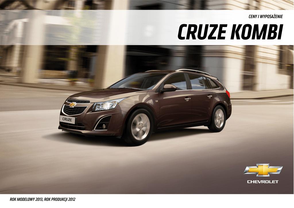 CENY I WYPOSAŻENIE CRUZE KOMBI ROK MODELOWY 2013, ROK PRODUKCJI 2012 CENY CENNIKOWE WERSJA WYPOSAŻENIA MOC MAKSYMALNA CENA LS 1.6 MT 124 KM LS+ 1.6 MT LT 124 KM 55 990 zł 1.6 MT 1.8 MT 1.4T MT 2.0TD MT 124 KM 141 KM 140 KM 163 KM LT+ 1.6 MT 1.8 MT 1.4T MT 1.7TD MT 2.0TD MT LTZ 1.8 MT 1.4T MT 2.0TD MT 2.0TD AT 59 990 zł 61 990 zł 65 990 zł 69 990 zł 124 KM 141 KM 140 KM 130 KM 163 KM 63 890 zł 65 890 zł 69 890 zł 73 890 zł 73 890 zł 141 KM 140 KM 163 KM 163 KM ELEMENTY WYPOSAŻENIA SILNIKI Bezpieczeństwo System stabilizacji toru jazdy (ESC) 6 poduszek powietrznych Wyłącznik poduszki powietrznej pasażera Odchylane zagłówki z regulacją wysokości z przodu Zabezpieczenie tylnych drzwi przed otwarciem przez dzieci System ISOFIX do mocowania fotelika dziecięcego ABS System wspomagania nagłego hamowania (BAS) System kontroli trakcji (TCS) Przednie pasy bezpieczeństwa z regulacją wysokości System odłączania pedałów podczas kolizji 51 990 zł 69 890 zł 73 890 zł 77 890 zł 83 390 zł LS LS+ LT LT+ LTZ 1.6 MT 1.6 MT 1.6 MT \ 1.8 MT \ 1.4T MT \ 2.0TD MT 1.6 MT \ 1.8 MT \ 1.4T MT \ 1.7TD MT \ 2.0TD MT 1.8 MT \ 1.4T MT \ 2.0TD MT \ 2.0TD AT ● ● ● ● ● ● ● ● ● ● ● ● ● ● ● ● ● ● ● ● ● ● ● ● ● ● ● ● ● ● ● ● ● ● ● ● ● ● ● ● ● ● ● ● ● ● ● ● ● ● ● ● ● ● ● ● seryjnie ─ niedostępny (AT) Automatyczna skrzynia biegów (MT) Manualna skrzynia biegów data publikacji 05.10.2012 2 ELEMENTY WYPOSAŻENIA SILNIKI Czujniki parkowania z tyłu Przednie reflektory przeciwmgielne Ergonomia wnętrza Oparcie tylnej kanapy składane w proporcji 60/40 6-kierunkowa manualna regulacja fotela kierowcy 6-kierunkowa manualna regulacja fotela pasażera z przodu Funkcjonalność Elektryczne szyby z przodu z funkcją szybkiego otwierania Elektryczne szyby z przodu i z tyłu oraz funkcja szybkiego otwierania/ zamykania szyby kierowcy i pasażera Pionowa regulacja kolumny kierownicy Pozioma regulacja kolumny kierownicy Tempomat LS LS+ LT LT+ LTZ 1.6 MT 1.6 MT 1.6 MT \ 1.8 MT \ 1.4T MT \ 2.0TD MT 1.6 MT \ 1.8 MT \ 1.4T MT \ 1.7TD MT \ 2.0TD MT 1.8 MT \ 1.4T MT \ 2.0TD MT \ 2.0TD AT ─ ─ ─ ─ ● ● ● ● ● ● ● ● ● Systemy audio i komunikacji Głośniki Port USB System bezprzewodowego połączenia z telefonem - bluetooth Radioodtwarzacz CD/MP3 Złącze AUX-IN do podłączania urządzeń zewnętrznych Kamera cofania System MyLink - dotykowy kolorowy wyświetlacz Nawigacja GPS w jęz. polskim, odtwarzacz CD / MP3 (wyklucza się z systemem MyLink) Sterowanie radiem w kole kierownicy Wyposażenie wnętrza Zapalniczka i popielniczka z przodu Schowek na okulary Komputer pokładowy ● ● ● ● ● ● ● ─ ─ ─ ─ ─ ● ● ● ● ─ ─ ● ─ ─ Elektrycznie regulowane lusterka zewnętrzne, podgrzewane, składane manualnie ● ● ● ─ ─ ─ ● ● ● Elektrycznie regulowane lusterka zewnętrzne, podgrzewane, składane manualnie ● ● ● ─\─\●\─ ─ ─ ● ● ● Elektrycznie regulowane lusterka zewnętrzne, podgrzewane, składane manualnie ● ● ● ─\─\●\●\─ ─ ─ ● ● ● Elektrycznie regulowane lusterka zewnętrzne, podgrzewane, składane manualnie ● ● ● ─ \ ● \ ─ \ 1 750 zł ● ● ● ● ● ─ ─ ─ Zestaw naprawczy koła Wycieraczka tylnej szyby Zdalnie sterowany zamek centralny System START/STOP Czujnik deszczu System bezkluczykowego otwierania i uruchamiania pojazdu ● ● ● ● Elektrycznie sterowane lusterka zewnętrzne Lusterka ● ● ● 4 głośniki ─ ─ ● ─ ─ ─ 6 głośników ● ● ● ● ─ ─ 6 głośników ● ● ● ● ─ ─ 6 głośników ● ● ─ ● ● ● 6 głośników ● ● ─ ● ● ● 3 000 zł 3 000 zł 3 000 zł 1 100 zł 1 100 zł ─ ● ● ● ● ● ─ ● ● ─ ● ● ● ● ● ● ● ● ● ● ● seryjnie ─ niedostępny (AT) Automatyczna skrzynia biegów (MT) Manualna skrzynia biegów data publikacji 05.10.2012 3 ELEMENTY WYPOSAŻENIA SILNIKI Podłokietnik środkowy ze schowkiem Gniazdo 12V w bagażniku Skórzana kierownica Gałka zmiany biegów pokryta skórą Siatka w bagażniku Elektrochromatyczne lusterko wewnętrzne Klimatyzacja / ogrzewanie Klimatyzacja manualna Klimatyzacja automatyczna Czujnik jakości powietrza (AQS) Wyposażenie zewnętrzne Lusterka zewnętrzne w kolorze nadwozia Klamki w kolorze nadwozia Przedni grill z chromowanymi elementami wykończenia Chromowane wykończenie w linii okien Lakier metalizowany Zabezpieczenia przeciwkradzieżowe Immobilizer Alarm antywłamaniowy Koła 16" stalowe z kołpakami 16" felgi ze stopów lekkich 17" felgi ze stopów lekkich 17" czarne felgi ze stopów lekkich Kolory wnętrza Tapicerka materiałowa czarno-szara Tapicerka materiałowa czarna Tapicerka materiałowa / skóra ekologiczna SILNIKI WERSJA WYPOSAŻENIA Rodzaj paliwa Pojemność silnika Skrzynia biegów Moc maksymalna LS LS+ LT LT+ LTZ 1.6 MT 1.6 MT 1.6 MT \ 1.8 MT \ 1.4T MT \ 2.0TD MT 1.6 MT \ 1.8 MT \ 1.4T MT \ 1.7TD MT \ 2.0TD MT 1.8 MT \ 1.4T MT \ 2.0TD MT \ 2.0TD AT ─ ● ─ ─ ─ ─ ─ ● ─ ─ ─ ─ ● ● ● ● ● ─ ● ● ● ● ● ─ ● ● ● ● ● ● ─ ─ ─ ● ─ ─ ● ─ ─ ─ ─ ─ ─ 1 900 zł ● ● ─ ─ 1 900 zł ● ● ● ● ● 1 200 zł ─ ─ ● ─ ─ ─ ● ─ 1 200 zł ● ─ ─ ● ● ● ● 1 900 zł ● ● ● ─ ─ ─ ● ● ● ─ 1 900 zł ● 800 zł ● ─ ─ ─ ─ ● ● ● ● ● ─ 1 900 zł ● 800 zł ─ ● ● ─ ─ ● 0 zł ─ ● ─ ─ ● ─ ─ ─ ● 1.6 MT 1.8 MT 1.4T MT 2.0TD MT 1.7TD MT LS \ LS+ \ LT \ LT+ LT \ LT+ \ LTZ LT \ LT+ \ LTZ LT \ LT+ \ LTZ LT+ 2.0TD AT LTZ Benzyna 1598 ccm Manualna 5-biegowa 124KM/91kW@6200obr./min Benzyna 1796 ccm Manualna 5-biegowa 141KM/104kW@6200obr./min Benzyna 1364 ccm Manualna 6-biegowa 140KM/103kW@6000obr./min Diesel 1998 ccm Manualna 6-biegowa 163KM/120kW@38