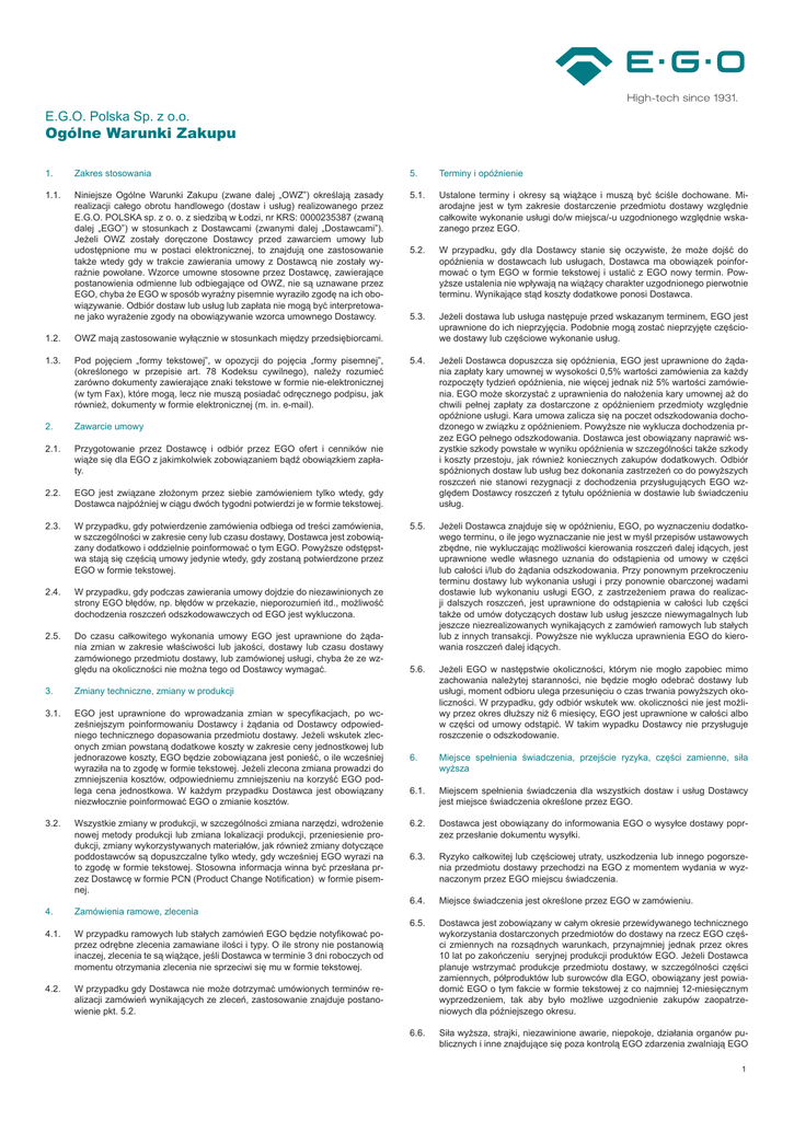 E.G.O. Polska Sp. z o.o. Ogólne Warunki Zakupu 1. Zakres stosowania 5. Terminy i opóźnienie 1.1. Niniejsze Ogólne Warunki Zakupu (zwane dalej „OWZ”) określają zasady realizacji całego obrotu handlowego (dostaw i usług) realizowanego przez E.G.O. POLSKA sp. z o. o. z siedzibą w Łodzi, nr KRS: 0000235387 (zwaną dalej „EGO”) w stosunkach z Dostawcami (zwanymi dalej „Dostawcami”). Jeżeli OWZ zostały doręczone Dostawcy przed zawarciem umowy lub udostępnione mu w postaci elektronicznej, to znajdują one zastosowanie także wtedy gdy w trakcie zawierania umowy z Dostawcą nie zostały wyraźnie powołane. Wzorce umowne stosowne przez Dostawcę, zawierające postanowienia odmienne lub odbiegające od OWZ, nie są uznawane przez EGO, chyba że EGO w sposób wyraźny pisemnie wyraziło zgodę na ich obowiązywanie. Odbiór dostaw lub usług lub zapłata nie mogą być interpretowane jako wyrażenie zgody na obowiązywanie wzorca umownego Dostawcy. 5.1. Ustalone terminy i okresy są wiążące i muszą być ściśle dochowane. Miarodajne jest w tym zakresie dostarczenie przedmiotu dostawy względnie całkowite wykonanie usługi do/w miejsca/-u uzgodnionego względnie wskazanego przez EGO. 5.2. W przypadku, gdy dla Dostawcy stanie się oczywiste, że może dojść do opóźnienia w dostawcach lub usługach, Dostawca ma obowiązek poinformować o tym EGO w formie tekstowej i ustalić z EGO nowy termin. Powyższe ustalenia nie wpływają na wiążący charakter uzgodnionego pierwotnie terminu. Wynikające stąd koszty dodatkowe ponosi Dostawca. 5.3. Jeżeli dostawa lub usługa następuje przed wskazanym terminem, EGO jest uprawnione do ich nieprzyjęcia. Podobnie mogą zostać nieprzyjęte częściowe dostawy lub częściowe wykonanie usług. 5.4. Jeżeli Dostawca dopuszcza się opóźnienia, EGO jest uprawnione do żądania zapłaty kary umownej w wysokości 0,5% wartości zamówienia za każdy rozpoczęty tydzień opóźnienia, nie więcej jednak niż 5% wartości zamówienia. EGO może skorzystać z uprawnienia do nałożenia kary umownej aż do chwili pełnej zapłaty za dostarczone z opóźnieniem przedmioty względnie opóźnione usługi. Kara umowa zalicza się na poczet odszkodowania dochodzonego w związku z opóźnieniem. Powyższe nie wyklucza dochodzenia przez EGO pełnego odszkodowania. Dostawca jest obowiązany naprawić wszystkie szkody powstałe w wyniku opóźnienia w szczególności także szkody i koszty przestoju, jak również koniecznych zakupów dodatkowych. Odbiór spóźnionych dostaw lub usług bez dokonania zastrzeżeń co do powyższych roszczeń nie stanowi rezygnacji z dochodzenia przysługujących EGO względem Dostawcy roszczeń z tytułu opóźnienia w dostawie lub świadczeniu usług. 5.5. Jeżeli Dostawca znajduje się w opóźnieniu, EGO, po wyznaczeniu dodatkowego terminu, o ile jego wyznaczanie nie jest w myśl przepisów ustawowych zbędne, nie wykluczając możliwości kierowania roszczeń dalej idących, jest uprawnione wedle własnego uznania do odstąpienia od umowy w części lub całości i/lub do żądania odszkodowania. Przy ponownym przekroczeniu terminu dostawy lub wykonania usługi i przy ponownie obarczonej wadami dostawie lub wykonaniu usługi EGO, z zastrzeżeniem prawa do realizacji dalszych roszczeń, jest uprawnione do odstąpienia w całości lub części także od umów dotyczących dostaw lub usług jeszcze niewymagalnych lub jeszcze niezrealizowanych wynikających z zamówień ramowych lub stałych lub z innych transakcji. Powyższe nie wyklucza uprawnienia EGO do kierowania roszczeń dalej idących. 5.6. Jeżeli EGO w następstwie okoliczności, którym nie mogło zapobiec mimo zachowania należytej staranności, nie będzie mogło odebrać dostawy lub usługi, moment odbioru ulega przesunięciu o czas trwania powyższych okoliczności. W przypadku, gdy odbiór wskutek ww. okoliczności nie jest możliwy przez okres dłuższy niż 6 miesięcy, EGO jest uprawnione w całości albo w części od umowy odstąpić. W takim wypadku Dostawcy nie przysługuje roszczenie o odszkodowanie. 6. Miejsce spełnienia świadczenia, przejście ryzyka, części zamienne, siła wyższa 6.1. Miejscem spełnienia świadczenia dla wszystkich dostaw i usług Dostawcy jest miejsce świadczenia określone przez EGO. 6.2. Dostawca jest obowiązany do informowania EGO o wysyłce dostawy poprzez przesłanie dokumentu wysyłki. 6.3. Ryzyko całkowitej lub częściowej utraty, uszkodzenia lub innego pogorszenia przedmiotu dostawy przechodzi na EGO z momentem wydania w wyznaczonym przez EGO miejscu świadczenia. 6.4. Miejsce świadczenia jest określone przez EGO w zamówieniu. 6.5. Dostawca jest zobowiązany w całym okresie przewidywanego technicznego wykorzystania dostarczonych przedmiotów do dostawy na rzecz EGO części zmiennych na rozsądnych warunkach, przynajmniej jednak przez okres 10 lat po zakończeniu seryjnej produkcji produktów EGO. Jeżeli Dostawca planuje wstrzymać produkcje przedmiotu dostawy, w szczególności części zamiennych, półproduktów lub surowców dla EGO, obowiązany jest powiadomić EGO o tym fakcie w formie tekstowej z co najmniej 12-miesięcznym wyprzedzeniem, tak aby było możliwe uzgodnienie zakupów zaopatrzeniowych dla późniejszego okresu. 6.6. Siła wyższa, strajki, niezawinione awarie, niepokoje, działania organów publicznych i inne znajdujące się poza kontrolą EGO zdarzenia zwalniają EGO 1.2. OWZ mają zastosowanie wyłącznie w stosunkach między przedsiębiorcami. 1.3. Pod pojęciem „formy tekstowej”, w opozycji do pojęcia „formy pisemnej”, (określonego w przepisie art. 78 Kodeksu cywilnego), należy rozumieć zarówno dokumenty zawierające znaki tekstowe w formie nie-elektronicznej (w tym Fax), które mogą, lecz nie muszą posiadać odręcznego podpisu, jak również, dokumenty w formie elektronicznej (m. in. e-mail). 2. Zawarcie umowy 2.1. Przygotowanie przez Dostawcę i odb