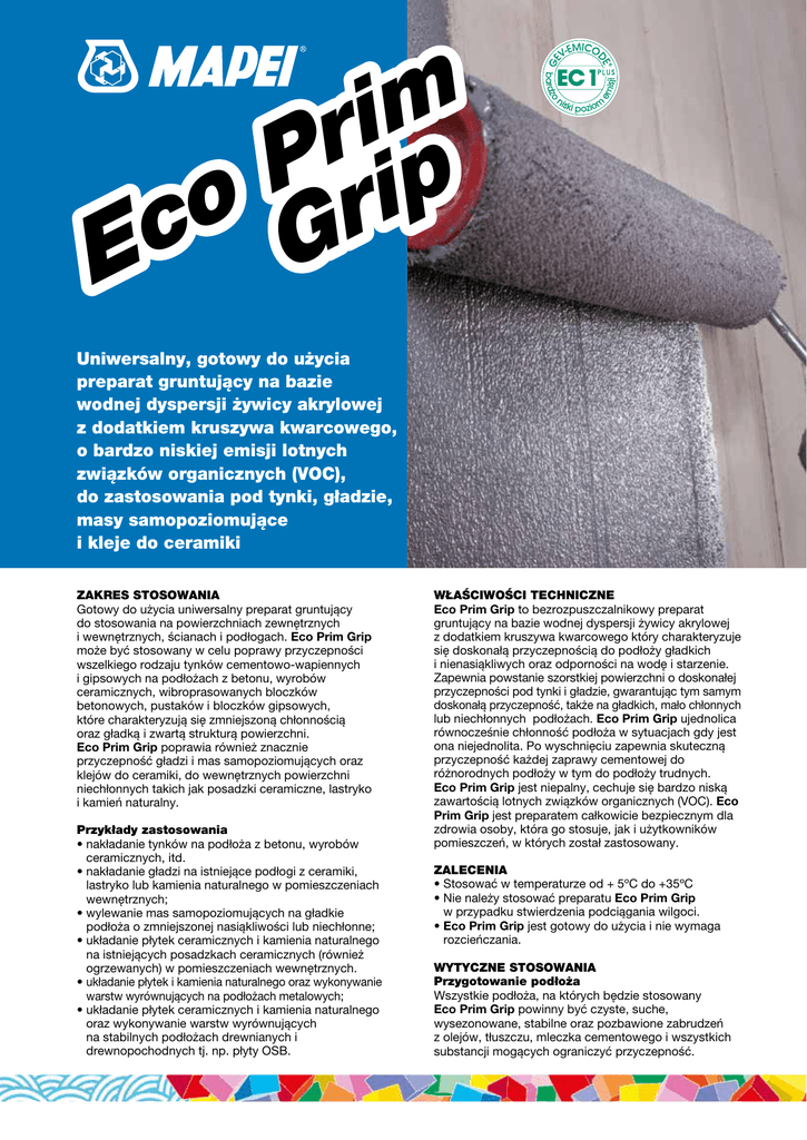 m i r P p i o c Gr E Uniwersalny, gotowy do użycia preparat gruntujący na bazie wodnej dyspersji żywicy akrylowej z dodatkiem kruszywa kwarcowego, o bardzo niskiej emisji lotnych związków organicznych (VOC), do zastosowania pod tynki, gładzie, masy samopoziomujące i kleje do ceramiki ZAKRES STOSOWANIA Gotowy do użycia uniwersalny preparat gruntujący do stosowania na powierzchniach zewnętrznych i wewnętrznych, ścianach i podłogach. Eco Prim Grip może być stosowany w celu poprawy przyczepności wszelkiego rodzaju tynków cementowo-wapiennych i gipsowych na podłożach z betonu, wyrobów ceramicznych, wibroprasowanych bloczków betonowych, pustaków i bloczków gipsowych, które charakteryzują się zmniejszoną chłonnością oraz gładką i zwartą strukturą powierzchni. Eco Prim Grip poprawia również znacznie przyczepność gładzi i mas samopoziomujących oraz klejów do ceramiki, do wewnętrznych powierzchni niechłonnych takich jak posadzki ceramiczne, lastryko i kamień naturalny. Przykłady zastosowania • nakładanie tynków na podłoża z betonu, wyrobów ceramicznych, itd. • nakładanie gładzi na istniejące podłogi z ceramiki, lastryko lub kamienia naturalnego w pomieszczeniach wewnętrznych; • wylewanie mas samopoziomujących na gładkie podłoża o zmniejszonej nasiąkliwości lub niechłonne; • układanie płytek ceramicznych i kamienia naturalnego na istniejących posadzkach ceramicznych (również ogrzewanych) w pomieszczeniach wewnętrznych. • układanie płytek i kamienia naturalnego oraz wykonywanie warstw wyrównujących na podłożach metalowych; •u kładanie płytek ceramicznych i kamienia naturalnego oraz wykonywanie warstw wyrównujących na stabilnych podłożach drewnianych i drewnopochodnych tj. np. płyty OSB. WŁAŚCIWOŚCI TECHNICZNE Eco Prim Grip to bezrozpuszczalnikowy preparat gruntujący na bazie wodnej dyspersji żywicy akrylowej z dodatkiem kruszywa kwarcowego który charakteryzuje się doskonałą przyczepnością do podłoży gładkich i nienasiąkliwych oraz odporności na wodę i starzenie. Zapewnia powstanie szorstkiej powierzchni o doskonałej przyczepności pod tynki i gładzie, gwarantując tym samym doskonałą przyczepność, także na gładkich, mało chłonnych lub niechłonnych podłożach. Eco Prim Grip ujednolica równocześnie chłonność podłoża w sytuacjach gdy jest ona niejednolita. Po wyschnięciu zapewnia skuteczną przyczepność każdej zaprawy cementowej do różnorodnych podłoży w tym do podłoży trudnych. Eco Prim Grip jest niepalny, cechuje się bardzo niską zawartością lotnych związków organicznych (VOC). Eco Prim Grip jest preparatem całkowicie bezpiecznym dla zdrowia osoby, która go stosuje, jak i użytkowników pomieszczeń, w których został zastosowany. ZALECENIA • Stosować w temperaturze od + 5ºC do +35ºC • Nie należy stosować preparatu Eco Prim Grip w przypadku stwierdzenia podciągania wilgoci. • Eco Prim Grip jest gotowy do użycia i nie wymaga rozcieńczania. WYTYCZNE STOSOWANIA Przygotowanie podłoża Wszystkie podłoża, na których będzie stosowany Eco Prim Grip powinny być czyste, suche, wysezonowane, stabilne oraz pozbawione zabrudzeń z olejów, tłuszczu, mleczka cementowego i wszystkich substancji mogących ograniczyć przyczepność. im r P ip o r Ec G Nakładanie Eco Prim Grip wałkiem na powierzchnię betonową DANE TECHNICZNE WŁAŚCIWOŚCI PRODUKTU Postać: kremowa ciecz Kolor: szary Gęstość objętościowa: 1,51 g/cm3 pH: 8,5 Zawartość ciał stałych: 72% Lepkość wg Brookfield’a: 3.000 mPa•s (wirnik - 4-20 obr/min.) EMICODE: EC1PLUS- bardzo niska emisja lotnych związków organicznych PARAMETRY UŻYTKOWE (w temp. + 23ºC i 50% wilgotności względnej) Nakładanie Eco Prim Grip pędzlem na powierzchnię betonową Nanoszenie tynku na Eco Prim Grip Temperatura stosowania: od +5ºC do +35ºC Czas oczekiwania przed nakładaniem tynku: 15 - 20 minut (w zależności od temperatury i porowatości podłoża) Czas oczekiwania przed nakładaniem gładzi: 30 minut (w zależności od temperatury i porowatości podłoża) PARAMETRY KOŃCOWE Odporność na wilgoć: doskonała Odporność na starzenie: doskonała Odporność na rozpuszczalniki i oleje: umiarkowana Odporność na kwasy i alkalia: umiarkowana Odporność na temperaturę: doskonała Aplikacja Preparat gruntujący Eco Prim Grip należy nanosić na podłoże przy pomocy wałka, pędzla lub metodą natryskową. Po wyschnięciu preparatu Eco Prim Grip można przystąpić do nakładania tynku, gładzi, masy samopoziomującej lub zaprawy klejowej. Czas wysychania preparatu jest uzależniony od temperatury i wilgotności powietrza oraz rodzaju podłoża i wynosi od 15 do 60 minut. W razie potrzeby można nałożyć drugą warstwę Eco Prim Grip nawet po bardzo długim czasie. CZYSZCZENIE Dopóki Eco Prim Grip jest świeży i niezaschnięty, może być usuwany z podłóg, okładzin i narzędzi wodą. Po wyschnięciu można go usunąć za pomocą alkoholu lub przy użyciu preparatu Pulicol 2000. ZUŻYCIE Zużycie waha się od 0,20 do 0,30 kg/m2 w zależności od chłonności podłoża OPAKOWANIA Eco Prim Grip jest dostępny w 5 i 10 kg wiaderkach. PRZECHOWYWANIE Eco Prim Grip może być przechowywany przez 24 miesiące w oryginalnie zamkniętych opakowaniach i w suchym miejscu. Nie przechowywać w ujemnych temperaturach. ŚRODKI OSTROŻNOŚCI I BEZPIECZEŃSTWA Eco Prim Grip nie jest klasyfikowany jako niebezpieczny zgodnie z aktualnymi przepisami dotyczącymi klasyfikacji mieszanin. Zaleca się używanie rękawic i okularów ochronnych oraz zachowanie zwyczajowych środków ostrożności jak przy obchodzeniu się z produktami chemicznymi. Więcej informacji na temat bezpiecznego stosowania produktu znajduje się w najnowszej wersji karty charakterystyki. PRODUKT DLA PROFESJONALISTÓW. UWAGI Powyższe dane należy traktować wyłącznie jako ogólne wskazówki. Niezależne od nas warunki pracy i r