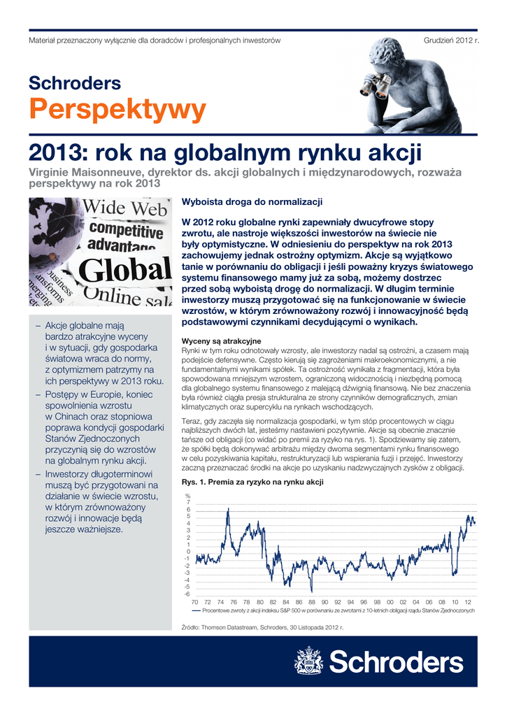Materiał przeznaczony wyłącznie dla doradców i profesjonalnych inwestorów Grudzień 2012 r. Schroders Perspektywy 2013: rok na globalnym rynku akcji Virginie Maisonneuve, dyrektor ds. akcji globalnych i międzynarodowych, rozważa perspektywy na rok 2013 Wyboista droga do normalizacji – Akcje globalne mają bardzo atrakcyjne wyceny i w sytuacji, gdy gospodarka światowa wraca do normy, z optymizmem patrzymy na ich perspektywy w 2013 roku. – Postępy w Europie, koniec spowolnienia wzrostu w Chinach oraz stopniowa poprawa kondycji gospodarki Stanów Zjednoczonych przyczynią się do wzrostów na globalnym rynku akcji. – Inwestorzy długoterminowi muszą być przygotowani na działanie w świecie wzrostu, w którym zrównoważony rozwój i innowacje będą jeszcze ważniejsze. W 2012 roku globalne rynki zapewniały dwucyfrowe stopy zwrotu, ale nastroje większości inwestorów na świecie nie były optymistyczne. W odniesieniu do perspektyw na rok 2013 zachowujemy jednak ostrożny optymizm. Akcje są wyjątkowo tanie w porównaniu do obligacji i jeśli poważny kryzys światowego systemu finansowego mamy już za sobą, możemy dostrzec przed sobą wyboistą drogę do normalizacji. W długim terminie inwestorzy muszą przygotować się na funkcjonowanie w świecie wzrostów, w którym zrównoważony rozwój i innowacyjność będą podstawowymi czynnikami decydującymi o wynikach. Wyceny są atrakcyjne Rynki w tym roku odnotowały wzrosty, ale inwestorzy nadal są ostrożni, a czasem mają podejście defensywne. Często kierują się zagrożeniami makroekonomicznymi, a nie fundamentalnymi wynikami spółek. Ta ostrożność wynikała z fragmentacji, która była spowodowana mniejszym wzrostem, ograniczoną widocznością i niezbędną pomocą dla globalnego systemu finansowego z malejącą dźwignią finansową. Nie bez znaczenia była również ciągła presja strukturalna ze strony czynników demograficznych, zmian klimatycznych oraz supercyklu na rynkach wschodzących. Teraz, gdy zaczęła się normalizacja gospodarki, w tym stóp procentowych w ciągu najbliższych dwóch lat, jesteśmy nastawieni pozytywnie. Akcje są obecnie znacznie tańsze od obligacji (co widać po premii za ryzyko na rys. 1). Spodziewamy się zatem, że spółki będą dokonywać arbitrażu między dwoma segmentami rynku finansowego w celu pozyskiwania kapitału, restrukturyzacji lub wspierania fuzji i przejęć. Inwestorzy zaczną przeznaczać środki na akcje po uzyskaniu nadzwyczajnych zysków z obligacji. Rys. 1. Premia za ryzyko na rynku akcji % 7 6 5 4 3 2 1 0 -1 -2 -3 -4 -5 -6 70 72 74 76 78 80 82 84 86 88 90 92 94 96 98 00 02 04 06 08 10 12 Procentowe zwroty z akcji indeksu S&P 500 w porównaniu ze zwrotami z 10-letnich obligacji rządu Stanów Zjednoczonych Źródło: Thomson Datastream, Schroders, 30 Listopada 2012 r. Perspektywy na rok 2013: rok na globalnym rynku akcji „Przywódcy państw oraz ekonomiści zmieniają nieco ton wypowiedzi, popierając raczej działania sprzyjające wzrostowi bez zagrażania postępowi, który dokonał się przez ostatnie dwa lata”. Czy Europa zbliża się do przełomu? W tym roku w Europie było niewiele dobrych wiadomości. Z punktu widzenia dyscypliny fiskalnej ten rok był bardzo trudny i miała ona wpływ na wzrost: Europa jest oficjalnie w recesji, a MFW przewiduje spadek PKB o 0,4% w tym roku. Poczyniono jednak znaczne postępy w rozwiązywaniu kryzysu zadłużenia. Sytuacja gospodarcza na peryferiach Europy pozostaje bardzo trudna, ale większość krajów wprowadza rozwiązania długoterminowych problemów strukturalnych. Z kolei krótkoterminowa presja na rynki jest łagodzona przez wyjątkowe zdarzenia polityczne. „Nowy przywódca Chin jest pragmatycznym dyplomatą i druga największa gospodarka świata może dzięki niemu uzyskać bardziej znaczącą rolę geopolityczną, która bardziej odpowiada potencjałowi ekonomicznemu Chin”. Zachęcające jest, że w roku 2012 oszczędności w Europie były prawdopodobnie maksymalne, co byłoby dobrym sygnałem na 2013 r. Przywódcy państw oraz ekonomiści zmieniają nieco ton wypowiedzi, popierając raczej działania sprzyjające wzrostowi bez zagrażania postępowi, który dokonał się przez ostatnie dwa lata. W ujęciu bezwzględnym polityka fiskalna w regionie zacieśni się w 2013 r., ale tempo konsolidacji fiskalnej prawdopodobnie zmaleje i najważniejsze stanie się zaradzenie deficytom strukturalnym, a nie poprawa najbardziej widocznych parametrów. „Inwestorzy mają wiele możliwości do wyboru, jednak może się okazać konieczna zmiana nastawienia w stosunku do tego z minionej dekady”. Irlandia radzi sobie z problemami sektora bankowego, istotnie zmniejszając deficyt i uzyskując umiarkowany wzrost. Równowaga fiskalna w Portugalii również się poprawia i kraj ten, podobnie jak Hiszpania, rozwiązuje problemy z konkurencyjnością. Przyszłość jest nadal niepewna, ale Portugalia skorzysta na ogólnym politycznym poparciu dla reform. Grecja osiąga porozumienie z wierzycielami szybciej, niż się spodziewano, a prawdopodobieństwo opuszczenia przez nią strefy euro — choć nie jest jeszcze zerowe — znacznie zmalało przez ostatnie pół roku. Ostatnio Grecja odnotowała nadwyżki na rachunku bieżącym przez trzy miesiące z rzędu. To poważne osiągnięcie, które wskazuje, że kontrowersyjne podejście oparte na oszczędnościach może jednak działać! Nie wszędzie tak się dzieje. Prezydent Francji podkreślił, jak ważne są inicjatywy na rzecz wzrostu, ale jego wrześniowy budżet przewiduje pokrycie 2/3 wynoszącego 30 mld euro deficytu przez podnoszenie podatków, zwłaszcza w odniesieniu do dużych przedsiębiorstw. Wywarło to już wpływ na aktywność gospodarczą i zaufanie przedsiębiorców, a jednocześnie nie pomogło rozwiązać problemu spadającej od dziesięciu lat konkurencyjności Francji. Raport Louisa Gallois, znanego francuskiego przemysłowca, wyra