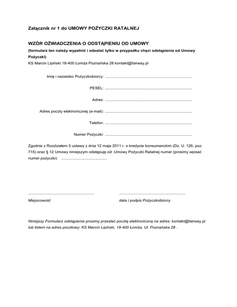 Załącznik nr 1 do UMOWY POŻYCZKI RATALNEJ WZÓR OŹWIADCZENIA O ODSTĄPIENIU OD UMOWY (formularz ten należy wypełnić i odesłać tylko w przypadku chęci odstąpienia od Umowy Pożyczki) KS Marcin Lipiński 18-400 Łomża Poznańska 28 [email protected] Imię i nazwisko Pożyczkobiorcy: ............................................................................... PESEL: ............................................................................... Adres: ............................................................................... Adres poczty elektronicznej (e-mail): ............................................................................... Telefon: ............................................................................... Numer Pożyczki: ............................................................................... Zgodnie z Rozdziałem 5 ustawy z dnia 12 maja 2011 r. o kredycie konsumenckim (Dz. U. 126, poz. 715) oraz § 12 Umowy niniejszym odstępuję od: Umowy Pożyczki Ratalnej numer (prosimy wpisać numer pożyczki) ......................................... ............................................................ ............................................................ Miejscowość data i podpis Pożyczkobiorcy Niniejszy Formularz odstąpienia prosimy przesłać pocztą elektroniczną na adres: [email protected] lub listem na adres pocztowy: KS Marcin Lipiński, 18-400 Łomża, Ul. Poznańska 28 . REGULAMIN POŻYCZKI RATALNEJ FAIRWAY.PL Obowiązuje od dnia: 01.07.2015 r. 1 Definicje Użyte w Regulaminie, Umowie Pożyczki Ratalnej oraz w korespondencji pomiędzy stronami Umowy określenia oznaczają: 1. Biura Informacji Gospodarczej oznacza Biuro Informacji Gospodarczej InfoMonitor S.A., Krajowy Rejestr Długów Biuro Informacji Gospodarczej S.A., Rejestr Dłużników ERIF Biuro Informacji Gospodarczej S.A., Krajowe Biuro Informacji Gospodarczej S.A., działające na podstawie ustawy z dnia 9 kwietnia 2010 r. o udostępnianiu informacji gospodarczych i wymianie danych gospodarczych (Dz. U. z 2010 r., Nr 81, poz. 530 z późn. zm.) 2. Biuro Informacji Kredytowej oznacza Biuro Informacji Kredytowej S.A. z siedzibą w Warszawie; instytucję powołaną w 1997 r. przez banki i Związek Banków Polskich na mocy art. 105 ust 4 ustawy z dnia 29 sierpnia 1997 r. Prawo Bankowe (Dz. U. Nr 140 poz.939 z późn. zmianami) 3. Dział Obsługi Klienta oznacza Departament Obsługi Klienta dostępny pod numerem +48 518 266 300 (opłata za połączenie zgodna z taryfą operatora telekomunikacyjnego Pożyczkobiorcy) oraz adresem e-mail: [email protected] 4. Pożyczka oznacza Pożyczkę Ratalną i stanowi środki pieniężne przekazywane na podstawie i na warunkach określonych w Umowie Pożyczkobiorcy przez Pożyczkodawcę 1 5. Pożyczkobiorca oznacza osobę fizyczną, będącą konsumentem według art. 22 KC, która spełnia warunki przyznania Pożyczki określone w Umowie oraz Regulaminie i której Pożyczkodawca udziela Pożyczki na podstawie Umowy i która zawiera Umowę w celu niezwiązanym bezpośrednio z jej działalnością gospodarczą lub zawodową 6. Pożyczkodawca oznacza KS Marcin Lipiński z siedzibą w Łomży przy ulicy Poznańskiej 28, NIP 718-001-33-14 7. Profil Klienta oznacza indywidualne konto internetowe założone przez Pożyczkobiorcę na Stronie Internetowej z chwilą prawidłowego wypełnienia i złożenia pierwszego Wniosku o Pożyczkę 8. Prowizja oznacza Prowizję za udzielenie Pożyczki lub podwyższenie kwoty Pożyczki i stanowi koszt udzielenia Pożyczki, który Pożyczkobiorca zobowiązany jest ponieść w wysokości podanej w Umowie, kwota Prowizji jest doliczana przez Pożyczkodawcę do kwoty Pożyczki; Pożyczkodawca zachowuje prawo do udzielenia Pożyczki bez naliczenia Prowizji lub udzielenia okresowych rabatów 9. Prowizja za Przesunięcie terminu spłaty raty Pożyczki oznacza koszt, jaki obowiązany jest ponieść Pożyczkobiorca z tytułu zmiany terminu spłaty raty Pożyczki ustalonej w Harmonogramie 10. Rachunek Bankowy Pożyczkobiorcy oznacza rachunek bankowy Pożyczkobiorcy, którego Pożyczkobiorca jest posiadaczem, prowadzony przez bank działający na terytorium Rzeczpospolitej Polskiej, z którego została dokonana opłata rejestracyjna Pożyczkobiorcy i na który, zgodnie z warunkami Umowy, Pożyczkodawca przelewa kwotę Pożyczki 11. Rachunek Bankowy Pożyczkodawcy oznacza rachunek bankowy Pożyczkodawcy, na który Pożyczkobiorca zobowiązany jest spłacić Pożyczkę wraz ze wszystkimi prowizjami i opłatami, wskazany w treści maila potwierdzającego zawarcie Umowy 12. Regulamin oznacza niniejszy Regulamin Pożyczki Ratalnej i stanowi integralną część Umowy; 13. Umowa oznacza Umowę Pożyczki Ratalnej, na podstawie, której Pożyczkodawca na wniosek Pożyczkobiorcy zobowiązuje się do przekazywania wnioskowanej przez Pożyczkobiorcę kwoty Pożyczki, na zasadach określonych w Umowie i Regulaminie 14. Strona Internetowa oznacza stronę internetową www.fairway.pl 15. Wniosek o Pożyczkę oznacza wniosek Klienta o udzielenie Pożyczki, złożony za pośrednictwem Strony Internetowej lub telefonu do Działu Obsługi Klienta i rozpatrywany przez Pożyczkodawcę, zawierający dane niezbędne do zawarcia Umowy. 2 Utworzenie Profilu Klienta na Stronie Internetowej 1. Warunkiem zawarcia Umowy oraz udzielenia Pożyczki jest uprzednie utworzenie przez Pożyczkobiorcę Profilu Klienta na Stronie Internetowej i posiadanie przez Pożyczkobiorcę aktywnego Profilu Klienta. 2. Utworzenie Profilu Klienta na Stronie Internetowej jest jednocześnie złożeniem wniosku o zawarcie Umowy oraz Wniosku o Pożyczkę. 3. Pożyczkobiorca zobowiązuje się podać podczas tworzenia Profilu Klienta prawdziwe dane. Podanie nieprawdziwych danych, w szczególności wprowadzających Pożyczkodawcę lub Pośrednika Kredytowego w błąd oraz skutkujących doprowadzeniem do niekorzystnego rozporządzenia mieniem Pożyczkodawcy, może rodzić odp