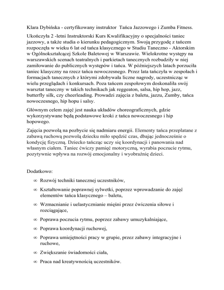 Klara Dybińska - certyfikowany instruktor Tańca Jazzowego i Zumba Fitness. Ukończyła 2 -letni Instruktorski Kurs Kwalifikacyjny o specjalności taniec jazzowy, a także studia o kierunku pedagogicznym. Swoją przygodę z tańcem rozpoczęła w wieku 6 lat od tańca klasycznego w Studiu Taneczno - Aktorskim w Ogólnokształcącej Szkole Baletowej w Warszawie. Wielokrotne występy na warszawskich scenach teatralnych i parkietach tanecznych rozbudziły w niej zamiłowanie do publicznych występów i tańca. W późniejszych latach porzuciła taniec klasyczny na rzecz tańca nowoczesnego. Przez lata tańczyła w zespołach i formacjach tanecznych z którymi zdobywała liczne nagrody, uczestnicząc w wielu przeglądach i konkursach. Poza tańcem zespołowym doskonaliła swój warsztat taneczny w takich technikach jak reggeaton, salsa, hip hop, jazz, butterfly silk, czy cheerleading. Prowadzi zajęcia z baletu, jazzu, Zumby, tańca nowoczesnego, hip hopu i salsy. Głównym celem zajęć jest nauka układów choreograficznych, gdzie wykorzystywane będą podstawowe kroki z tańca nowoczesnego i hip hopowego. Zajęcia pozwolą na pozbycie się nadmiaru energii. Elementy tańca przeplatane z zabawą ruchową pozwolą dziecku miło spędzić czas, dbając jednocześnie o kondycję fizyczną. Dziecko tańcząc uczy się koordynacji i panowania nad własnym ciałem. Taniec ćwiczy pamięć motoryczną, wyrabia poczucie rytmu, pozytywnie wpływa na rozwój emocjonalny i wyobraźnię dzieci. Dodatkowo: • Rozwój techniki tanecznej uczestników, • Kształtowanie poprawnej sylwetki, poprzez wprowadzanie do zajęć elementów tańca klasycznego – baletu, • Wzmacnianie i uelastycznianie mięśni przez ćwiczenia siłowe i rozciągające, • Poprawa poczucia rytmu, poprzez zabawy umuzykalniające, • Poprawa koordynacji ruchowej, • Poprawa umiejętności pracy w grupie, przez zabawy integracyjne i ruchowe, • Zwiększanie świadomości ciała, • Praca nad kreatywnością uczestników. Balet pozwoli dodatkowo wprowadzić w życie dziecka pojęcie „systematyczności”, gdyż każde zajęcia będą opierały się na podobnym schemacie: rozgrzewki – zabawy ruchowe, nauki ćwiczeń przy „drążku”, nauki układu ćwiczeń i rozciągania. Cele zajęć: 1. Uświadomienie, że prawidłowa postawa jest bardzo ważna 2. Ćwiczenie koordynacji ruchowej 3. Uwrażliwienie dziecka na muzykę klasyczną 4. Poznawanie wybranych terminów muzycznych 5. Zapoznanie z podstawami tańca klasycznego np.: • Pozycje klasyczne rąk i nóg • Pojęcia demi, point i flex • Plie, grand plie, releve, battements tendus, battements jettes 6. Dyscyplinowanie dziecka 7. Nauka szybkiej reakcji Na zajęcia wymagany jest swobodny strój, który nie będzie przeszkadzał dziecku w trakcie zajęć, a także taki, który pozwoli rozwijać jego samodzielność. Obuwie wygodne, mogą to być skarpetki, zwykłe tenisówki, albo baletki (zajęcia z tańca klasycznego).