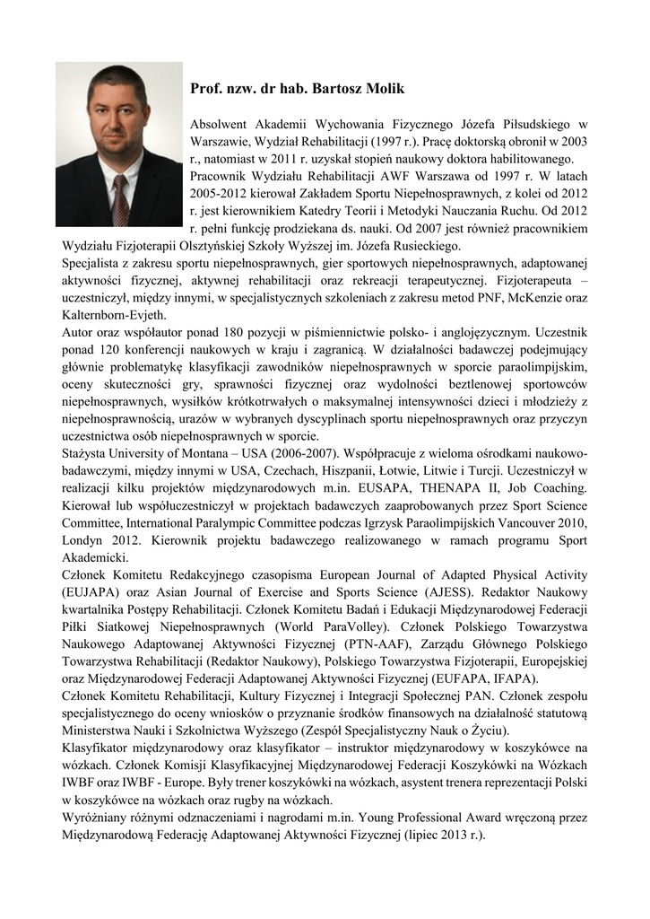 Prof. nzw. dr hab. Bartosz Molik Absolwent Akademii Wychowania Fizycznego Józefa Piłsudskiego w Warszawie, Wydział Rehabilitacji (1997 r.). Pracę doktorską obronił w 2003 r., natomiast w 2011 r. uzyskał stopień naukowy doktora habilitowanego. Pracownik Wydziału Rehabilitacji AWF Warszawa od 1997 r. W latach 2005-2012 kierował Zakładem Sportu Niepełnosprawnych, z kolei od 2012 r. jest kierownikiem Katedry Teorii i Metodyki Nauczania Ruchu. Od 2012 r. pełni funkcję prodziekana ds. nauki. Od 2007 jest również pracownikiem Wydziału Fizjoterapii Olsztyńskiej Szkoły Wyższej im. Józefa Rusieckiego. Specjalista z zakresu sportu niepełnosprawnych, gier sportowych niepełnosprawnych, adaptowanej aktywności fizycznej, aktywnej rehabilitacji oraz rekreacji terapeutycznej. Fizjoterapeuta – uczestniczył, między innymi, w specjalistycznych szkoleniach z zakresu metod PNF, McKenzie oraz Kalternborn-Evjeth. Autor oraz współautor ponad 180 pozycji w piśmiennictwie polsko- i anglojęzycznym. Uczestnik ponad 120 konferencji naukowych w kraju i zagranicą. W działalności badawczej podejmujący głównie problematykę klasyfikacji zawodników niepełnosprawnych w sporcie paraolimpijskim, oceny skuteczności gry, sprawności fizycznej oraz wydolności beztlenowej sportowców niepełnosprawnych, wysiłków krótkotrwałych o maksymalnej intensywności dzieci i młodzieży z niepełnosprawnością, urazów w wybranych dyscyplinach sportu niepełnosprawnych oraz przyczyn uczestnictwa osób niepełnosprawnych w sporcie. Stażysta University of Montana – USA (2006-2007). Współpracuje z wieloma ośrodkami naukowobadawczymi, między innymi w USA, Czechach, Hiszpanii, Łotwie, Litwie i Turcji. Uczestniczył w realizacji kilku projektów międzynarodowych m.in. EUSAPA, THENAPA II, Job Coaching. Kierował lub współuczestniczył w projektach badawczych zaaprobowanych przez Sport Science Committee, International Paralympic Committee podczas Igrzysk Paraolimpijskich Vancouver 2010, Londyn 2012. Kierownik projektu badawczego realizowanego w ramach programu Sport Akademicki. Członek Komitetu Redakcyjnego czasopisma European Journal of Adapted Physical Activity (EUJAPA) oraz Asian Journal of Exercise and Sports Science (AJESS). Redaktor Naukowy kwartalnika Postępy Rehabilitacji. Członek Komitetu Badań i Edukacji Międzynarodowej Federacji Piłki Siatkowej Niepełnosprawnych (World ParaVolley). Członek Polskiego Towarzystwa Naukowego Adaptowanej Aktywności Fizycznej (PTN-AAF), Zarządu Głównego Polskiego Towarzystwa Rehabilitacji (Redaktor Naukowy), Polskiego Towarzystwa Fizjoterapii, Europejskiej oraz Międzynarodowej Federacji Adaptowanej Aktywności Fizycznej (EUFAPA, IFAPA). Członek Komitetu Rehabilitacji, Kultury Fizycznej i Integracji Społecznej PAN. Członek zespołu specjalistycznego do oceny wniosków o przyznanie środków finansowych na działalność statutową Ministerstwa Nauki i Szkolnictwa Wyższego (Zespół Specjalistyczny Nauk o Życiu). Klasyfikator międzynarodowy oraz klasyfikator – instruktor międzynarodowy w koszykówce na wózkach. Członek Komisji Klasyfikacyjnej Międzynarodowej Federacji Koszykówki na Wózkach IWBF oraz IWBF - Europe. Były trener koszykówki na wózkach, asystent trenera reprezentacji Polski w koszykówce na wózkach oraz rugby na wózkach. Wyróżniany różnymi odznaczeniami i nagrodami m.in. Young Professional Award wręczoną przez Międzynarodową Federację Adaptowanej Aktywności Fizycznej (lipiec 2013 r.).