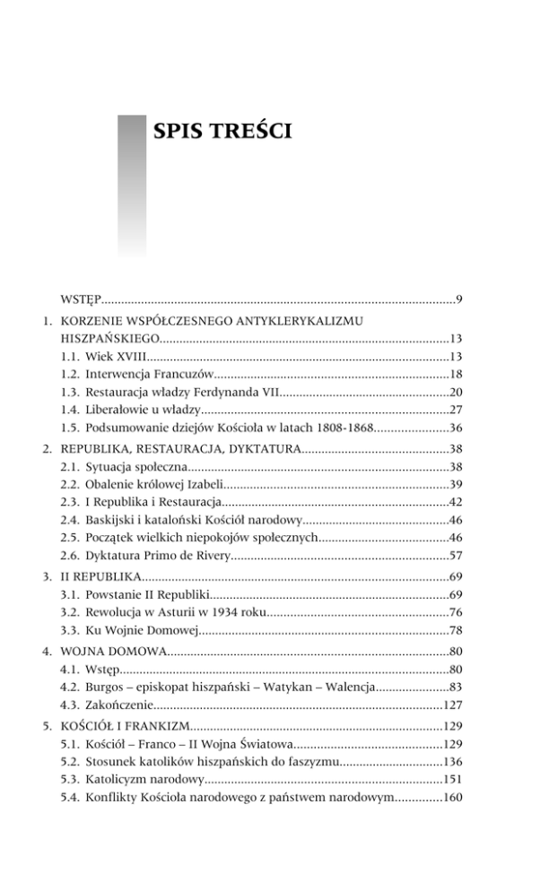 WSTĘP 5 SPIS TREŚCI WSTĘP..........................................................................................................9 1. KORZENIE WSPÓŁCZESNEGO ANTYKLERYKALIZMU HISZPAŃSKIEGO.......................................................................................13 1.1. Wiek XVIII...........................................................................................13 1.2. Interwencja Francuzów......................................................................18 1.3. Restauracja władzy Ferdynanda VII...................................................20 1.4. Liberałowie u władzy..........................................................................27 1.5. Podsumowanie dziejów Kościoła w latach 1808-1868......................36 2. REPUBLIKA, RESTAURACJA, DYKTATURA............................................38 2.1. Sytuacja społeczna..............................................................................38 2.2. Obalenie królowej Izabeli...................................................................39 2.3. I Republika i Restauracja....................................................................42 2.4. Baskijski i kataloński Kościół narodowy............................................46 2.5. Początek wielkich niepokojów społecznych.......................................46 2.6. Dyktatura Primo de Rivery.................................................................57 3. II REPUBLIKA............................................................................................69 3.1. Powstanie II Republiki........................................................................69 3.2. Rewolucja w Asturii w 1934 roku......................................................76 3.3. Ku Wojnie Domowej...........................................................................78 4. WOJNA DOMOWA....................................................................................80 4.1. Wstęp...................................................................................................80 4.2. Burgos – episkopat hiszpański – Watykan – Walencja......................83 4.3. Zakończenie.......................................................................................127 5. KOŚCIÓŁ I FRANKIZM............................................................................129 5.1. Kościół – Franco – II Wojna Światowa............................................129 5.2. Stosunek katolików hiszpańskich do faszyzmu...............................136 5.3. Katolicyzm narodowy.......................................................................151 5.4. Konflikty Kościoła narodowego z państwem narodowym..............160 6 WSTĘP 5.5. Rozwód Kościoła i państwa frankistowskiego.................................162 5.5.1. Reformy w katolickich organizacjach robotniczych i młodzieżowych. Ferment w Kraju Basków.........................163 5.5.2. Odnowa wśród intelektualistów katolickich.........................167 5.5.3. Sytuacja społeczna Kościoła...................................................168 5.6. „Zdrada” Kościoła.............................................................................170 5.6.1. Antyklerykalizm prawicowy..................................................179 5.6.2. Kontakty Kościoła z opozycją................................................182 6. TRANSICIÓN..............................................................................................189 6.1. Okres burzliwych przemian..............................................................189 6.2. Dyskusje wokół konstytucji z 1978 roku. Relacje Kościół – państwo..........................................................................................194 7. ANTYKLERYKALIZM I KLERYKALIZM CZASÓW DEMOKRACJI........201 7.1. Socjaliści u władzy............................................................................203 7.2. Katolicyzm hiszpański lat dziewięćdziesiątych................................211 ZAKOŃCZENIE........................................................................................213 ZAŁĄCZNIK DO ROZDZIAŁU 4: ANALIZA ANTROPOLOGICZNA HISZPAŃSKIEGO ANTYKLERYKALIZMU.............................................217 BIBLIOGRAFIA........................................................................................223 Źródła................................................................................................223 Archiwa........................................................................................223 Dokumenty opublikowane..........................................................223 Czasopisma...................................................................................224 Książki..........................................................................................224 Opracowania.....................................................................................226 Książki..........................................................................................226 Artykuły........................................................................................233 Inne źródła........................................................................................235 OD REDAKCJI..........................................................................................236