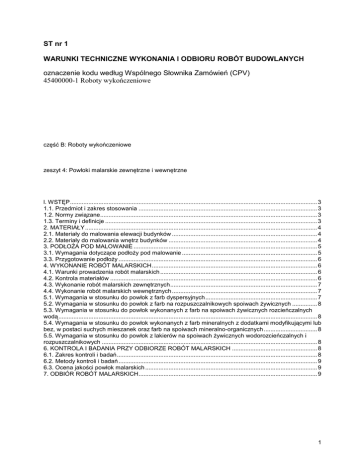 ST nr 1 WARUNKI TECHNICZNE WYKONANIA l ODBIORU ROBÓT BUDOWLANYCH oznaczenie kodu według Wspólnego Słownika Zamówień (CPV) 45400000-1 Roboty wykończeniowe część B: Roboty wykończeniowe zeszyt 4: Powłoki malarskie zewnętrzne i wewnętrzne l. WSTĘP.................................................................................................................................................... 3 1.1. Przedmiot i zakres stosowania ........................................................................................................... 3 1.2. Normy związane.................................................................................................................................. 3 1.3. Terminy i definicje ............................................................................................................................... 3 2. MATERIAŁY ........................................................................................................................................... 4 2.1. Materiały do malowania elewacji budynków ....................................................................................... 4 2.2. Materiały do malowania wnętrz budynków ......................................................................................... 4 3. PODŁOśA POD MALOWANIE .............................................................................................................. 5 3.1. Wymagania dotyczące podłoŜy pod malowanie ................................................................................. 5 3.3. Przygotowanie podłoŜy ....................................................................................................................... 6 4. WYKONANIE ROBÓT MALARSKICH................................................................................................... 6 4.1. Warunki prowadzenia robót malarskich .............................................................................................. 6 4.2. Kontrola materiałów ............................................................................................................................ 6 4.3. Wykonanie robót malarskich zewnętrznych........................................................................................ 7 4.4. Wykonanie robót malarskich wewnętrznych ....................................................................................... 7 5.1. Wymagania w stosunku do powłok z farb dyspersyjnych................................................................... 7 5.2. Wymagania w stosunku do powłok z farb na rozpuszczalnikowych spoiwach Ŝywicznych ............... 8 5.3. Wymagania w stosunku do powłok wykonanych z farb na spoiwach Ŝywicznych rozcieńczalnych wodą........................................................................................................................................................... 8 5.4. Wymagania w stosunku do powłok wykonanych z farb mineralnych z dodatkami modyfikującymi lub bez, w postaci suchych mieszanek oraz farb na spoiwach mineralno-organicznych ................................ 8 5.5. Wymagania w stosunku do powłok z lakierów na spoiwach Ŝywicznych wodorozcieńczalnych i rozpuszczalnikowych ................................................................................................................................. 8 6. KONTROLA I BADANIA PRZY ODBIORZE ROBÓT MALARSKICH ................................................... 8 6.1. Zakres kontroli i badań........................................................................................................................ 8 6.2. Metody kontroli i badań ....................................................................................................................... 9 6.3. Ocena jakości powłok malarskich ....................................................................................................... 9 7. ODBIÓR ROBÓT MALARSKICH........................................................................................................... 9 1 PRZEDMOWA Do przepisów techniczno-budowlanych według art. 7 ustawy Prawo budowlane z 7 lipca 1994 r. (Dz.U. nr 89/1994, póz. 414 z późniejszymi zmianami) zalicza się: - warunki techniczne, jakim powinny odpowiadać obiekty budowlane i ich usytuowanie, - warunki techniczne uŜytkowania obiektów budowlanych. W odróŜnieniu od wymagań ustawy Prawo budowlane z 1974 r. ustawodawca do tej kategorii przepisów nie zaliczył warunków technicznych wykonania i odbioru robót budowlanych, uznając, Ŝe odpowiednie regulacje powinny znajdować się w Polskich Normach. Brak wielu takich norm, szczególnie uwzględniających stosowanie nowych technologii i wyrobów budowlanych, utrudnia określenie przedmiotu zamówienia w umowach o roboty budowlane, zawierane przez inwestora z jednostkami wykonawczymi. Z tego względu w 1998 r. przy kolejnej zmianie ustawy o zamówieniach publicznych (Obwieszczenie Prezesa RM z 3 lipca 1998 r. w sprawie jednolitego tekstu ustawy o zamówieniach publicznych, Dz.U. nr 119/1998, póz. 773) wprowadzono przepis stwierdzający, Ŝe w odniesieniu do robót budowlanych przedmiot zamówienia określa dokumentacja projektowa oraz specyfikacja techniczna wykonania i odbioru robót. Wymienione pojęcia zdefiniowane zostały następująco w Rozporządzeniu MSWiA z 26 lutego 1999 r. w sprawie metod i podstaw sporządzania kosztorysu inwestorskiego (Dz.U. nr 26/1999, póz. 239): - dokumentacja projektowa - wymagany odrębnymi przepisami projekt budowlany wraz z opisami i rysunkami niezbędnymi do realizacji robót, w razie potrzeby uzupełniony szczegółowymi projektami, lub opis zawierający określenie rodzaju, zakresu i standardu wykonania robót budowlanych; - specyfikacja techniczna wykonania i odbioru robót budowlanych - opracowanie zawierające zbiory wymagań w zakresie sposobu wykonania robót budowlanych, obejmujące w szczególności wymagania właściwości materiał