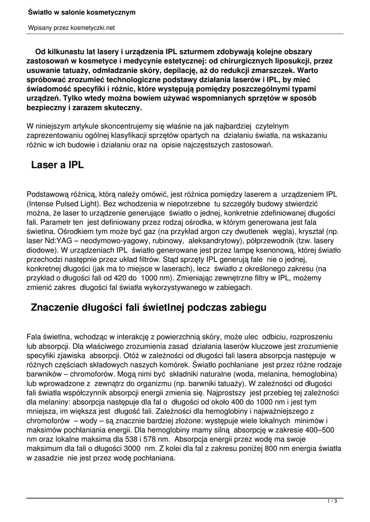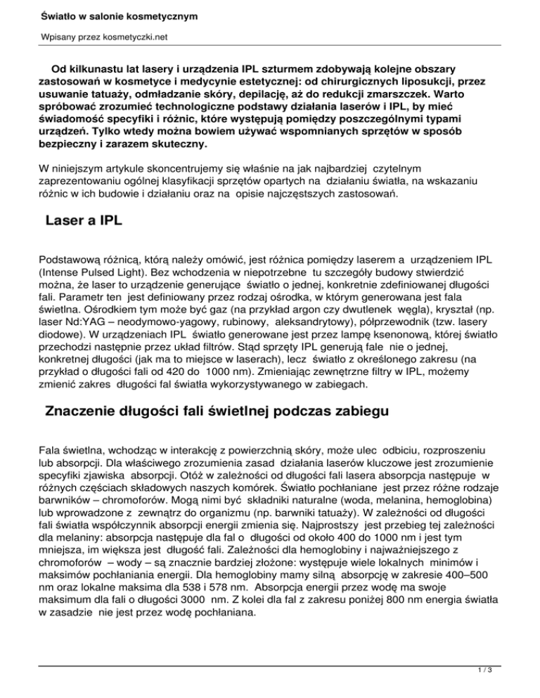 Światło w salonie kosmetycznym Wpisany przez kosmetyczki.net Od kilkunastu lat lasery i urządzenia IPL szturmem zdobywają kolejne obszary zastosowań w kosmetyce i medycynie estetycznej: od chirurgicznych liposukcji, przez usuwanie tatuaży, odmładzanie skóry, depilację, aż do redukcji zmarszczek. Warto spróbować zrozumieć technologiczne podstawy działania laserów i IPL, by mieć świadomość specyfiki i różnic, które występują pomiędzy poszczególnymi typami urządzeń. Tylko wtedy można bowiem używać wspomnianych sprzętów w sposób bezpieczny i zarazem skuteczny. W niniejszym artykule skoncentrujemy się właśnie na jak najbardziej czytelnym zaprezentowaniu ogólnej klasyfikacji sprzętów opartych na działaniu światła, na wskazaniu różnic w ich budowie i działaniu oraz na opisie najczęstszych zastosowań. Laser a IPL Podstawową różnicą, którą należy omówić, jest różnica pomiędzy laserem a urządzeniem IPL (Intense Pulsed Light). Bez wchodzenia w niepotrzebne tu szczegóły budowy stwierdzić można, że laser to urządzenie generujące światło o jednej, konkretnie zdefiniowanej długości fali. Parametr ten jest definiowany przez rodzaj ośrodka, w którym generowana jest fala świetlna. Ośrodkiem tym może być gaz (na przykład argon czy dwutlenek węgla), kryształ (np. laser Nd:YAG – neodymowo-yagowy, rubinowy, aleksandrytowy), półprzewodnik (tzw. lasery diodowe). W urządzeniach IPL światło generowane jest przez lampę ksenonową, której światło przechodzi następnie przez układ filtrów. Stąd sprzęty IPL generują fale nie o jednej, konkretnej długości (jak ma to miejsce w laserach), lecz światło z określonego zakresu (na przykład o długości fali od 420 do 1000 nm). Zmieniając zewnętrzne filtry w IPL, możemy zmienić zakres długości fal światła wykorzystywanego w zabiegach. Znaczenie długości fali świetlnej podczas zabiegu Fala świetlna, wchodząc w interakcję z powierzchnią skóry, może ulec odbiciu, rozproszeniu lub absorpcji. Dla właściwego zrozumienia zasad działania laserów kluczowe jest zrozumienie specyfiki zjawiska absorpcji. Otóż w zależności od długości fali lasera absorpcja następuje w różnych częściach składowych naszych komórek. Światło pochłaniane jest przez różne rodzaje barwników – chromoforów. Mogą nimi być składniki naturalne (woda, melanina, hemoglobina) lub wprowadzone z zewnątrz do organizmu (np. barwniki tatuaży). W zależności od długości fali światła współczynnik absorpcji energii zmienia się. Najprostszy jest przebieg tej zależności dla melaniny: absorpcja następuje dla fal o długości od około 400 do 1000 nm i jest tym mniejsza, im większa jest długość fali. Zależności dla hemoglobiny i najważniejszego z chromoforów – wody – są znacznie bardziej złożone: występuje wiele lokalnych minimów i maksimów pochłaniania energii. Dla hemoglobiny mamy silną absorpcję w zakresie 400–500 nm oraz lokalne maksima dla 538 i 578 nm. Absorpcja energii przez wodę ma swoje maksimum dla fali o długości 3000 nm. Z kolei dla fal z zakresu poniżej 800 nm energia światła w zasadzie nie jest przez wodę pochłaniana. 1/3 Światło w salonie kosmetycznym Wpisany przez kosmetyczki.net W laserach mamy (jak gdyby z definicji) do czynienia z tylko jedną długością generowanej fali. Dane urządzenie może więc być wykorzystane tylko do jednej grupy zabiegów – albo tych oddziałujących na melaninę (lub inny barwnik), albo tych oddziałujących na hemoglobinę, albo tych oddziałujących na cząsteczki wody. (Nie odnosimy się tu do specyficznych urządzeń laserowych, tzw. platform, mających kilka różnych głowic, z których każda generuje fale o innej długości). Można więc powiedzieć, że lasery zawsze będą wykorzystywać swoją selektywność w zakresie długości fali światła. W przypadku IPL nie mamy możliwości uzyskania tak wysokiej selektywności – nawet filtry o wąskim „oknie” przepuszczanych długości fal nie zapewnią nam „punktowej” selektywności laserów. Kolejną niezwykle istotną konsekwencją zastosowanej długości fali światła jest głębokość penetracji energii. Dla fal o długości 400–600 nm energia wnika bardzo płytko (poniżej 1 mm w głąb skóry). Maksymalna głębokość osiągana jest dla fal bliskich 1200 nm. Dalsze zwiększanie długości fali znów prowadzi do zmniejszenia głębokości penetracji. Absorpcja fali świetlnej powoduje lokalne podniesienie temperatury cząstki, która pochłonęła energię światła. W zależności od czasu trwania impulsu jego energii oraz tempa odbierania ciepła przez otaczającą tkankę można uzyskiwać zróżnicowane efekty działania światła. Podstawowe ryzyko przy zabiegu związane jest z niewłaściwym doborem wspomnianych wyżej parametrów i w konsekwencji – z przegrzaniem i oparzeniem tkanek. Zagadnienie doboru właściwych parametrów impulsu światła (czas trwania pojedynczego impulsu, częstotliwość impulsów, poziom generowanej energii, wielkość plamki światła itd.) przekracza zakres niniejszego artykułu. Można jedynie wspomnieć, że brak jest teorii, która pozwalałaby na jednoznaczne przewidywanie skutków podjętych działań, stąd rozwój praktyki oparty jest na żmudnych badaniach klinicznych prowadzonych przez największych producentów sprzętu. Problemy związane z ograniczonymi możliwościami doboru parametrów energetycznych światła rozwiązuje się także czasami poprzez włączenie innej technologii do procesu zabiegowego. Przykładem takiego rozwiązania jest np. technologia ELOS™ (ELectro Optical Synergy), polegająca na „dogrzewaniu” tkanki w obszarze zabiegu nie poprzez światło, lecz przez prąd RF. Depilacja Depilacja to jedno z podstawowych zastosowań zarówno laserów, jak i urządzeń IPL. Zabieg opiera się na absorpcji energii fali świetlnej w cząsteczkach barwn