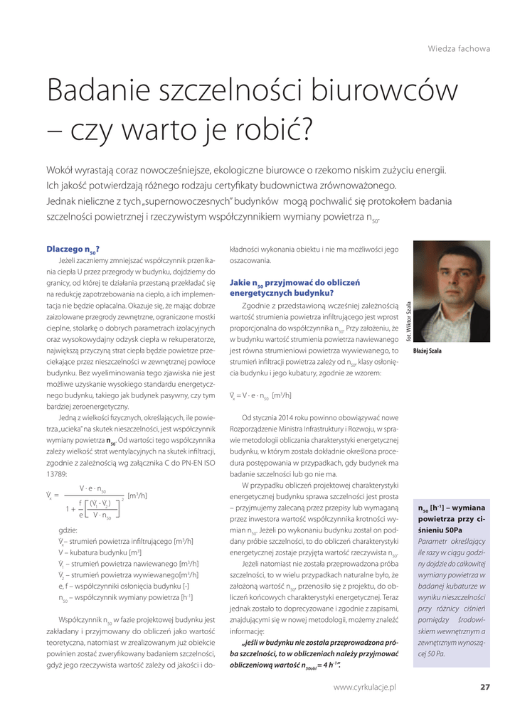 Wiedza fachowa Badanie szczelności biurowców – czy warto je robić? Wokół wyrastają coraz nowocześniejsze, ekologiczne biurowce o rzekomo niskim zużyciu energii. Ich jakość potwierdzają różnego rodzaju certyfikaty budownictwa zrównoważonego. Jednak nieliczne z tych „supernowoczesnych” budynków mogą pochwalić się protokołem badania szczelności powietrznej i rzeczywistym współczynnikiem wymiany powietrza n50. Jeżeli zaczniemy zmniejszać współczynnik przenikania ciepła U przez przegrody w budynku, dojdziemy do granicy, od której te działania przestaną przekładać się na redukcję zapotrzebowania na ciepło, a ich implementacja nie będzie opłacalna. Okazuje się, że mając dobrze zaizolowane przegrody zewnętrzne, ograniczone mostki cieplne, stolarkę o dobrych parametrach izolacyjnych oraz wysokowydajny odzysk ciepła w rekuperatorze, największą przyczyną strat ciepła będzie powietrze przeciekające przez nieszczelności w zewnętrznej powłoce budynku. Bez wyeliminowania tego zjawiska nie jest możliwe uzyskanie wysokiego standardu energetycznego budynku, takiego jak budynek pasywny, czy tym bardziej zeroenergetyczny. Jedną z wielkości fizycznych, określających, ile powietrza „ucieka” na skutek nieszczelności, jest współczynnik wymiany powietrza n50. Od wartości tego współczynnika zależy wielkość strat wentylacyjnych na skutek infiltracji, zgodnie z zależnością wg załącznika C do PN-EN ISO 13789: V∙x = 1+ V ∙ e ∙ n50 f (V∙ - V∙ ) 1 e 2 [m3/h] 2 V ∙ n50 gdzie: V∙x– strumień powietrza infiltrującego [m3/h] V – kubatura budynku [m3] V∙1 – strumień powietrza nawiewanego [m3/h] V∙2 – strumień powietrza wywiewanego[m3/h] e, f – współczynniki osłonięcia budynku [-] n50 – współczynnik wymiany powietrza [h-1] Współczynnik n50 w fazie projektowej budynku jest zakładany i przyjmowany do obliczeń jako wartość teoretyczna, natomiast w zrealizowanym już obiekcie powinien zostać zweryfikowany badaniem szczelności, gdyż jego rzeczywista wartość zależy od jakości i do- kładności wykonania obiektu i nie ma możliwości jego oszacowania. Jakie n50 przyjmować do obliczeń energetycznych budynku? Zgodnie z przedstawioną wcześniej zależnością wartość strumienia powietrza infiltrującego jest wprost proporcjonalna do współczynnika n50. Przy założeniu, że w budynku wartość strumienia powietrza nawiewanego jest równa strumieniowi powietrza wywiewanego, to strumień infiltracji powietrza zależy od n50, klasy osłonięcia budynku i jego kubatury, zgodnie ze wzorem: fot. Wiktor Szala Dlaczego n50? Błażej Szala V∙x = V ∙ e ∙ n50 [m3/h] Od stycznia 2014 roku powinno obowiązywać nowe Rozporządzenie Ministra Infrastruktury i Rozwoju, w sprawie metodologii obliczania charakterystyki energetycznej budynku, w którym została dokładnie określona procedura postępowania w przypadkach, gdy budynek ma badanie szczelności lub go nie ma. W przypadku obliczeń projektowej charakterystyki energetycznej budynku sprawa szczelności jest prosta – przyjmujemy zalecaną przez przepisy lub wymaganą przez inwestora wartość współczynnika krotności wymian n50. Jeżeli po wykonaniu budynku został on poddany próbie szczelności, to do obliczeń charakterystyki energetycznej zostaje przyjęta wartość rzeczywista n50. Jeżeli natomiast nie została przeprowadzona próba szczelności, to w wielu przypadkach naturalne było, że założoną wartość n50, przenosiło się z projektu, do obliczeń końcowych charakterystyki energetycznej. Teraz jednak zostało to doprecyzowane i zgodnie z zapisami, znajdującymi się w nowej metodologii, możemy znaleźć informację: „jeśli w budynku nie została przeprowadzona próba szczelności, to w obliczeniach należy przyjmować obliczeniową wartość n50obl = 4 h-1”. www.cyrkulacje.pl n50 [h-1] – wymiana powietrza przy ciśnieniu 50Pa Parametr określający ile razy w ciągu godziny dojdzie do całkowitej wymiany powietrza w badanej kubaturze w wyniku nieszczelności przy różnicy ciśnień pomiędzy środowiskiem wewnętrznym a zewnętrznym wynoszącej 50 Pa. 27 Wiedza fachowa 16 14,11 m2 Ekwiwalentna powierzchnia nieszczelności EPN [m2] 14 budynek bez próby szczelności 10,58 m2 12 10 budynek z wentylacją grawitacyjną 8 5,29 m2 6 3,53 m2 4 2,12 m2 budynek z wentylacją mechaniczną budynek energooszczędny 2 budynek pasywny 0 0 0,5 1 1,5 2 2,5 3 3,5 4 4,5 Współczynnik wymiany powietrza n50 [h-1] Zapis ten ma ogromne znaczenie dla budynków wielkokubaturowych, w tym właśnie biurowców, ponieważ, ze względu na swoje gabaryty i zwartość bryły, mają one tendencję do bycia dużo bardziej szczelnymi, niż proponowany obliczeniowy współczynnik n50. W tym przypadku brak próby szczelności narzuca przyjęcie bardzo niekorzystnej z energetycznego punktu widzenia „bezpiecznej” wartości współczynnika wymiany powietrza n50, tak żeby rzeczywiste zużycie energii w budynku przypadkiem nie było wyższe od obliczonego. Jak duże są to ilości powierza najlepiej pokazać na konkretnym przykładzie biurowca o kubaturze 50 tys. m3. Do obliczeń przyjmiemy wybrane wartości współczynników n50, które mają swoje odzwierciedlenie w różnych przepisach i zaleceniach, natomiast odpowiadająca im wartość przeciekającego powietrza zostanie przeliczona na ekwiwalentne powierzchnie nieszczelności. Jak widać na załączonym wykresie w przypadku biurowca o kubaturze 50 tys. m3 i n50=4 h-1 (budynek bez próby szczelności), łączna suma powierzchni nieszczelności, przez które przecieka powietrze, wynosi ponad 14 m2! Dla porównania ten sam budynek, dla którego n50=0,6 h-1 (budynek pasywny) ma łączną powierzchnię nieszczelności nieco ponad 2 m2. W takiej sytuacji nie sposób sobie wyobrazić biurowca z certyfikatem LEED lub BREEAM, dla którego współczynnik n50 jest na poziomie odpowiadającym dziurze w elewacji o
