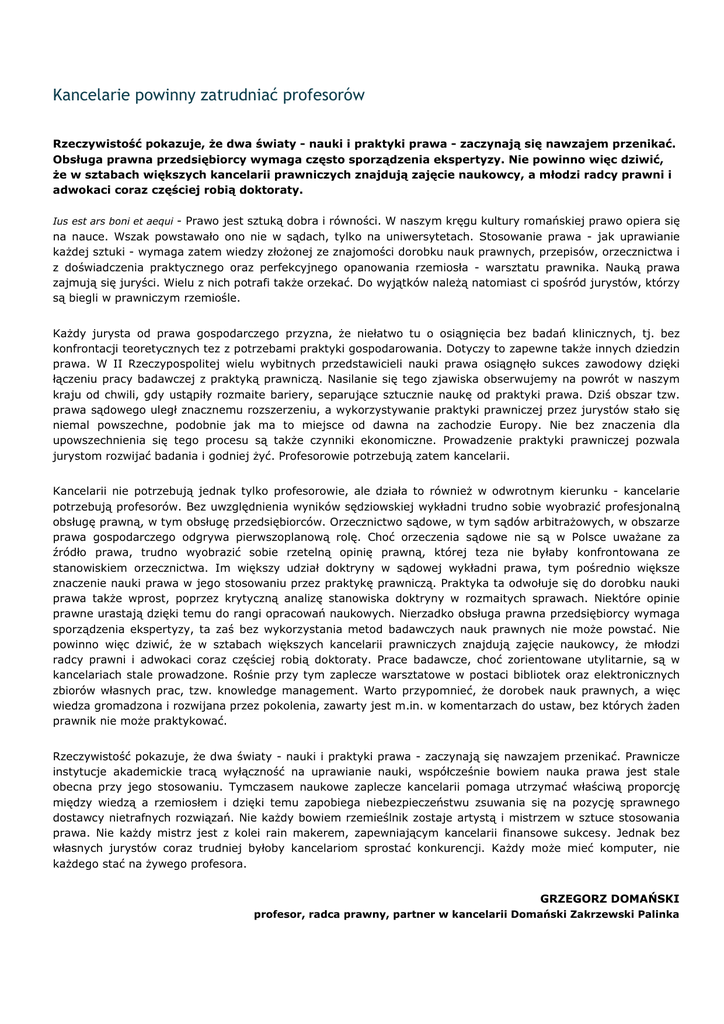 Kancelarie powinny zatrudniać profesorów Rzeczywistość pokazuje, Ŝe dwa światy - nauki i praktyki prawa - zaczynają się nawzajem przenikać. Obsługa prawna przedsiębiorcy wymaga często sporządzenia ekspertyzy. Nie powinno więc dziwić, Ŝe w sztabach większych kancelarii prawniczych znajdują zajęcie naukowcy, a młodzi radcy prawni i adwokaci coraz częściej robią doktoraty. Ius est ars boni et aequi - Prawo jest sztuką dobra i równości. W naszym kręgu kultury romańskiej prawo opiera się na nauce. Wszak powstawało ono nie w sądach, tylko na uniwersytetach. Stosowanie prawa - jak uprawianie kaŜdej sztuki - wymaga zatem wiedzy złoŜonej ze znajomości dorobku nauk prawnych, przepisów, orzecznictwa i z doświadczenia praktycznego oraz perfekcyjnego opanowania rzemiosła - warsztatu prawnika. Nauką prawa zajmują się juryści. Wielu z nich potrafi takŜe orzekać. Do wyjątków naleŜą natomiast ci spośród jurystów, którzy są biegli w prawniczym rzemiośle. KaŜdy jurysta od prawa gospodarczego przyzna, Ŝe niełatwo tu o osiągnięcia bez badań klinicznych, tj. bez konfrontacji teoretycznych tez z potrzebami praktyki gospodarowania. Dotyczy to zapewne takŜe innych dziedzin prawa. W II Rzeczypospolitej wielu wybitnych przedstawicieli nauki prawa osiągnęło sukces zawodowy dzięki łączeniu pracy badawczej z praktyką prawniczą. Nasilanie się tego zjawiska obserwujemy na powrót w naszym kraju od chwili, gdy ustąpiły rozmaite bariery, separujące sztucznie naukę od praktyki prawa. Dziś obszar tzw. prawa sądowego uległ znacznemu rozszerzeniu, a wykorzystywanie praktyki prawniczej przez jurystów stało się niemal powszechne, podobnie jak ma to miejsce od dawna na zachodzie Europy. Nie bez znaczenia dla upowszechnienia się tego procesu są takŜe czynniki ekonomiczne. Prowadzenie praktyki prawniczej pozwala jurystom rozwijać badania i godniej Ŝyć. Profesorowie potrzebują zatem kancelarii. Kancelarii nie potrzebują jednak tylko profesorowie, ale działa to równieŜ w odwrotnym kierunku - kancelarie potrzebują profesorów. Bez uwzględnienia wyników sędziowskiej wykładni trudno sobie wyobrazić profesjonalną obsługę prawną, w tym obsługę przedsiębiorców. Orzecznictwo sądowe, w tym sądów arbitraŜowych, w obszarze prawa gospodarczego odgrywa pierwszoplanową rolę. Choć orzeczenia sądowe nie są w Polsce uwaŜane za źródło prawa, trudno wyobrazić sobie rzetelną opinię prawną, której teza nie byłaby konfrontowana ze stanowiskiem orzecznictwa. Im większy udział doktryny w sądowej wykładni prawa, tym pośrednio większe znaczenie nauki prawa w jego stosowaniu przez praktykę prawniczą. Praktyka ta odwołuje się do dorobku nauki prawa takŜe wprost, poprzez krytyczną analizę stanowiska doktryny w rozmaitych sprawach. Niektóre opinie prawne urastają dzięki temu do rangi opracowań naukowych. Nierzadko obsługa prawna przedsiębiorcy wymaga sporządzenia ekspertyzy, ta zaś bez wykorzystania metod badawczych nauk prawnych nie moŜe powstać. Nie powinno więc dziwić, Ŝe w sztabach większych kancelarii prawniczych znajdują zajęcie naukowcy, Ŝe młodzi radcy prawni i adwokaci coraz częściej robią doktoraty. Prace badawcze, choć zorientowane utylitarnie, są w kancelariach stale prowadzone. Rośnie przy tym zaplecze warsztatowe w postaci bibliotek oraz elektronicznych zbiorów własnych prac, tzw. knowledge management. Warto przypomnieć, Ŝe dorobek nauk prawnych, a więc wiedza gromadzona i rozwijana przez pokolenia, zawarty jest m.in. w komentarzach do ustaw, bez których Ŝaden prawnik nie moŜe praktykować. Rzeczywistość pokazuje, Ŝe dwa światy - nauki i praktyki prawa - zaczynają się nawzajem przenikać. Prawnicze instytucje akademickie tracą wyłączność na uprawianie nauki, współcześnie bowiem nauka prawa jest stale obecna przy jego stosowaniu. Tymczasem naukowe zaplecze kancelarii pomaga utrzymać właściwą proporcję między wiedzą a rzemiosłem i dzięki temu zapobiega niebezpieczeństwu zsuwania się na pozycję sprawnego dostawcy nietrafnych rozwiązań. Nie kaŜdy bowiem rzemieślnik zostaje artystą i mistrzem w sztuce stosowania prawa. Nie kaŜdy mistrz jest z kolei rain makerem, zapewniającym kancelarii finansowe sukcesy. Jednak bez własnych jurystów coraz trudniej byłoby kancelariom sprostać konkurencji. KaŜdy moŜe mieć komputer, nie kaŜdego stać na Ŝywego profesora. GRZEGORZ DOMAŃSKI profesor, radca prawny, partner w kancelarii Domański Zakrzewski Palinka