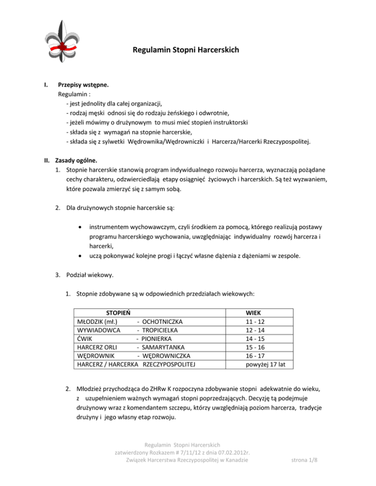 Regulamin Stopni Harcerskich I. Przepisy wstępne. Regulamin : - jest jednolity dla całej organizacji, - rodzaj męski odnosi się do rodzaju żeńskiego i odwrotnie, - jeżeli mówimy o drużynowym to musi mieć stopień instruktorski - składa się z wymagań na stopnie harcerskie, - składa się z sylwetki Wędrownika/Wędrowniczki i Harcerza/Harcerki Rzeczypospolitej. II. Zasady ogólne. 1. Stopnie harcerskie stanowią program indywidualnego rozwoju harcerza, wyznaczają pożądane cechy charakteru, odzwierciedlają etapy osiągnięć życiowych i harcerskich. Są też wyzwaniem, które pozwala zmierzyć się z samym sobą. 2. Dla drużynowych stopnie harcerskie są: instrumentem wychowawczym, czyli środkiem za pomocą, którego realizują postawy programu harcerskiego wychowania, uwzględniając indywidualny rozwój harcerza i harcerki, uczą pokonywać kolejne progi i łączyć własne dążenia z dążeniami w zespole. 3. Podział wiekowy. 1. Stopnie zdobywane są w odpowiednich przedziałach wiekowych: STOPIEŃ MŁODZIK (mł.) - OCHOTNICZKA WYWIADOWCA - TROPICIELKA ĆWIK - PIONIERKA HARCERZ ORLI - SAMARYTANKA WĘDROWNIK - WĘDROWNICZKA HARCERZ / HARCERKA RZECZYPOSPOLITEJ WIEK 11 - 12 12 - 14 14 - 15 15 - 16 16 - 17 powyżej 17 lat 2. Młodzież przychodząca do ZHRw K rozpoczyna zdobywanie stopni adekwatnie do wieku, z uzupełnieniem ważnych wymagań stopni poprzedzających. Decyzję tą podejmuje drużynowy wraz z komendantem szczepu, którzy uwzględniają poziom harcerza, tradycje drużyny i jego własny etap rozwoju. Regulamin Stopni Harcerskich zatwierdzony Rozkazem # 7/11/12 z dnia 07.02.2012r. Związek Harcerstwa Rzeczypospolitej w Kanadzie strona 1/8 3. Oznaczenie stopni harcerskich. Nazwa stopnia (skrót) Oznaczenie Młodzik (mł.) / Ochotniczka (och.) Wywiadowca (wyw.) /Tropicielka (trop.) Ćwik (ćw.) / Pionierka (pion.) Harcerz Orli (HO) / Samarytanka (sam.) Wędrownik (wędr.)/ Wędrowniczka(wędr.) Harcerz/Harcerka Rzeczypospolitej (HR) Krzyż Harcerski bez podkladki podkładka pomarańczowa podkładka biała podkładka żółta podkładka jasno niebieska podkladka biało-czerwona 4. Warunki przyznania stopnia: 1. Postępowanie zgodne z Prawem i Przyrzeczeniem Harcerskim. Kształtowanie cech charakteru wymaganych w idei stopnia i w programie próby. 2. Doskonalenie się w Służbie, braterstwie i pracy nad sobą. Bycie szlachetnym, odważnym i koleżeńskim, szanowanie rodziców, starszych i swoich przełożonych. Z uśmiechem pokonywanie trudności. 3. Aktywne uczestniczenie w pracy drużyny i zastępu, wzorowe wykonywanie poleconych zadania. 4. Zdobywanie wiadomości i umiejętności praktycznych z różnych dziedzin wiedzy harcerskiej i ogólnej oraz sprawności harcerskich określonych w programie prób na stopień. 5. Osiąganie zadawalających wyników w nauce. Poznawanie historii i geografii Polski i Kanady. Interesowanie się literaturą. Rozwijanie zainteresowań kulturą i sztuką. Zdobywanie umiejętności technicznych. 6. Bycie karnym i zdyscyplinowanym, przestrzeganie zasad organizacyjnych i zwyczajów drużyny, szczepu i środowiska. Wzorowe wykonywanie rozkazów przełożonych. Dawanie dobrego przykładu młodszym. Dbanie o poszanowanie munduru. 7. Dbanie o zdrowie. Hartowanie się i praca nad rozwojem sprawności fizycznej. 8. Z pomyślnym wynikiem odbycie próby na stopień i zaliczenie harcerskiego biegu końcowego. Regulamin Stopni Harcerskich zatwierdzony Rozkazem # 7/11/12 z dnia 07.02.2012r. Związek Harcerstwa Rzeczypospolitej w Kanadzie strona 2/8 III. Zasady zdobywania i przyznawania stopni. 1. Harcerz zdobywa stopnie indywidualnie. 2. Harcerz w toku normalnej pracy zastępu i drużyny na zbiórkach i w pracy samodzielnej (w okresie ustalonym dla każdego stopnia) osiąga wiedzę, umiejętności i cechy charakteru wymagane w programie próby. 3. Stopnie zdobywa się kolejno (wyjątek patrz pkt. II.2.3.2). Po zdobyciu stopnia przystępuje się do zdobywania wyższego. 4. Zdobywanie stopni rozpoczyna się po złożeniu Przyrzeczenia Harcerskiego z wyjątkiem pierwszego stopnia Młodzik/Ochotniczka. 5. Otwarcie próby na pierwszy stopień następuje przed złożeniem Przyrzeczenia Harcerskiego, lecz stopień zostaje przyznany harcerzowi już posiadającemu Krzyż Harcerski. 6. Zdobywanie stopnia odbywa się w trzech etapach: przygotowanie do próby, próba, bieg harcerski (próba końcowa). 7. W każdym szczepie powinna funkcjonować Komisja Stopni Harcerskich, która podejmuje decyzje w sprawie zatwierdzenia programu prób, zaliczenia prób i dopuszczenia do biegu harcerskiego końcowego. 8. Komisję Stopni Harcerskich tworzą: komendant szczepu, instruktor mianowany, drużynowy lub przyboczny , harcerz posiadający w drużynie dany stopień, harcerz posiadający stopień HR. Prawo członkostwa w Komisji Stopni ogłasza rozkazem komendant szczepu. 9. Próby na stopnie harcerskie są otwierane i zamykane rozkazem komendanta szczepu lub instruktora mianowanego z wyjątkiem stopnia Wędrownik i Harcerz Rzeczypospolitej. 10. Próba na stopień Wędrownik otwierana jest i zamykana przez Komendanta Chorągwi przy współudziale członków Komendy Chorągwi. 11. Próba na stopień Harcerza Rzeczypospolitej otwierana i zamykana jest przez Komendanta Chorągwi przy współudziale członków Komendy Chorągwi. Regulamin Stopni Harcerskich zatwierdzony Rozkazem # 7/11/12 z dnia 07.02.2012r. Związek Harcerstwa Rzeczypospolitej w Kanadzie strona 3/8 IV. Prowadzenie prób i nadawanie stopni. 1. Czas zdobywania stopnia nazywamy próbą, bo daje możliwość sprawdzenia siebie, wykazania się w konkretnym działaniu postawą, wiedzą i umiejętnościami. 2. Jeżeli nie wszystkie wymagania zostaną spełnione w proponowanym czasie, Komisja Stopni Harcerskich może zamknąć próbę z wynikiem negatywnym lub w uzasadnionych przypadkach przedłużyć ją określając dodakowy czas (nie dłużej niż 3 miesiące). 3. Przy zamykaniu próby wymagana jest obecno