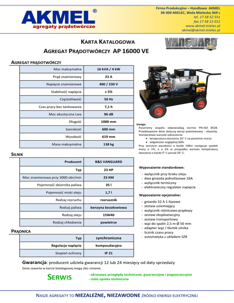 AKMEL Firma Produkcyjno – Handlowa AKMEL 39-300 MIELEC, Wola Mielecka 369 c tel. 17 58 52 551 fax 17 58 12 012 www.akmel.mielec.pl [email protected] ® agregaty prądotwórcze KARTA KATALOGOWA AGREGAT PRĄDOTWÓRCZY AP 16000 VE AGREGAT PRĄDOTWÓRCZY Moc maksymalna 16 kVA / 4 kW Prąd znamionowy 23 A Napięcie znamionowe 400 / 230 V Stabilność napięcia ± 5% Częstotliwość 50 Hz Czas pracy bez tankowania 7,1 h Moc akustyczna Lwa 96 dB Długość 1000 mm Szerokość 600 mm Wysokość 619 mm Masa maksymalna 138 kg SILNIK Producent B&S VANGUARD Typ 23 HP Moc znamionowa przy 3000 obr/min 23 KM Pojemność zbiornika paliwa 35 l Pojemność miski oleju 1,7 l Rodzaj rozruchu Rodzaj paliwa rozrusznik benzyna bezołowiowa Rodzaj oleju Rodzaj chłodzenia Uwaga: Parametry zespołu odpowiadają normie PN-ISO 8528. Przedstawione dane dotyczą wersji podstawowej - otwartej. Standardowe warunki odniesienia: temperatura otoczenia 20 C na poziomie morza wilgotności względnej 60%. Przy wzroście wysokości o każde 100m następuje spadek mocy o 1%, a o 2% w przypadku wzrostu temperatury otoczenia o każde 5 C ponad 20 C. 15W40 powietrze PRĄDNICA Typ synchroniczna Regulacja napięcia kompoudacyjna Stopień ochrony Wyposażenie standardowe: - wyłącznik przy braku oleju dwa gniazda jednofazowe 16A wyłącznik termiczny elektroniczny regulator napięcia Wyposażenie opcjonalne: - gniazdo 32 A 1-fazowe zestaw uziemiający wyłącznik różnicowo-prądowy zestaw eksploatacyjny zestaw transportowy wąż do spalin 2,5 m Ø 50 mm adapter wąż / tłumik silnika - licznik czasu pracy - automatyka z układem SZR IP 21 Gwarancja: producent udziela gwarancji 12 lub 24 miesięcy od daty sprzedaży Dane zawarte w karcie katalogowej mogą ulec zmianie. SERWIS - okresowe przeglądy techniczne, gwarancyjne i pogwarancyjne - stała opieka techniczna NASZE AGREGATY TO NIEZALEŻNE, NIEZAWODNE ŹRÓDŁO ENERGII ELEKTRYCZNEJ