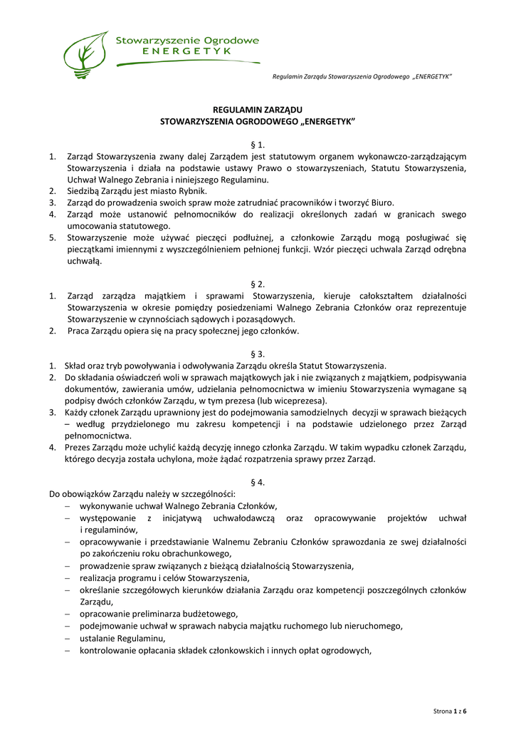 Regulamin Zarządu Stowarzyszenia Ogrodowego „ENERGETYK” REGULAMIN ZARZĄDU STOWARZYSZENIA OGRODOWEGO „ENERGETYK” 1. 2. 3. 4. 5. 1. 2. § 1. Zarząd Stowarzyszenia zwany dalej Zarządem jest statutowym organem wykonawczo-zarządzającym Stowarzyszenia i działa na podstawie ustawy Prawo o stowarzyszeniach, Statutu Stowarzyszenia, Uchwał Walnego Zebrania i niniejszego Regulaminu. Siedzibą Zarządu jest miasto Rybnik. Zarząd do prowadzenia swoich spraw może zatrudniać pracowników i tworzyć Biuro. Zarząd może ustanowić pełnomocników do realizacji określonych zadań w granicach swego umocowania statutowego. Stowarzyszenie może używać pieczęci podłużnej, a członkowie Zarządu mogą posługiwać się pieczątkami imiennymi z wyszczególnieniem pełnionej funkcji. Wzór pieczęci uchwala Zarząd odrębna uchwałą. § 2. Zarząd zarządza majątkiem i sprawami Stowarzyszenia, kieruje całokształtem działalności Stowarzyszenia w okresie pomiędzy posiedzeniami Walnego Zebrania Członków oraz reprezentuje Stowarzyszenie w czynnościach sądowych i pozasądowych. Praca Zarządu opiera się na pracy społecznej jego członków. § 3. 1. Skład oraz tryb powoływania i odwoływania Zarządu określa Statut Stowarzyszenia. 2. Do składania oświadczeń woli w sprawach majątkowych jak i nie związanych z majątkiem, podpisywania dokumentów, zawierania umów, udzielania pełnomocnictwa w imieniu Stowarzyszenia wymagane są podpisy dwóch członków Zarządu, w tym prezesa (lub wiceprezesa). 3. Każdy członek Zarządu uprawniony jest do podejmowania samodzielnych decyzji w sprawach bieżących – według przydzielonego mu zakresu kompetencji i na podstawie udzielonego przez Zarząd pełnomocnictwa. 4. Prezes Zarządu może uchylić każdą decyzję innego członka Zarządu. W takim wypadku członek Zarządu, którego decyzja została uchylona, może żądać rozpatrzenia sprawy przez Zarząd. § 4. Do obowiązków Zarządu należy w szczególności: wykonywanie uchwał Walnego Zebrania Członków, występowanie z inicjatywą uchwałodawczą oraz opracowywanie projektów uchwał i regulaminów, opracowywanie i przedstawianie Walnemu Zebraniu Członków sprawozdania ze swej działalności po zakończeniu roku obrachunkowego, prowadzenie spraw związanych z bieżącą działalnością Stowarzyszenia, realizacja programu i celów Stowarzyszenia, określanie szczegółowych kierunków działania Zarządu oraz kompetencji poszczególnych członków Zarządu, opracowanie preliminarza budżetowego, podejmowanie uchwał w sprawach nabycia majątku ruchomego lub nieruchomego, ustalanie Regulaminu, kontrolowanie opłacania składek członkowskich i innych opłat ogrodowych, Strona 1 z 6 Regulamin Zarządu Stowarzyszenia Ogrodowego „ENERGETYK” zawieranie porozumień o współpracy i umów z organami administracji państwowej, samorządowej oraz innymi organizacjami i podmiotami krajowymi i zagranicznymi, powoływanie specjalistów, zespołów problemowych oraz określanie ich zadań, zarządzanie majątkiem i sprawami Stowarzyszenia oraz pełnienie swoich obowiązków ze starannością wymaganą w obrocie gospodarczym, finansowym, przy ścisłym przestrzeganiu przepisów prawa oraz postanowień Statutu i uchwał Walnego Zebrania Członków, udzielanie Komisji Rewizyjnej oraz Walnemu Zebraniu Członków wyczerpujących wyjaśnień wraz z przedstawieniem wszelkich dokumentów i innych materiałów dotyczących przedmiotu kontroli, wykonywanie zaleceń pokontrolnych i uchwał Komisji Rewizyjnej, przedkładanie corocznie Walnemu Zebraniu Członków do rozpatrzenia i zatwierdzenia planu gospodarczego, sprawozdania ze swej działalności, planu remontów i inwestycji, planowanych wysokości opłat ogrodowych, a także sprawozdań z wydatkowania środków własnych Stowarzyszenia, prowadzenie ewidencji działek w formie papierowej i pomocniczo elektronicznej, prowadzenie ewidencji Członków Stowarzyszenia, przyjmowanie bądź odmowa przyjęcia w poczet Członków Stowarzyszenia, powoływanie Gospodarzy Sektorów, ustalenie ich kompetencji oraz bieżąca współpraca z nimi, § 5. Do kompetencji Zarządu należy w szczególności: a) w sprawach członkowskich: przyjmowanie członków zwyczajnych i wspierających Stowarzyszenia, na zasadach określonych w Statucie, przyjmowanie deklaracji nowych członków o wstąpieniu do Stowarzyszenia, ustalanie zasad wspierania Stowarzyszenia przez członków wspierających, skreślanie z listy członków zwyczajnych i wspierających, składanie informacji Walnemu Zebraniu Członków o skreśleniu z listy członków Stowarzyszenia, wykluczanie członków zwyczajnych i wspierających, b) w sprawach Walnego Zebrania Członków: zwoływanie Walnego Zebrania Członków, przygotowanie organizacyjne Walnego Zebrania Członków, przygotowanie niezbędnych materiałów, projektów uchwał Walnego Zebrania Członków, c) w sprawach majątkowo-finansowych: pozyskiwanie funduszy na działalność statutową Stowarzyszenia, inicjowanie i prowadzenie działalności gospodarczej w zakresie ustalonym w Statucie Stowarzyszenia, wybór banku do prowadzenia rachunku bankowego Stowarzyszenia, wybór Biura Rachunkowego do prowadzenia księgowości Stowarzyszenia. 1. 2. § 6. W ramach zakresu działania Zarządu, do zakresu czynności prezesa Zarządu należą sprawy nie zastrzeżone ani dla Zarządu, ani dla innych członków Zarządu. Do zakresu czynności prezesa Zarządu należy, w szczególności: koordynowanie i kierowanie pracami Zarządu, wyznacza, ocenia i rozlicza wykonanie zadań przez poszczególnych członków Zarządu; Strona 2 z 6 Regulamin Zarządu Stowarzyszenia Ogrodowego „ENERGETYK” 3. reprezentowanie Stowarzyszenia – w razie potrzeby – wraz z innymi osobami upoważnionymi do reprezentowania Stowarzyszenia, informowanie członków Zarządu o istotnych, bieżących sprawach i zagadnieniach, związanych z funkcjonowaniem Stowarzyszenia, wykon