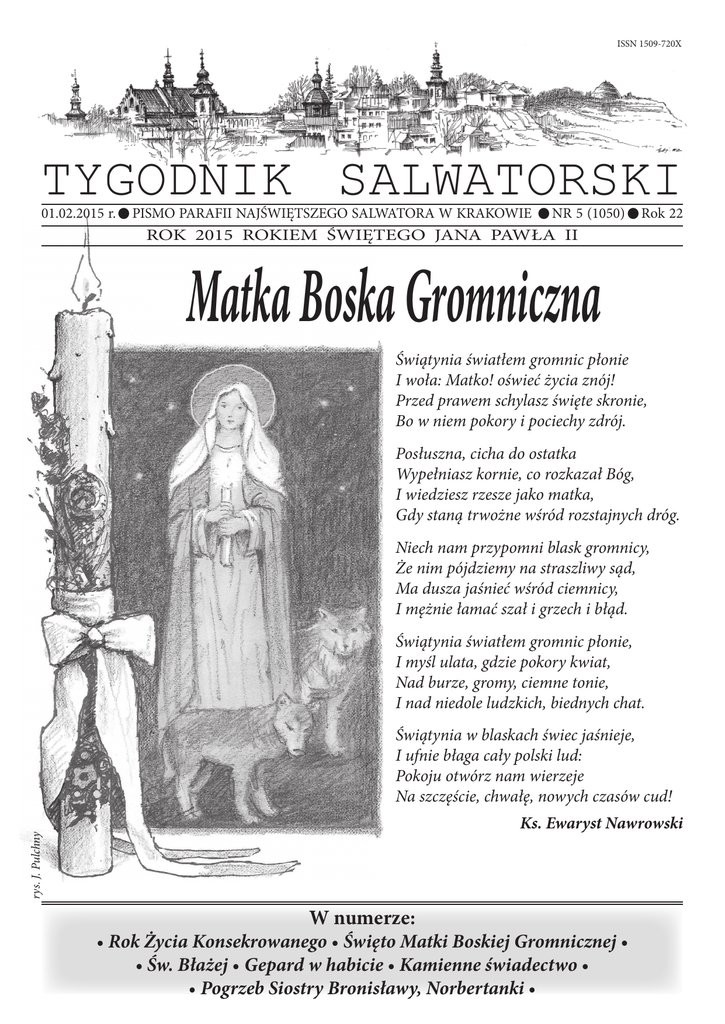 ISSN 1509-720X TYGODNIK SALWATORSKI • 01.02.2015 r. PISMO PARAFII NAJŚWIĘTSZEGO SALWATORA W KRAKOWIE • • NR 5 (1050) ROK 2015 ROKIEM ŚWIĘTEGO JANA PAWŁA II Rok 22 Matka Boska Gromniczna Świątynia światłem gromnic płonie I woła: Matko! oświeć życia znój! Przed prawem schylasz święte skronie, Bo w niem pokory i pociechy zdrój. Posłuszna, cicha do ostatka Wypełniasz kornie, co rozkazał Bóg, I wiedziesz rzesze jako matka, Gdy staną trwożne wśród rozstajnych dróg. Niech nam przypomni blask gromnicy, Że nim pójdziemy na straszliwy sąd, Ma dusza jaśnieć wśród ciemnicy, I mężnie łamać szał i grzech i błąd. Świątynia światłem gromnic płonie, I myśl ulata, gdzie pokory kwiat, Nad burze, gromy, ciemne tonie, I nad niedole ludzkich, biednych chat. Świątynia w blaskach świec jaśnieje, I ufnie błaga cały polski lud: Pokoju otwórz nam wierzeje Na szczęście, chwałę, nowych czasów cud! rys. J. Pulchny Ks. Ewaryst Nawrowski W numerze: • Rok Życia Konsekrowanego • Święto Matki Boskiej Gromnicznej • • Św. Błażej • Gepard w habicie • Kamienne świadectwo • • Pogrzeb Siostry Bronisławy, Norbertanki • Na początku... TYGODNIK SALWATORSKI Drodzy czytelnicy Tygodnika! Redaguje zespół w składzie: Red. nacz.: ks. Tomasz Gędłek, Jan Deskur, Maria Gracja Krzyżanowska, Teresa Makuch, Barbara i Andrzej Skrzyńscy Stale współpracują: Krzysztof Bar, ks. Krzysztof Biros, Felicja Niedzielska, Łukasz Strutyński, Magdalena Łasak-Strutyńska Ilustracje: Jerzy Pulchny Skład, redakcja techniczna i graficzna: Krzysztof Korzeniak Adres redakcji: 30-114 Kraków, ul. Kościuszki 88; e-mail: [email protected]; www.tygodniksalwatorski.pl (administruje Roman Topór-Mądry). Tygodnik Salwatorski powstaje z pracy bez honorariów. Tygodnik można zaprenumerować w zakrystii kościoła SS. Norbertanek. Można go nabywać we wszystkich kościołach na terenie Parafii. Redaktor prowadzący: Maria Gracja Krzyżanowska Kancelaria Parafialna 30-114 Kraków, ul. Kościuszki 88 www.parafiasalwator.pl Dni i godziny urzędowania Dzień tygodnia poniedziałek wtorek środa czwartek piątek sobota Kancelaria 16.00 - 17.30 16.00 - 17.30 16.00 - 17.30 16.00 - 17.30 9.00 - 10.30 9.00 - 10.30 Zarząd Cmentarza nieczynne 16.00 - 17.30 16.00 - 17.30 nieczynne 9.00 - 10.30 nieczynne Msze święte i nabożeństwa NIEDZIELE I ŚWIĘTA Kościół św. Jana Chrzciciela: 6:30 7:30 9:00 10:30 12:00 13:15 19:00 Kościół Najświętszego Salwatora: 11:15 - 2. i 4. niedziela miesiąca - od maja do października, a od listopada do kwietnia w każdą niedzielę. Kaplica św. Małgorzaty: 11:15 - od maja do października - 1. i 3. niedzielę miesiąca Kaplica Wszystkich Świętych: 10:00 - od Wielkanocy do Wszystkich Świętych DNI POWSZEDNIE Kościół św. Jana Chrzciciela: 6:30 7:15 8:00 18:00 PIERWSZY PIĄTEK MIESIĄCA - Msza św. dla dzieci godz. 17.00. Telefon do kancelarii: 12 424 43 60 Nr konta Parafii: PKO Bank Polski S.A. 30 1020 2892 0000 5402 0402 0490 7434 Zachęcamy wszystkich chętnych do współpracy z „Tygodnikiem Salwatorskim”. Czekamy na wasze teksty i artykuły pod adresem: [email protected] Dziś ostatni dzień kolędowania, nawet spóźnialscy wyrzucili już zeschnięte choinki, a za oknami nareszcie śniegi i mrozy, zgodnie z ludowym porzekadłem: „Gromnica, zimy połowica”. Mimo, iż do Środy Popielcowej jeszcze kilkanaście dni, pełnych karnawałowych uciech, światło świec rozpalanych w święto 2 lutego powoli zaczyna oświetlać Krzyż. Tymczasem potworne są doniesienia z Mariupola, na Ukrainie trwa wojna, a ofiarami są ludzie mieszkający w zwykłych blokach, tak jak na Prokocimiu, czy Bieżanowie… Cierpią matki spodziewające się potomstwa, niedożywione dzieci… My obchodzimy odległą, bo 70. rocznicę wyzwolenia spod okupacji niemieckiej i okrucieństwa II wojny światowej kojarzą się bardziej z muzeum. A tam blisko, u sąsiadów, jest strach. Znamy matkę, która aby uratować przed poborem do wojska swojego 28-letniego syna, ubłagała konsula, aby dostać upragnioną wizę, potem urzędników miejskich, a na koniec celników na granicy, by przymknęli oko na syna ukrytego w bagażniku samochodu. Wydała na to oszczędności życia, ale nie żałuje. I nie narzeka na to, że przemieszkuje teraz w Krakowie kątem u znajomych, że ima się różnych dorywczych zajęć, mimo że na Ukrainie była kimś – właścicielką cukierni, a wcześniej kierowniczką dużego konglomeratu gastronomicznego. Jest dzielną kobietą, która poznała trudy życia i wie, co jest naprawdę ważne: ocalić życie. A w naszej telewizji, radiu, nawet na ulicy - na okrągło debata o pigułkach „po”, można już odczuwać pewne znużenie, jak to wszystko zostało postawione na głowie. Zamiast myśleć o tym, jak mądrze pomagać życiu od samego początku, angażując w to również siły społeczne i państwowe… Ale wiadomo, machina pseudoliberalna robi wiele hałasu, w końcu nic nie dzieje się przypadkowo… I jeszcze jeden przygnębiający przykład, zaobserwowany niedawno na pobliskim podwórku – piekarnio-kawiarnia na rogu Placu Dominikańskiego, godz. 22 w niedzielę. Po całym dniu wielkie, bogate kanapki – z łososiem, salami, serem: nie sprzedały się - więc lądują w koszu. Bez żadnej żenady, refleksji… i tak dzień w dzień. Nie ma lepszych rozwiązań? Czy nam aby nie jest za dobrze? W takich chwilach tęskni się za innym światem – „do kraju tego, gdzie kruszynę chleba…”. Gdzie dobro nazywane jest dobrem, a zło złem. Docenia się istnienie stałego punktu odniesienia, wartości nieprzemijających. Na szczęście taki świat duchowy wciąż istnieje, jest blisko, a oby był w nas. Wystarczy tylko się przyjrzeć, przysłuchać osobom, dla których Bóg jest najważniejszy, a przejawia się to w różnego rodzaju działaniach podejmowanych przez nich na rzecz dobra człowieka. Także w modli