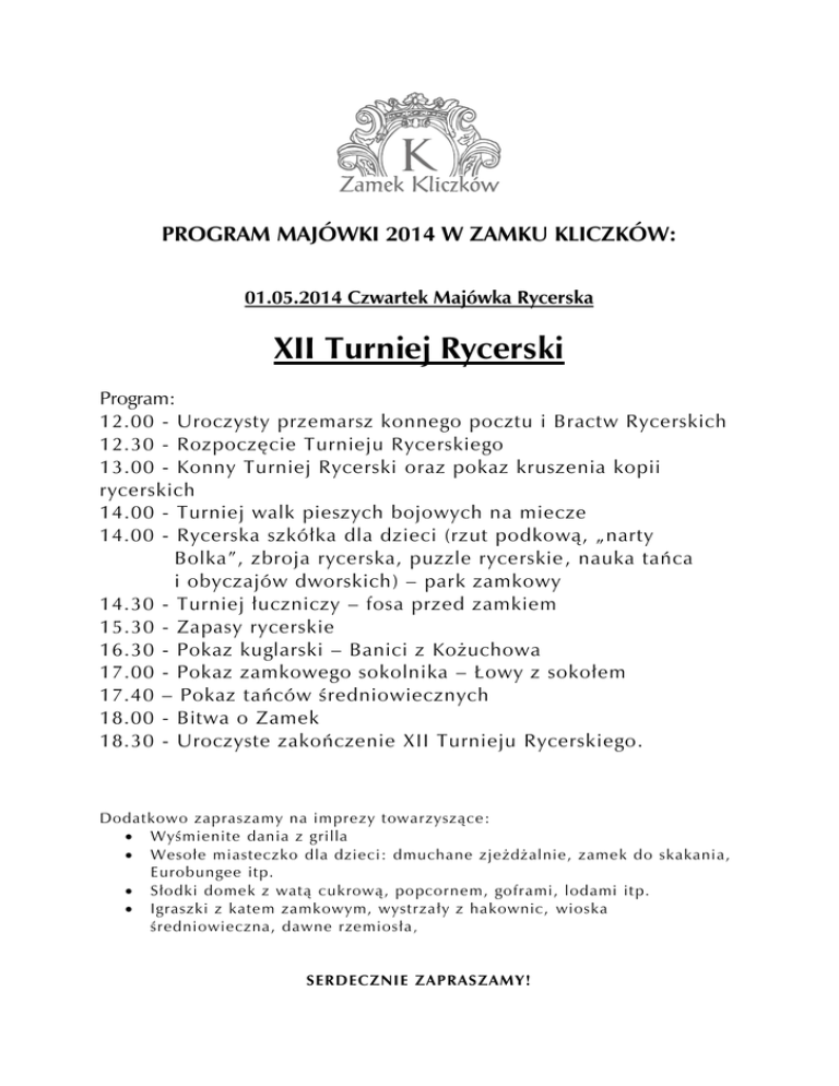 PROGRAM MAJÓWKI 2014 W ZAMKU KLICZKÓW: 01.05.2014 Czwartek Majówka Rycerska XII Turniej Rycerski Program: 12.00 - Uroczysty przemarsz konnego pocztu i Bractw Rycerskich 12.30 - Rozpoczęcie Turnieju Rycerskiego 13.00 - Konny Turniej Rycerski oraz pokaz kruszenia kopii rycerskich 14.00 - Turniej walk pieszych bojowych na miecze 14.00 - Rycerska szkółka dla dzieci (rzut podkową, „narty Bolka”, zbroja rycerska, puzzle rycerskie , nauka tańca i obyczajów dworskich ) – park zamkowy 14.30 - Turniej łuczniczy – fosa przed zamkiem 15.30 - Zapasy rycerskie 16.30 - Pokaz kuglarski – Banici z Kożuchowa 17.00 - Pokaz zamkowego sokolnika – Łowy z sokołem 17.40 – Pokaz tańców średniowiecznych 18.00 - Bitwa o Zamek 18.30 - Uroczyste zakończenie XII Turnieju Rycerskiego. Dodatkowo zapras zamy na impre zy towarzyszące: Wyśmienite dania z grilla Wesołe miasteczko dla dzieci: dmuchane zjeżdżalnie, zamek do skakania, Eurobungee itp. Słodki domek z watą cukrową, popcornem, goframi, lodami it p. Igraszki z katem zamk owym, wystrzały z hakownic, wioska średniowieczna, dawne rzemiosła , SERDECZNIE ZAPRASZAMY !
