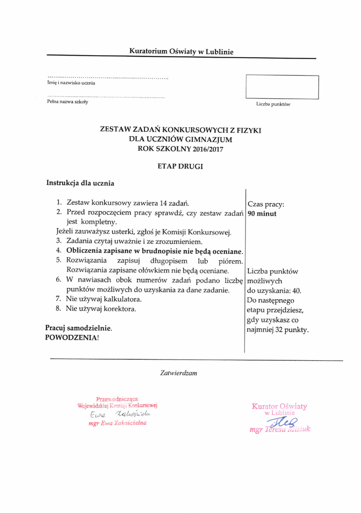 Kuratoriun O6wiaty w Lubtinie Irnie i nazwisko ucznia Pehu nazwa szkoly Liczba punktdw ZESTAW ZADAT( XONXURSOWYCH Z FIZYKI DLAUCZNToWGTMNAZIUM ROK SZKOLNY 201612077 ETAPDRUGI lnshukda dla ucznia 1. Zestaw konkursowy zawiera 74 zada . 2. Przed rozpoczgciem pracy sptawdi, czy zestaw zadaA jest kompletny. Je eli zanwa2ysz usterki, zglod je Komisji Konkursowej. 3. Zad,ania czytaj uwainie i ze zrozumieniem. 4. Obliczenia zapisane w brudnopisie nie bpd4 oceniane. 5. Rozwi4zania zapisuj dfugopisem lub pi6rem. Rozwi4zania zapisane ol6wkiem nie bgd4 oceniane. 6. W nawiasadr obok numer,6w zadari podano liczbg punkt6w mo2liwydr do uzyskania za dane zadanie. 7. Nie uirywaj kalkulatora. 8. Nie u2ywaj korektora. Pracui samodzielnie. Czas prary: 90 minut Liczba punktdw modiwydr do uzyskania: 40. Do nastgpnego etapu przejdziesz, gdy uzyskasz co najmniej 32 punkty. POWODZENIA! Zatwierdzam ptzev-.,t,lnscz4cz Wcjcw6dzklcj € il,r'ri.'r Konlune'*cj u,e. 4.ql',etl'eL. mgr Ewa Zak,zlcielna *"'*tll'9,11:t"t" ^nk--,,* We wszystkich zadaniach przyjmij wartość przyspieszenia ziemskiego g = 10 m/s2. Zadanie 1.(1 punkt) Uczniowie wyznaczyli masę jabłka przy użyciu wagi. Wynik pomiaru zapisali w następujący sposób: 134 g 2 g. Dokończ zdanie wybierając właściwą odpowiedź z podanych niżej. Zmierzona masa jabłka mieści się w przedziale A. od 134 g do 136 g. B. od 132 g do 136 g. C. od 132 g do 134 g. D. od 130 g do 138 g. Zadanie 2. (1 punkt) Znamy trzy sposoby transportu energii: przewodnictwo cieplne, konwekcja i promieniowanie. Wskaż właściwe przyporządkowanie zjawiskom fizycznym ich definicji tak, aby powstały zdania prawdziwe. I II III Konwekcja Przewodnictwo cieplne Promieniowanie to 1 zjawisko transportu energii zachodzące na odległość, np. między Słońcem a Ziemią. 2 przekazywanie energii, które odbywa się dzięki przemieszczaniu masy. Zjawisko to zachodzi głównie w cieczach i gazach. 3 proces przekazywania części energii wewnętrznej pod wpływem różnicy temperatur. A. I-3, II-2, III-1 B. I-1, II-2, III-3 C. I-2, II-3, III-1 D. I-3, II-1, III-2 Zadanie 3. (1 punkt) Z podłogi balkonu na piątym piętrze spadła doniczka o masie 2 kg. Zakładając, że wysokość jednego piętra to 3 m a siły oporu powietrza są zaniedbywalnie małe, uderzy ona o ziemię z prędkością A. B. 3 C. 30 D. 15 Rysunek odnosi się do zadań 4.1 i 4.2 t [oC] 30 I 25 20 15 II 10 5 0 200 400 600 800 Q[J] Zadanie 4.1. (3 punkty) Na rysunku przedstawiono zależność temperatury t od dostarczonej energii Q przy ogrzewaniu dwóch ciał o takich samych masach, równych 0,1 kg każda, ale wykonanych z różnych substancji. Oceń prawdziwość poniższych zdań. Wstaw P, jeśli zdanie jest prawdziwe lub F, jeśli jest fałszywe. I II III Po dostarczeniu takiej samej porcji energii każdemu ciału równej 400J, temperatura ciała I wzrosła o 12,5 oC, a ciała II o 10 oC. Aby ogrzać ciało II o 5oC, należy dostarczyć 400J energii, a do ogrzania ciała I również o 5oC należy dostarczyć około 160 J energii. Po ogrzaniu temperatura końcowa w skali bezwzględnej ciała I jest 2,5 razy większa niż temperatura ciała II. Zadanie 4.2. (2 punkty) Na podstawie danych z rysunku oblicz ciepła właściwe ciał I i II. Które ciało ma ciepło właściwe większe i ile razy? Zadanie 5. (2 punkty) Samolot Boeing 747 porusza się na dalekich trasach ruchem jednostajnym z tzw. prędkością przelotową około 900 km/h. Przelot na trasie Warszawa - Toronto trwa około 9 godzin. Oceń prawdziwość poniższych zdań. Wstaw P, jeśli zdanie jest prawdziwe lub F, jeśli jest fałszywe. I. Samolot ten pokonuje około 15 km w ciągu minuty. II. W ciągu 6 godzin lotu samolot pokonuje odległość około 7200 km. III. W drugiej godzinie lotu samolot porusza się z prędkością około 250 m/s. IV. Na przebycie odległości 600 km samolot potrzebuje około 45 minut. Zadanie 6. (2 punkty) Dwoje dzieci usiadło na końcach deski o długości 2 m położonej na pniu, równoważąc tę prowizoryczną huśtawkę. Ciężar lżejszego dziecka był równy 120 N. Pień podpierający deskę znajduje się w odległości ¼ jej długości. Oceń prawdziwość poniższych zdań. Wstaw P, jeśli zdanie jest prawdziwe, lub F- jeśli jest fałszywe. Uwaga! Nie uwzględniamy masy deski. I. II. III. Huśtawkę można zrównoważyć tylko wtedy, gdy punkt podparcia wypada na środku deski. Masa cięższego dziecka wynosi 12 kg Na krótsze ramię huśtawki działa siła 360 N Zadanie 7. (1 punkt) Warunkami wykonania pracy w sensie fizycznym są: na ciało musi działać siła, musi wystąpić przemieszczenie ciała i kierunek siły nie może być prostopadły do kierunku przemieszczenia. Wybierz odpowiedź A lub B i jej uzasadnienie 1, 2. lub 3. Uwaga! Nie uwzględniamy niewielkich pionowych ruchów plecaka. A. B. Idąc z plecakiem do szkoły w sensie fizycznym nie wykonujesz pracy Niosąc plecak do szkoły w sensie fizycznym wykonujesz pracę 1. ponieważ 2. 3. ciężar plecaka równoważy siła twoich mięsni. siła, którą działasz na plecak jest prostopadła do przemieszczenia. przemieszczasz się z obciążeniem i siła twoich mięśni wykonuje pracę. Zadanie 8. (1 punkt) Pociąg Pendolino na trasie Wrocław – Warszawa o długości 405 km na niektórych krótkich prostoliniowych odcinkach torów może osiągać prędkość 160 km/h. Trasę tę pokonuje pociąg w 3 godziny i 45 minut. Wybierz odpowiedź A lub B i jej uzasadnienie 1.lub 2. A. B. 160 km/h jest średnią prędkością pociągu Pendolino na trasie Wrocław -Warszawa 160 km/h jest prędkością chwilową pociągu Pendolino na trasie Wrocław -Warszawa 1. ponieważ 2. z taką prędkością porusza się pociąg tylko w bardzo krótkich przedziałach czasu. z taką prędkością odbywa się podróż na całej trasie z Wrocławia do Warszawy. Zadanie 9. (5 punktów) Pomóż ekologom oszacować minimalną powierzchnię pływającej kry lodowej o grubości 50 cm, która