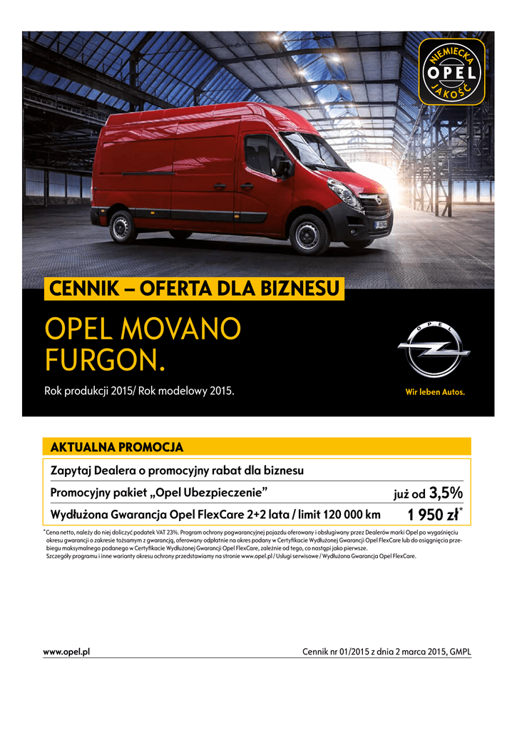 Cennik – OFERTA DLA BIZNESU OPEL MOVANO FURGON. Rok produkcji 2015/ Rok modelowy 2015. AKTUALNA PROMOCJA Zapytaj Dealera o promocyjny rabat dla biznesu już od 3,5% Promocyjny pakiet „Opel Ubezpieczenie” Wydłużona Gwarancja Opel FlexCare 2+2 lata / limit 120 000 km 1 950 zł* *Cena netto, należy do niej doliczyć podatek VAT 23%. Program ochrony pogwarancyjnej pojazdu oferowany i obsługiwany przez Dealerów marki Opel po wygaśnięciu okresu gwarancji o zakresie tożsamym z gwarancją, oferowany odpłatnie na okres podany w Certyfikacie Wydłużonej Gwarancji Opel FlexCare lub do osiągnięcia przebiegu maksymalnego podanego w Certyfikacie Wydłużonej Gwarancji Opel FlexCare, zależnie od tego, co nastąpi jako pierwsze. Szczegóły programu i inne warianty okresu ochrony przedstawiamy na stronie www.opel.pl / Usługi serwisowe / Wydłużona Gwarancja Opel FlexCare. www.opel.pl Cennik nr 01/2015 z dnia 2 marca 2015, GMPL Cennik – Opel Movano Furgon z pojedynczą kabiną/z podwójną kabiną, rok produkcji 2015, rok modelowy 2015 Oferta dla biznesu (zł netto*) Modele i wersje 2.3 CDTI 110 KM** 2.3 CDTI 125 KM 2.3 CDTI 135 KM S/S 2.3 CDTI 150 KM MA6 2.3 CDTI 165 KM S/S zł netto* zł netto* zł netto* zł netto* zł netto* L1H1 FWD 2,8t M6 83 000 86 049 89 301 – 92 350 L1H1 FWD 3,3t M6/MA6 1 , 2 85 0333 88 0813 91 3333 –/103 3253 , 2 94 3823 L1H1 FWD 3,5t M6/MA6 1 , 2 86 6593 89 7073 92 9593 –/104 9513 , 2 96 0083 L1H2 FWD 2,8t M6 84 463 87 512 90 764 – 93 813 L1H2 FWD 3,3t M6/MA6 1 , 2 86 4963 89 5453 92 7973 –/104 7893 , 2 95 8463 L1H2 FWD 3,5t M6/MA6 1 88 1223 91 1713 94 4233 99 0983 97 4723 L2H2 FWD 3,3t M6/MA6 1 87 3093 90 3583 93 6103 98 2853 96 6593 L2H2 FWD 3,5t M6/MA6 1 88 9353 91 9843 95 2363 99 9113 98 2853 L2H3 FWD 3,3t M6/MA6 1 89 748 92 797 96 049 100 724 99 098 L2H3 FWD 3,5t M6/MA6 1 91 374 94 423 97 675 102 350 100 724 L3H2 FWD 3,5t M6/MA6 1 90 3983 93 4473 96 6993 101 3743 99 7483 L3H3 FWD 3,5t M6/MA6 1 92 837 95 886 99 138 103 813 102 187 L3H2 RWD SW 3,5t M6 – 97 0653 98 8543 – 101 8213 L3H2 RWD TW 3,5t M6 – 98 6913 100 4803 – 103 4473 L3H3 RWD TW 3,5t M6 – 101 130 102 919 – 105 886 L4H2 RWD SW 3,5t M6 – – 100 886 – 103 935 L4H2 RWD TW 3,5t M6 – 100 805 102 593 – 105 561 L4H2 RWD TW 4,5t M6 – 105 683 107 472 – 110 439 L4H3 RWD TW 3,5t M6 – 103 244 105 033 – 108 000 L4H3 RWD TW 4,5t M6 – 108 122 109 911 – 112 878 L – dostępne długości nadwozia: 1 = krótka, 2 = średnia, 3 = długa, 4 = przedłużona H – dostępne wysokości nadwozia: 1 = niska, 2 = średnia, 3 = wysoka FWD = napęd na przednie koła RWD = napęd na tylne koła SW = pojedyncze koła na osi tylnej TW = podwójne koła na osi tylnej MA6 = 6-biegowa zautomatyzowana skrzynia biegów: dopłata 4 878 zł jako opcja z silnikiem 125 KM, wyposażenie standardowe dla wersji 150 KM. Silniki ze skrzynią zautomatyzowaną dostępne tylko i wyłącznie w wersji z podwójną kabiną 3) Model dostępny z podwójną kabiną (patrz: drugi rząd siedzeń): dopłata 7 317 zł 1) 2) * Wszystkie ceny zawarte w niniejszym cenniku są rekomendowanymi cenami netto, należy do nich doliczyć podatek VAT 23%. Dokładny opis całej oferty promocyjnej znajduje się na stronie www.opel.pl w sekcji promocje lub dostępny jest u Dealerów marki Opel. Ceny promocyjne dotyczą klientów indywidualnych (detalicznych). Klientów flotowych (firmy i przedsiębiorstwa prowadzące działalność gospodarczą bądź instytucje prowadzące działalność społeczną, zarejestrowane w Polsce i rejestrujące auto na terenie Polski) w sprawie zapytań ofertowych prosimy o kontakt z wybranym Dealerem marki Opel. . Dane techniczne silników Skrzynie biegów Pojemność skokowa, cm3 Moc maksymalna, kW/KM przy obr./min Maks. moment obrotowy, Nm przy obr./min Norma emisji spalin Zużycie paliwa, cykl mieszany, l/100 km* Emisja CO2, cykl mieszany, g/km* Obowiązkowe przeglądy okresowe 2.3 CDTI 110 KM (S/S)** 2.3 CDTI 125 KM 2.3 CDTI BiTurbo 135 KM S/S 2.3 CDTI 150 KM 2.3 CDTI BiTurbo 165 KM S/S 6-biegowa manualna 6-biegowa manualna / zautomat. Easytronic® 6-biegowa manualna 6-biegowa zautomat. Easytronic® 6-biegowa manualna 2 298 2 298 2 298 2 298 2 298 81 / 110 przy 3 500 92 / 125 przy 3 500 100 / 135 przy 3 500 110 / 150 przy 3 500 120 / 165 przy 3 500 285 przy 1 250-2 000 310 przy 1 250-2 500 340 przy 1 500-2 500 350 przy 1 500-2 750 360 przy 1 500-3 000 Euro 5 Euro 5 Euro 5 Euro 5 Euro 5 7,7 – 8,0 FWD: 7,8-8,0/7,4-7,9 RWD: 8,9-9,5/ – FWD: 6,8 – 7,2 RWD: 8,1 – 8,3 8,0 – 8,3 FWD: 6,8 – 7,2 RWD: 8,1 – 8,3 201 – 213 FWD:207-213/194-206 RWD: 232-248/ – FWD: 177 – 188 RWD: 212 – 219 209 – 217 FWD: 177 – 188 RWD: 212 – 219 co 40 000 km lub 2 lata co 40 000 km lub 2 lata co 40 000 km lub 2 lata co 40 000 km lub 2 lata co 40 000 km lub 2 laa * Wszystkie informacje były aktualne w momencie publikacji materiału. Zastrzegamy sobie prawo do zmian specyfikacji produktów w dowolnym czasie. Aktualnych informacji o ofercie udzielają Autoryzowani Dealerzy marki Opel. Wszystkie dane dotyczą modeli podstawowych z wyposażeniem seryjnym. Wartości zużycia paliwa i emisji spalin dla silników spełniających normy Euro 5 zostały określone według dyrektyw WE 715/2007 i WE 692/2008 oraz 80/1268/EWG i 2004/3/WE, na podstawie oficjalnych testów w warunkach laboratoryjnych, i mierzone są dla pojazdów gotowych do jazdy, zgodnie z tymi regulacjami. Faktyczne wartości mogą różnić się od podanych w zależności od zachowania kierowcy, warunków atmosferycznych, nawierzchni, jak i innych czynników natury nietechnicznej. Dodatkowe wyposażenie może spowodować wyższe spalanie i emisję CO 2 , zwiększenie masy własnej pojazdu, a co za tym idzie nacisku na osie i jednoczesne ograniczenie ładowności pojazdu i dopuszczalnej masy całkowitej przyczepy. Może również prowadzić do zmniejszenia maksymalnej prędkości i uzyskiwanych przyśpieszeń. Zmierzone osiągi doty