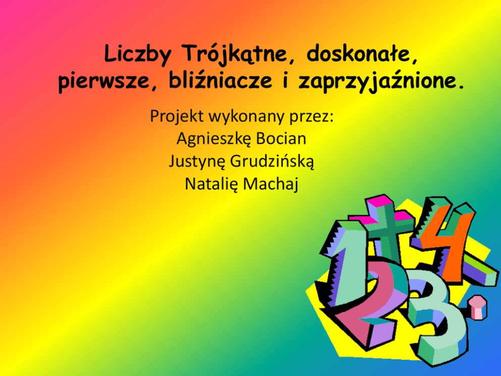Liczby Trójkątne, doskonałe, pierwsze, bliźniacze i zaprzyjaźnione. Projekt wykonany przez: Agnieszkę Bocian Justynę Grudzińską Natalię Machaj Liczby Naturalne • Liczby naturalne to liczby używane do liczenia i ustalania kolejności. Niewiedza na temat tych liczb nie przeszkadza nam się nimi posługiwać. Liczby naturalne można ustawić w ciąg nieskończony (po kolei jedna za drugą). Dysponując 1 łatwo jest otrzymywać wszystkie liczby naturalne. Zbiór tych liczb oznaczamy symbolem „N”. Zbiór liczb naturalnych jest najmniejszym, który spełnia warunek taki że „N” jest większa niż 0 Przykłady: N=0,1,2,3,4,5,6,7,8,9,… Liczby pierwsze • Liczba pierwsza – liczba naturalna, która ma dokładnie dwa dzielniki naturalne:1 i siebie samą np.: 2, 3, 5, 7, 11, 13, 17, 19, 23, 29, 31, 37, 41, 43, 47, 53, 59, 61, 67, 71, 73, 79, 83, 89, 97, itp.. Liczby Bliźniacze • Liczby Bliźniacze- są to takie liczby pierwsze, których różnica wynosi 2. • • • • • • • • • • • • • • • • • • • • 3i5 5i7 11 i 13 17 i 19 29 i 31 41 i 43 59 i 61 71 i 73 101 i 103 107 i 109 137 i 139 149 i 151 179 i 181 191 i 193 197 i 199 227 i 229 239 i 241 269 i271 281 i 283 311 i 313 Przykłady Liczby trójkątne • Liczby trójkątne- liczby, w zasadzie punkty (n), z których da się zbudować trójkąt równoboczny. Przykłady Liczby doskonałe • Liczba doskonała- to liczba naturalna, która jest sumą wszystkich swych dzielników właściwych. Najmniejszą liczbą doskonałą jest 6, ponieważ 6=3+2+1 Przykłady Następne to: 28=14+7+4+2+1 496=1+2+4+8+16+32+64+124 8128=1+2+4+8+16+32+64+127+254+508+1016+2032+4064… i kolejne 33550336, 137438691328, 230584300813952128 Liczby Zaprzyjaźnione • Liczby zaprzyjaźnione to para różnych liczb naturalnych ,takich ,że suma dzielników każdej z tych liczb równa się drugiej (nie uwzględniając tych dwóch liczb jako dzielników). Pierwszą para takich liczb , która została podana przez Pitagorasa, jest para liczb 220 i 224 ,ponieważ: • 220=1+2+4+71+142(dzielniki 284) • 284=1+2+4+5+10+11+20+22+44+55+110 (dzielnik 220) • Niewiadomo czy nie istnieje nieskończenie wiele par liczb zaprzyjaźnionych i czy istnieje taka para liczb o różnej parzystości. • Oto wszystkie pary liczb zaprzyjaźnionych, z których co najmniej jedna liczba jest mniejsza od miliona : • 220 i 284 • 1184 i 1210 • 2620 i 2924 • 5020 i 5564 • 6232 i 6368 • 1044 i 10856 • 12285 i 14595 Koniec Dziękujemy za obejrzenie naszej prezentacji ! Justyna Natalka Agnieszka