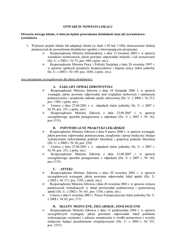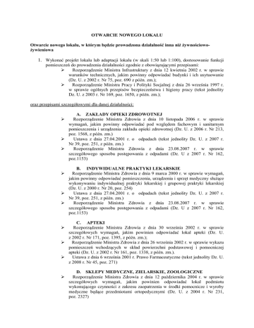 OTWARCIE NOWEGO LOKALU Otwarcie nowego lokalu, w którym będzie prowadzona działalność inna niż żywnościowożywieniowa 1. Wykonać projekt lokalu lub adaptacji lokalu (w skali 1:50 lub 1:100), dostosowanie funkcji pomieszczeń do prowadzenia działalności zgodnie z obowiązującymi przepisami: Rozporządzenie Ministra Infrastruktury z dnia 12 kwietnia 2002 r. w sprawie warunków technicznych, jakim powinny odpowiadać budynki i ich usytuowanie (Dz. U. z 2002 r. Nr 75, poz. 690 z późn. zm.); Rozporządzenie Ministra Pracy i Polityki Socjalnej z dnia 26 września 1997 r. w sprawie ogólnych przepisów bezpieczeństwa i higieny pracy (tekst jednolity Dz. U. z 2003 r. Nr 169, poz. 1650, z późn. zm.); oraz przepisami szczegółowymi dla danej działalności: A. ZAKŁADY OPIEKI ZDROWOTNEJ Rozporządzenie Ministra Zdrowia z dnia 10 listopada 2006 r. w sprawie wymagań, jakim powinny odpowiadać pod względem fachowym i sanitarnym pomieszczenia i urządzenia zakładu opieki zdrowotnej (Dz. U. z 2006 r. Nr 213, poz. 1568, z późn. zm.) Ustawa z dnia 27.04.2001 r. o odpadach (tekst jednolity Dz. U. z 2007 r. Nr 39, poz. 251, z późn. zm.) Rozporządzenie Ministra Zdrowia z dnia 23.08.2007 r. w sprawie szczegółowego sposobu postępowania z odpadami (Dz. U z 2007 r. Nr 162, poz.1153) B. INDYWIDUALNE PRAKTYKI LEKARSKIE Rozporządzenie Ministra Zdrowia z dnia 9 marca 2000 r. w sprawie wymagań, jakim powinny odpowiadać pomieszczenia, urządzenia i sprzęt medyczny służące wykonywaniu indywidualnej praktyki lekarskiej i grupowej praktyki lekarskiej (Dz. U. z 2000 r. Nr 20, poz. 254) Ustawa z dnia 27.04.2001 r. o odpadach (tekst jednolity Dz. U. z 2007 r. Nr 39, poz. 251, z późn. zm.) Rozporządzenie Ministra Zdrowia z dnia 23.08.2007 r. w sprawie szczegółowego sposobu postępowania z odpadami (Dz. U z 2007 r. Nr 162, poz.1153) C. APTEKI Rozporządzenie Ministra Zdrowia z dnia 30 września 2002 r. w sprawie szczegółowych wymagań, jakim powinien odpowiadać lokal apteki (Dz. U. z 2002 r. Nr 171, poz. 1395, z późn. zm.); Rozporządzenie Ministra Zdrowia z dnia 26 września 2002 r. w sprawie wykazu pomieszczeń wchodzących w skład powierzchni podstawowej i pomocniczej apteki (Dz. U. z 2002 r. Nr 161, poz. 1338, z późn. zm.). Ustawa z dnia 6 września 2001 r. Prawo Farmaceutyczne (tekst jednolity Dz. U. z 2008 r. Nr 45, poz. 271) D. SKLEPY MEDYCZNE, ZIELARSKIE, ZOOLOGICZNE Rozporządzenie Ministra Zdrowia z dnia 12 października 2004 r. w sprawie szczegółowych wymagań, jakim powinien odpowiadać lokal podmiotu wykonującego czynności z zakresu zaopatrzenia w środki pomocnicze i wyroby medyczne będące przedmiotami ortopedycznymi (Dz. U. z 2004 r. Nr 231, poz. 2327) E. ZAKŁADY FRYZJERSKIE, KOSMETYCZNE, TATUAŻU I ODNOWY BIOLOGICZNEJ (Fryzjerzy, Solaria, Kosmetyczki, Siłownie, Zakłady Odnowy Biologicznej itp.) Rozporządzenie Ministra Zdrowia z dnia 17 lutego 2004 r. w sprawie szczegółowych wymagań sanitarnych, jakim powinny odpowiadać zakłady fryzjerskie, kosmetyczne, tatuażu i odnowy biologicznej (Dz. U. z 2004 r. Nr 31, poz. 273) F. HOTELE I INNE OBIEKTY, W KTÓRYCH ŚWIADCZONE SĄ USŁUGI HOTELARSKIE Rozporządzenie Ministra Gospodarki i Pracy z dnia 19 sierpnia 2004 r. w sprawie obiektów hotelarskich i innych obiektów, w których są świadczone usługi hotelarskie (tekst jednolity Dz. U. z 2006 r. Nr 22, poz. 169) G. MAGAZYNOWANIE I SPRZEDAŻ ŚRODKÓW OCHRONY ROŚLIN Rozporządzenie Ministra Rolnictwa i rozwoju Wsi z dnia 24 czerwca 2002 r. w sprawie bezpieczeństwa i higieny pracy przy stosowaniu i magazynowaniu środków ochrony roślin oraz nawozów mineralnych i organiczno-mineralnych (Dz. U. z 2002 r. Nr 99, poz. 896 z późn. zm.) H. PUBLICZNE I NIEPUBLICZNE SZKOŁY I PLACÓWKI Rozporządzenie Ministra Edukacji Narodowej i Sportu z dnia 31 grudnia 2002 r. w sprawie bezpieczeństwa i higieny w publicznych i niepublicznych szkołach i placówkach (Dz. U. z 2003 r., Nr 6, poz. 69) I. ZESPOŁY I PUNKTY PRZEDSZKOLNE Rozporządzenie Ministra Edukacji Narodowej z dnia 10.01.2008 r. w sprawie rodzajów innych form wychowania przedszkolnego, warunków tworzenia i organizowania tych form oraz sposobu ich działania (Dz. U. z 2008 r. Nr 7, poz. 38, z późn. zm.) J. PRALNIE I FARBIARNIE Rozporządzenie Ministra Gospodarki z dnia 27 kwietnia 2000 r. w sprawie bezpieczeństwa i higieny pracy w pralniach i farbiarniach (Dz. U. z 2000 r. Nr 40, poz. 469) 2. Uzgodnić projekt pod względem wymogów higieniczno-zdrowotnych przez Państwowego Powiatowego Inspektora Sanitarnego w Bełchatowie lub Rzeczoznawcę ds. sanitarnohigienicznych 3. Wykonać adaptacje pomieszczeń zgodnie z projektem adaptacji posiadającym uzgodnienie sanitarno-higieniczne. 4. Złożyć wniosek o wydanie opinii o spełnieniu wymagań higieniczno-sanitarnych dla prowadzenia działalności.