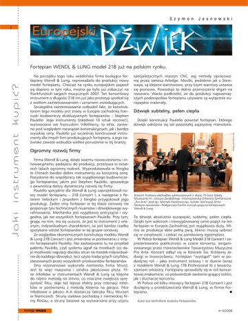 S z y m o n J a s n o w s k i 2 Na początku tego roku wiedeńska firma budująca fortepiany Wendl & Lung, wprowadziła do produkcji nowy model fortepianu. Chociaż na rynku europejskim pojawił się dopiero w tym roku, można go było już zobaczyć na frankfurckich targach muzycznych 2007. Ten koncertowy instrument o długości 218 cm już jako prototyp spotkał się z wielkim zainteresowaniem i uznaniem zwiedzających. Szczególne zainteresowanie wzbudził fakt, że konstruktorem tego modelu jest znany w Europie zachodniej francuski budowniczy ekskluzywnych fortepianów – Stephen Paulello. Jego instrumenty (zaledwie 10 sztuk rocznie!), wytwarzane we francuskim Villethierry, to elita, zarówno pod względem rozwiązań konstrukcyjnych, jak i bardzo wysokiej ceny. Paulello już wcześniej konstruował instrumenty dla innych firm produkujących fortepiany, a jego nazwisko zawsze wzbudza wielkie poruszenie w tej branży. specjalistycznych maszyn CNC, wg metody opracowanej przez Jamesa Arledge. Mostki, podobnie jak u Steinwaya, są klejone warstwowo, przy czym warstwy ustawia się pionowo. Powoduje to dobre przenoszenie drgań na rezonans. Warto podkreślić, że do produkcji najważniejszych podzespołów fortepianu używane są wyłącznie europejskie materiały. Dźwięk subtelny, pełen ciepła Dzięki konstrukcji Paulello powstał fortepian, którego dźwięk odróżnia się od pozostałej azjatyckiej monotonii. Fot. Krzysztof Pałasz Jaki instrument kupiæ? Fortepian WENDL & LUNG model 218 już na polskim rynku. Ogromny rozwój firmy Firma Wendl & Lung, dzięki swemu nowoczesnemu i innowacyjnemu podejściu do produkcji, przeżywa w ostatnich latach ogromny rozkwit. Wyprodukowała w Ningbo w Chinach bardzo dobre instrumenty za korzystną cenę. Pozyskanie do współpracy tak wyjątkowego budowniczego fortepianów, jakim jest Stephen Paulello, spowoduje z pewnością dalszy dynamiczny rozwój tej firmy. Paulello specjalnie dla Wendl & Lung zaprojektował nowy model fortepianu – 218 Concert I, a następnie z Peterem Veleckym i zespołem z Ningbo przygotował jego produkcję. Żaden inny fortepian w tej klasie cenowej nie proponuje tylu technicznych niuansów i dźwiękowego wyrafinowania. Mechanika jest wyjątkowo precyzyjna i wygodna, jak we wszystkich fortepianach Paulello. Przy tym, grając na nim, ma się uczucie, że jest to instrument z własnym, indywidualnym charakterem, co jest bardzo rzadko spotykane wśród fortepianów w tej grupie cenowej. Ze względów ekonomicznych konstrukcja modelu Wendl & Lung 218 Concert I jest zmieniona w porównaniu z innymi fortepianami Paulello. Nie zastosowano tu na przykład patentu Paulello, czyli systemu agraf na mostkach (co daje możliwość regulacji docisku strun na mostek indywidualnie do każdego dźwięku), lecz użyto tradycyjnych sztyftów, stosowanych przez wszystkich producentów fortepianów. Dna rezonansowe wykonała niemiecka firma Strunz. Jest to więc masywna i solidna jakościowo płyta. Filce młotków w instrumentach Wendl & Lung są klejone do rdzeni metodą na zimno, co znacznie zwiększa sprężystość filcu, daje też lepsze efekty przy intonacji młotków w porównaniu z metodą klejenia na gorąco. Filce młotkowe o jakości A-A dostarcza fabryka filcu Wurzen w Niemczech. Struny stalowe pochodzą z niemieckiej firmy Röslau, a struny basowe są wytwarzane przy użyciu Koncert finałowy obchodów jubileuszowych z okazji 75-lecia Szkoły Muzycznej im. Juliusza Zarębskiego. Inowrocławska Orkiestra Symfoniczna „Pro Arte” pod dyr. Michała Nesterowicza. Solistki (od lewej) Anna Stempin-Jasnowska i Małgorzata Furche-Jurczyk grają na fortepianach Wendl & Lung. To dźwięk absolutnie europejski, subtelny, pełen ciepła. Dzięki tym walorom i niewygórowanej cenie popyt na ten fortepian w Europie Zachodniej jest wyjątkowo duży. Mimo że produkcja idzie pełną parą, klienci muszą uzbroić się w cierpliwość i czekać na zamówiony egzemplarz. W Polsce fortepian Wendl & Lung Model 218 Concert I zaprezentowano publiczności w czasie koncertu, zorganizowanego przez Inowrocławskie Towarzystwo Muzyczne Pro Arte. Koncert odbył się w Kościele Św. Królowej Jadwigi w Inowrocławiu. Fortepian “wystąpił” tam w podwójnej roli – jako instrument solowy i w duecie (wraz z modelem Wendl & Lung 178 Professional II) z towarzyszeniem orkiestry. Fortepiany sprawdziły się w roli koncertowej znakomicie, co potwierdzali zarówno grający soliści, jak i słuchacze koncertu. W Polsce od kilku miesięcy fortepian 218 Concert I jest dostępny u przedstawiciela Wendl & Lung, w firmie Fortepiano.  Autor jest technikiem budowy fortepianów. nr 4/2008