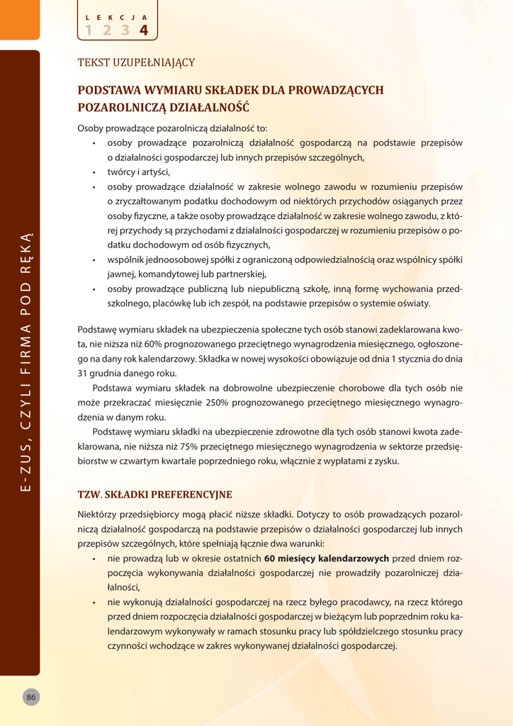 L E K C J A 1 2 3 4 TEKST UZUPEŁNIAJĄCY PODSTAWA WYMIARU SKŁADEK DLA PROWADZĄCYCH POZAROLNICZĄ DZIAŁALNOŚĆ Osoby prowadzące pozarolniczą działalność to: • osoby prowadzące pozarolniczą działalność gospodarczą na podstawie przepisów o działalności gospodarczej lub innych przepisów szczególnych, • twórcy i artyści, • osoby prowadzące działalność w zakresie wolnego zawodu w rozumieniu przepisów o zryczałtowanym podatku dochodowym od niektórych przychodów osiąganych przez E-ZUS, CZYLI FIRMA POD RĘKĄ osoby fizyczne, a także osoby prowadzące działalność w zakresie wolnego zawodu, z której przychody są przychodami z działalności gospodarczej w rozumieniu przepisów o podatku dochodowym od osób fizycznych, • wspólnik jednoosobowej spółki z ograniczoną odpowiedzialnością oraz wspólnicy spółki jawnej, komandytowej lub partnerskiej, • osoby prowadzące publiczną lub niepubliczną szkołę, inną formę wychowania przedszkolnego, placówkę lub ich zespół, na podstawie przepisów o systemie oświaty. Podstawę wymiaru składek na ubezpieczenia społeczne tych osób stanowi zadeklarowana kwota, nie niższa niż 60% prognozowanego przeciętnego wynagrodzenia miesięcznego, ogłoszonego na dany rok kalendarzowy. Składka w nowej wysokości obowiązuje od dnia 1 stycznia do dnia 31 grudnia danego roku. Podstawa wymiaru składek na dobrowolne ubezpieczenie chorobowe dla tych osób nie może przekraczać miesięcznie 250% prognozowanego przeciętnego miesięcznego wynagrodzenia w danym roku. Podstawę wymiaru składki na ubezpieczenie zdrowotne dla tych osób stanowi kwota zadeklarowana, nie niższa niż 75% przeciętnego miesięcznego wynagrodzenia w sektorze przedsiębiorstw w czwartym kwartale poprzedniego roku, włącznie z wypłatami z zysku. TZW. SKŁADKI PREFERENCYJNE Niektórzy przedsiębiorcy mogą płacić niższe składki. Dotyczy to osób prowadzących pozarolniczą działalność gospodarczą na podstawie przepisów o działalności gospodarczej lub innych przepisów szczególnych, które spełniają łącznie dwa warunki: • nie prowadzą lub w okresie ostatnich 60 miesięcy kalendarzowych przed dniem rozpoczęcia wykonywania działalności gospodarczej nie prowadziły pozarolniczej działalności, • nie wykonują działalności gospodarczej na rzecz byłego pracodawcy, na rzecz którego przed dniem rozpoczęcia działalności gospodarczej w bieżącym lub poprzednim roku kalendarzowym wykonywały w ramach stosunku pracy lub spółdzielczego stosunku pracy czynności wchodzące w zakres wykonywanej działalności gospodarczej. 86 L E K C J A 1 2 3 4 W takiej sytuacji przez pierwsze 24 miesiące kalendarzowe od dnia rozpoczęcia działalności można płacić składki na ubezpieczenia społeczne na preferencyjnych zasadach. Podstawę wymiaru składek na ubezpieczenia społeczne dla tych osób stanowi zadeklarowana kwota, nie niższa niż 30% kwoty minimalnego wynagrodzenia w danym roku. Składka zdrowotna nie podlega zasadom preferencyjnym dla osób rozpoczynających działalność. Dlatego podstawę wymiaru składki na ubezpieczenie zdrowotne będzie stanowiła kwota zadeklarowana, nie niższa niż 75% przeciętnego miesięcznego wynagrodzenia w sektorze przedsiębiorstw w czwartym kwartale poprzedniego roku, włącznie z wypłatami z zysku. Składka na ubezpieczenie zdrowotne jest miesięczna i niepodzielna. Oznacza to, że gdy osoba prowadząca pozarolniczą działalność przebywa na zasiłku chorobowym przez cały miesiąc bądź jego część, składka na ubezpieczenie zdrowotne powinna być odprowadzana za ten mie- E-ZUS, CZYLI FIRMA POD RĘKĄ siąc w pełnej wysokości. 87