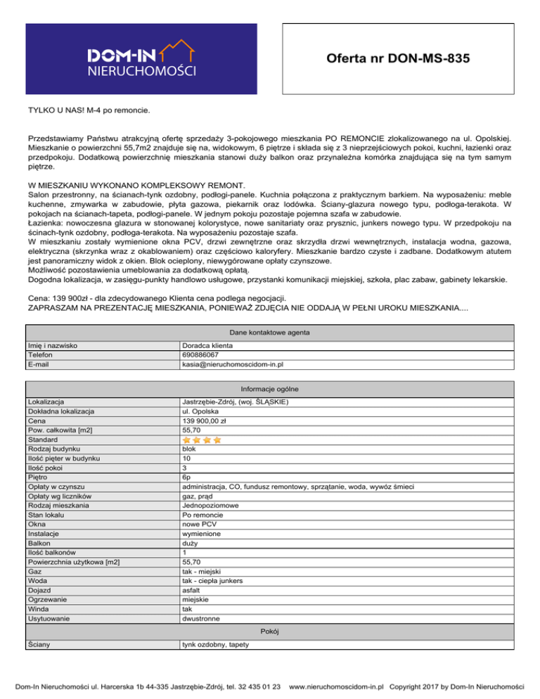 Oferta nr DON-MS-835 TYLKO U NAS! M-4 po remoncie. Przedstawiamy Państwu atrakcyjną ofertę sprzedaży 3-pokojowego mieszkania PO REMONCIE zlokalizowanego na ul. Opolskiej. Mieszkanie o powierzchni 55,7m2 znajduje się na, widokowym, 6 piętrze i składa się z 3 nieprzejściowych pokoi, kuchni, łazienki oraz przedpokoju. Dodatkową powierzchnię mieszkania stanowi duży balkon oraz przynależna komórka znajdująca się na tym samym piętrze. W MIESZKANIU WYKONANO KOMPLEKSOWY REMONT. Salon przestronny, na ścianach-tynk ozdobny, podłogi-panele. Kuchnia połączona z praktycznym barkiem. Na wyposażeniu: meble kuchenne, zmywarka w zabudowie, płyta gazowa, piekarnik oraz lodówka. Ściany-glazura nowego typu, podłoga-terakota. W pokojach na ścianach-tapeta, podłogi-panele. W jednym pokoju pozostaje pojemna szafa w zabudowie. Łazienka: nowoczesna glazura w stonowanej kolorystyce, nowe sanitariaty oraz prysznic, junkers nowego typu. W przedpokoju na ścinach-tynk ozdobny, podłoga-terakota. Na wyposażeniu pozostaje szafa. W mieszkaniu zostały wymienione okna PCV, drzwi zewnętrzne oraz skrzydła drzwi wewnętrznych, instalacja wodna, gazowa, elektryczna (skrzynka wraz z okablowaniem) oraz częściowo kaloryfery. Mieszkanie bardzo czyste i zadbane. Dodatkowym atutem jest panoramiczny widok z okien. Blok ocieplony, niewygórowane opłaty czynszowe. Możliwość pozostawienia umeblowania za dodatkową opłatą. Dogodna lokalizacja, w zasięgu-punkty handlowo usługowe, przystanki komunikacji miejskiej, szkoła, plac zabaw, gabinety lekarskie. Cena: 139 900zł - dla zdecydowanego Klienta cena podlega negocjacji. ZAPRASZAM NA PREZENTACJĘ MIESZKANIA, PONIEWAŻ ZDJĘCIA NIE ODDAJĄ W PEŁNI UROKU MIESZKANIA.... Dane kontaktowe agenta Imię i nazwisko Telefon E-mail Doradca klienta 690886067 [email protected] Informacje ogólne Lokalizacja Dokładna lokalizacja Cena Pow. całkowita [m2] Standard Rodzaj budynku Ilość pięter w budynku Ilość pokoi Piętro Opłaty w czynszu Opłaty wg liczników Rodzaj mieszkania Stan lokalu Okna Instalacje Balkon Ilość balkonów Powierzchnia użytkowa [m2] Gaz Woda Dojazd Ogrzewanie Winda Usytuowanie Jastrzębie-Zdrój, (woj. ŚLĄSKIE) ul. Opolska 139 900,00 zł 55,70 blok 10 3 6p administracja, CO, fundusz remontowy, sprzątanie, woda, wywóz śmieci gaz, prąd Jednopoziomowe Po remoncie nowe PCV wymienione duży 1 55,70 tak - miejski tak - ciepła junkers asfalt miejskie tak dwustronne Pokój Ściany tynk ozdobny, tapety Dom-In Nieruchomości ul. Harcerska 1b 44-335 Jastrzębie-Zdrój, tel. 32 435 01 23 www.nieruchomoscidom-in.pl Copyright 2017 by Dom-In Nieruchomości Oferta nr DON-MS-835 Podłogi panele Kuchnia Typ pomieszczenia Rodzaj kuchni Ściany Podłogi oddzielna z zabudową kuchenną gładzie gipsowe, glazura terakota Łazienka Typ pomieszczenia Ilość Glazura Ściany Podłogi razem z wc 1 nowego typu glazura terakota Przedpokój Ilość Ściany Podłogi 1 tynk ozdobny terakota Dom-In Nieruchomości ul. Harcerska 1b 44-335 Jastrzębie-Zdrój, tel. 32 435 01 23 www.nieruchomoscidom-in.pl Copyright 2017 by Dom-In Nieruchomości
