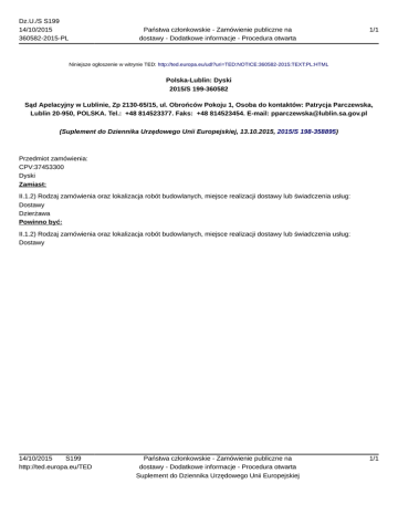 Dz.U./S S199 14/10/2015 360582-2015-PL Państwa członkowskie - Zamówienie publiczne na dostawy - Dodatkowe informacje - Procedura otwarta 1/1 Niniejsze ogłoszenie w witrynie TED: http://ted.europa.eu/udl?uri=TED:NOTICE:360582-2015:TEXT:PL:HTML Polska-Lublin: Dyski 2015/S 199-360582 Sąd Apelacyjny w Lublinie, Zp 2130-65/15, ul. Obrońców Pokoju 1, Osoba do kontaktów: Patrycja Parczewska, Lublin 20-950, POLSKA. Tel.: +48 814523377. Faks: +48 814523454. E-mail: [email protected] (Suplement do Dziennika Urzędowego Unii Europejskiej, 13.10.2015, 2015/S 198-358895) Przedmiot zamówienia: CPV:37453300 Dyski Zamiast: II.1.2) Rodzaj zamówienia oraz lokalizacja robót budowlanych, miejsce realizacji dostawy lub świadczenia usług: Dostawy Dzierżawa Powinno być: II.1.2) Rodzaj zamówienia oraz lokalizacja robót budowlanych, miejsce realizacji dostawy lub świadczenia usług: Dostawy 14/10/2015 S199 http://ted.europa.eu/TED Państwa członkowskie - Zamówienie publiczne na dostawy - Dodatkowe informacje - Procedura otwarta Suplement do Dziennika Urzędowego Unii Europejskiej 1/1