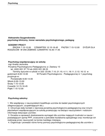 Psycholog Aleksandra Szygendowska psycholog kliniczny, trener warsztatu psychologicznego, pedagog GODZINY PRACY ŚRODA 7.15-12.00 CZWARTEK 12.15-16.45 PIĄTEK 7.15-12.00 DYŻUR DLA RODZICÓW W DNI ZEBRAŃ: CZWARTKI 16.45-17.45 Psycholog współpracujący ze szkołą: mgr Anetta Jeziorska Poradnia Psychologiczno-Pedagogiczna ul. Zawiszy 13 tel. (022) 631 57 73 lub (022) 631 08 23 Terminy dyżurów w szkole nr 222: 23.09; 7.10; 21.10; 4.11; 18.11; 2.12; 16.12 w godzinach 8.00-12.00 W Poradni Psychologiczno - Pedagogicznej nr 1 psycholog przyjmuje w: Poniedziałki 8.00-14.00 Wtorki 8.00-13.00 Środy 7.15-12.00 Czwartki 12.15-16.45 Piątki 7.15-12.00 Psycholog szkolny: 1. We współpracy z nauczycielami kwalifikuje uczniów do badań psychologicznych (diagnozujących, uzupełniających itd.); 2. Utrzymuje stały kontakt z rejonową poradnią psychologiczno-pedagogiczną oraz innymi placówkami współpracującymi ze szkołą przekazując na bieżąco nauczycielom i rodzicom informacje dotyczące uczniów; 3. Doradza w sprawach dostosowania wymagań dla uczniów mających trudności w nauce i posiadających opinię PPP, orzeczenie o potrzebie kształcenia specjalnego oraz monitoruje ich realizację przez nauczycieli na koniec każdego miesiąca; 4. Organizuje i prowadzi różne formy pomocy psychologiczno-pedagogicznej dla uczniów z 1/2 Psycholog trudnościami edukacyjnymi, społecznymi i emocjonalnymi (porady, zajęcia o charakterze terapeutycznym, o charakterze wsparcia); 5. Wspiera nauczycieli i rodziców w sprawach wychowawczych poprzez prowadzenie w czasie zebrań, konsultacji, porad oraz szkoleń tematycznych w celu zwiększenia ich kompetencji w obszarze wychowania; 6. Prowadzi interwencje, mediacje w sytuacjach kryzysowych; 7. Systematycznie i terminowo dokumentuje swoje działania przegotowując dwa razy do roku sprawozdanie z realizacji planu pracy psychologa wraz z efektami w danym roku szkolnym oraz wnioskami na nowy rok. 2/2
