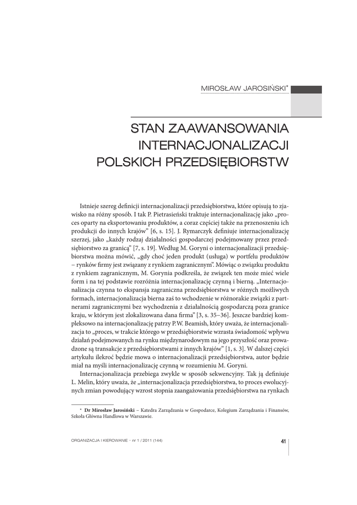 kraju, w którym jest zlokalizowana dana firma” [3, s. 35−36]. Jeszcze bardziej kompleksowo na internacjonalizację patrzy P.W. Beamish, który uważa, że internacjonalizacja to „proces, w trakcie którego w przedsiębiorstwie wzrasta świadomość wpływu