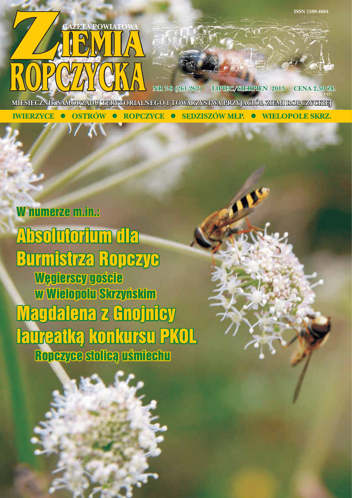 IEMIA Z ROPCZYCKA ISSN 1508-4604 GAZETA POWIATOWA NR 7-8 (261-262) LIPIEC/SIERPIEŃ 2013 CENA 2,50 ZŁ (w tym 5% VAT) MIESIĘCZNIK SAMORZĄDU TERYTORIALNEGO I TOWARZYSTWA PRZYJACIÓŁ ZIEMI ROPCZYCKIEJ IWIERZYCE l OSTRÓW l ROPCZYCE l SĘDZISZÓW MŁP. l WIELOPOLE SKRZ. W numerze m.in.: Absolutorium dla Burmistrza Ropczyc Węgierscy goście w Wielopolu Skrzyńskim Magdalena z Gnojnicy laureatką konkursu PKOL Ropczyce stolicą uśmiechu ROPCZYCE SPIS TREŚCI WIEŚCI Z MAGISTRATU ..........................................................................4-5 Andrzej Jedynak OBRADOWAŁA RADA MIEJSKA .................................................................6 • XL sesja Rady Miejskiej trenerem kadry narodowej SPOŁECZEŃSTWO I GOSPODARKA ..................................................................7-18 • Absolutorium dla burmistrza Bujaka • Wysokie odznaczenie dla Jana Kopcia • Odtworzenie infrastruktury obiektów sportowych w Ropczycach • Szansa dla żołnierzy rezerwy • OBWIESZCZENIE • Informacja o uprawnieniach wyborców niepełnosprawnych • Miejsko-Gminne Zawody SportowoPożarnicze • Przebudowa mostów • Festiwal Podkarpackich Smaków w Górnie • I Powiatowy Jarmark Produktów Lokalnych i Tradycyjnych • Aby w gospodarstwie było bezpieczniej • Wiesław Lada dyrektor Oddziału Regionalnego KRUS w Rzeszowie odpowiada na pytania zadawane przez rolników • Letni czas • Ula na wielkiej scenie • Złote gody małżeńskie Andrzej Jedynak, trener zapasów i sumo w UKS Lubzina od 1 lipca 2013 roku pełni funkcje trenera kadry narodowej młodzików oraz kadetów w sumo. Powołanie to jest docenieniem pracy trenerskiej oraz wyjątkowego zaangażowana na rzecz rozwoju tej dyscypliny. Ciąg dalszy na str. 52 MIEJSKA I POWIATOWA BIBLIOTEKA PUBLICZNA W ROPCZYCACH ........19-21 • Biblioteka poleca • Z tęsknoty piszę wiersze • Cała Polska czyta dzieciom • Słoneczne lato w bibliotece • Noc z Franklinem • Spotkanie z Joanną Olech • Życie z pasją NA KARTACH HISTORII ....................................................................................22-23 • Polityka wyznaniowa książąt Ostrogskich CENTRUM KULTURY W ROPCZYCACH ...........................................................24-26 • Plener malarski • Koncert na rynku • Dzień w zagrodzie • „Rewia” w Chorzelowie • Święto tradycyjnego grania w Gnojnicy Z PRZEDSZKOLI I SZKÓŁ GMINY ROPCZYCE ..........................................27, 30-35 • Działania integrujące w przedszkolu • Jaś i Małgosia w Lubzinie • W przedszkolu wcale nie musi być nudno • Magdalena z Gnojnicy laureatką prestiżowego konkursu PKOL • Klub bezpiecznego Puchatka • Origami w Gnojnicy • W zdrowym ciele zdrowy duch • „Najdrożsi rodzice idę dla Was z dumą przez świat ” • Zagraniczni goście w Zespole Szkół w Lubzinie • W szkołach promuje się zdrowy styl życia • Najważniejsza jest profilaktyka • I tylko pamięć została po tej lubzińskiej nocy... LICEUM OGÓLNOKSZTAŁCĄCE W ROPCZYCACH .........................................36-38 • Ropczyce stolicą uśmiechu! • Ropczyccy mistrzowie matematyki • Młodzi Europejczycy w ropczyckim liceum • Ropczyckie „hakowiczki” na gali finałowej w Warszawie • Spotkanie z wymiarem sprawiedliwości • Unijne dotacje dla ropczyckiego liceum WIADOMOŚCI Z GMINY SĘDZISZÓW MAŁOPOLSKI ..........................................38 WIADOMOŚCI Z GMINY OSTRÓW ........................................................................39 • Młodzież z zespołu Wrzos we Lwowie • Święto szkoły WIADOMOŚCI Z GMINY WIELOPOLE SKRZYŃSKIE ......................................40-45 • Węgierscy goście w Wielopolu • Koncert pamięci Stanisława Świerada • XIV Dni Wielopola Skrzyńskiego • Strażacy ochotnicy rywalizowali w zawodach • Podaj dalej • Konkurs ortograficzny • Myślę, więc czytam. Czytam, więc wiem • Obchody 58 rocznicy pożaru kina w Wielopolu Skrzyńskim WIADOMOŚCI Z ZAGORZYC .................................................................................45 • Warsztaty kulinarne z Agencją Rynku Rolnego TO I OWO ...........................................................................................................46-50 • Wakacyjne porady ogrodnicze • Morwa czarna i Jagoda acai • I Konferencja Zdrowia już za nami • Zespół przewlekłego zmęczenia. Może dlatego wyjeżdżamy na wakacje? • Z biletem relacyjnym taniej na trasie z Przemyśla do Krakowa • Antykoncepcja PTTK W ROPCZYCACH ...........................................................................................51 • Nowe inicjatywy PTTK w Ropczycach • Rajd jakiego jeszcze nie było WIADOMOŚCI SPORTOWE .............................................................................52-53 • Andrzej Jedynak trenerem kadry narodowej • Międzywojewódzkie Mistrzostwa Młodzików w Sumo • Błękitni mają już kadrę na nowy sezon • Zawodniczka z Lubziny w Pałacu Prezydenckim • Gminny finał rozgrywek piłki nożnej • Turniej Firm i Zakładów Pracy - piłka nożna IEMIA Z ROPCZYCKA GAZETA POWIATOWA ROPCZYCE 2013 Samorząd Miasta i Gminy Ropczyce zaprasza na Dożynki Gminne, które odbędą się 18 sierpnia 2013 r. w Ropczycach 15:15 Msza św. dziękczynna za zebrane plony w Sanktuarium NMP Królowej Rodzin w Ropczycach 16:30 Przejście korowodu dożynkowego na stadion RCSiR 17:30 Prezentacje wieńców dożynkowych oraz okolicznościowe przemówienia 19:00 Program artystyczny: - występy zespołów ludowych - koncert zespołu InoRos - zabawa dożynkowa W przypadku niesprzyjającej aury, uroczystości dożynkowe odbędą się w hali widowiskowo-sportowej Wydawca: Towarzystwo Przyjaciół Ziemi Ropczyckiej w Ropczycach. Nakład: 1200 egz. Zespół redakcyjny: Teresa Kiepiel – red. nacz., Elżbieta Kosydar, Agnieszka Szela, Edyta Pazdan, Piotr Skałuba, Jolanta Kaszowska, Marcin Świerad – re