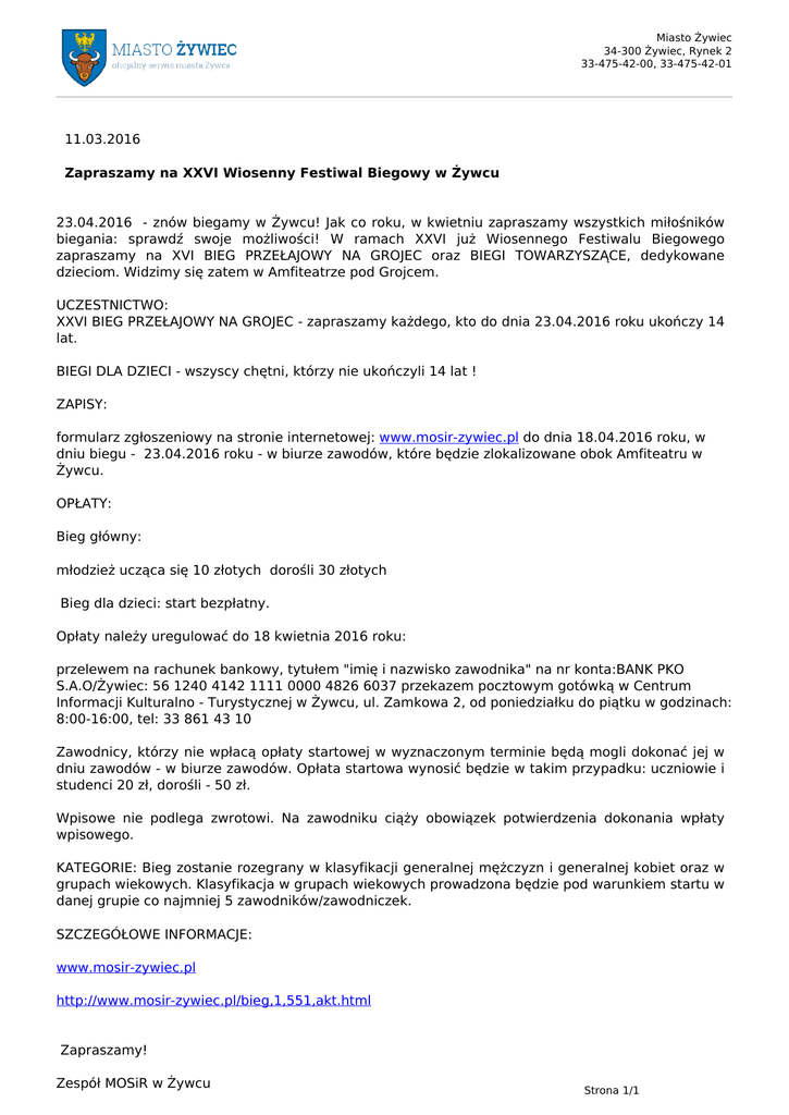 Miasto Żywiec 34-300 Żywiec, Rynek 2 33-475-42-00, 33-475-42-01 11.03.2016 Zapraszamy na XXVI Wiosenny Festiwal Biegowy w Żywcu 23.04.2016 - znów biegamy w Żywcu! Jak co roku, w kwietniu zapraszamy wszystkich miłośników biegania: sprawdź swoje możliwości! W ramach XXVI już Wiosennego Festiwalu Biegowego zapraszamy na XVI BIEG PRZEŁAJOWY NA GROJEC oraz BIEGI TOWARZYSZĄCE, dedykowane dzieciom. Widzimy się zatem w Amfiteatrze pod Grojcem. UCZESTNICTWO: XXVI BIEG PRZEŁAJOWY NA GROJEC - zapraszamy każdego, kto do dnia 23.04.2016 roku ukończy 14 lat. BIEGI DLA DZIECI - wszyscy chętni, którzy nie ukończyli 14 lat ! ZAPISY: formularz zgłoszeniowy na stronie internetowej: www.mosir-zywiec.pl do dnia 18.04.2016 roku, w dniu biegu - 23.04.2016 roku - w biurze zawodów, które będzie zlokalizowane obok Amfiteatru w Żywcu. OPŁATY: Bieg główny: młodzież ucząca się 10 złotych dorośli 30 złotych Bieg dla dzieci: start bezpłatny. Opłaty należy uregulować do 18 kwietnia 2016 roku: przelewem na rachunek bankowy, tytułem "imię i nazwisko zawodnika" na nr konta:BANK PKO S.A.O/Żywiec: 56 1240 4142 1111 0000 4826 6037 przekazem pocztowym gotówką w Centrum Informacji Kulturalno - Turystycznej w Żywcu, ul. Zamkowa 2, od poniedziałku do piątku w godzinach: 8:00-16:00, tel: 33 861 43 10 Zawodnicy, którzy nie wpłacą opłaty startowej w wyznaczonym terminie będą mogli dokonać jej w dniu zawodów - w biurze zawodów. Opłata startowa wynosić będzie w takim przypadku: uczniowie i studenci 20 zł, dorośli - 50 zł. Wpisowe nie podlega zwrotowi. Na zawodniku ciąży obowiązek potwierdzenia dokonania wpłaty wpisowego. KATEGORIE: Bieg zostanie rozegrany w klasyfikacji generalnej mężczyzn i generalnej kobiet oraz w grupach wiekowych. Klasyfikacja w grupach wiekowych prowadzona będzie pod warunkiem startu w danej grupie co najmniej 5 zawodników/zawodniczek. SZCZEGÓŁOWE INFORMACJE: www.mosir-zywiec.pl http://www.mosir-zywiec.pl/bieg,1,551,akt.html Zapraszamy! Zespół MOSiR w Żywcu Powered by TCPDF (www.tcpdf.org) Strona 1/1