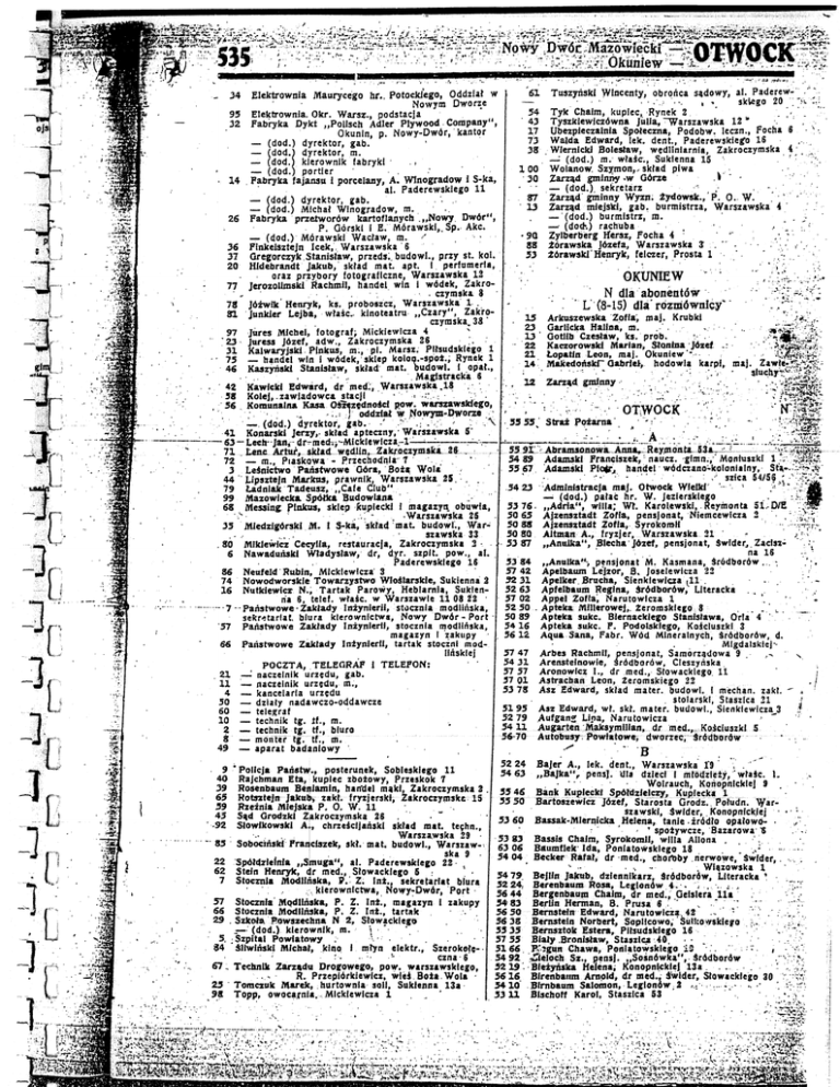 '61 Tuszyński Wincenty, obrońca sądowy, al. PaderewMaurycego hr.. Potockiego, Oddział w — ... , * skiego 20 .->«.-:,: Nowym Dworze 95 Elektrownia. Okr. Warsz., podstacja 54 Tyk Chaim, kupiec,, Rynek 2 ' 32 Fabryka Dykt „Poilsch Adler Plywood Company", 43 Tyszklewiczówna Julia, "Warszawska 12 * Okunin, p. Nowy-Dwór, kantor 17 Ubezpłeczalnia Społeczna, Podobw. leczn., Focha 6 73 Wałda Edward, lek. dent., Paderewskiego 16 — (dod.) dyrektor, gab. 38 . Wlernickł Bolesław, wędliniarnia, Zakroczymska i • ^ — (dod.) dyrektor, m. . — (dod.) m. w ł a ś c , Sukienna 15 ,V'':'\ — (dod.) kierownik fabryki .. 1 00 Wolanów. Szymon,, skład piwa — (dod.) portier 30 Zarząd gminny «w Górze .1 • 14 Fabryka fajansu i porcelany, A . Winogradów i S-ka, — (dod.). sekretarz .• al. Paderewskiego 11 87 Zarząd gminny Wyzn. Żydowsk., P. O. W. — (dod.) dyrektor, gab. 13 Zarząd miejski, gab. burmistrza, Warszawska 4 — (dod.) Michał Winogradów, m. — (dod.) burmistrzem. ' . j ' 26 Fabryka przetworów kartoflanych .„Nowy. Dwór", — (dod*.) rachuba . .. P. Górski i E. Morawski,. Sp. Akc. • 90 Zylberberg Hersz, Focha 4 ' . " —- (dod.) Morawski Wacław, m. •' . - •• • 88 żórawska Józefa, Warszawska Z . 36 Finkelsztejn Icek,. Warszawska 6 53 żórawski'Henryk, felczer, Prosta 1 37 Gregorczyk.Stanisław, przeds.. budowl., przy st. kol. 20 Hidebrandt Jakub, skład mat. apt. i perfumeria, oraz przybory fotograficzne, Warszawska 12 OKUNIEW '\; 77 Jerozolimski Ftachmil, handel win i wódek, ZakroN dla abonentów "vv^^i . czymska 3 78 Jóźwik'Henryk, ks. proboszcz, Warszawska 1 . ' L (8-15) dla' rozmównicy^ - T / 31 Junkier Lejba, w ł a ś c kinoteatru „Czary", Zakro 15 Arkuszewska Zofia', maj. Krubki '• ? czymska, 38' 23 Garlicka Halina, m. , : .. •Ä*-S' '' ''*^-'97 Jüres Michel, fotograf; Mickiewicza 4 1 3 ' Gotlib Czesław, ks. prob. '23 Juress Józef, adw., Zakroczymska 28 - 22 Kaczorowski Marian, Słonina Józef. 31 Kalwaryjski. Pinkus, m., pi. Marsz. Piłsudskiego 1 21 Łop&tln Leon, maj. Okuniew* • 75 — handel win i wódek, sklep kolon.-spoż., Rynek 1 14 MakedońskP Gabriel, hodowla karpi, maj. 46 Kaszyński Stanisław, skład mat. budowl. i opał., siuchr^^l^ . . . • Magistracka 6 12 Zarząd gminny 42 Kawlcki Edward, dr med;, Warszawska .18 . 58 Kolej,.zawiadowca stacji 56 Komunalna Kasa Oszczędności pow. warszawskiego, OTWOCK .. j oddział w Nowym-Dworze : —.(dod.) dyrektor, gab. .;' •• . • A | 55 55 Straż Pożarna 41 Konarski Jerzy,, skład apteczny,-Warszawska 5 — — 6 3 - Lech- Jan, d f ~ m e d v j H V U ć k i e w f c ż a l — ~ 55 91' Abramsonowa Anna, Reymonta 53a, 7 1 Lenc A r t t t i , skład wędlin, ZakiQ^zymsk^M, : 54 39 Adamski Franciszek, naucz, gimn.,' Moniuszki 72 — m., Piaskowa - Przechodnia 7 . 55 67 Adamski PiofTj handel wódczano-kofonialny, S t ą - . ö ^ r 3 Leśnictwo Państwowe Góra, Boża Woła - : v szica 54/56 ; 44 Lipsztejn Markus, prawnik, Warszawska 25. . 54 23 Administracja maj. Otwock Wielki ' 79 Ładnlak Tadeusz, „Cafe Club" — (dod.) pałac hr. W. Jezierskiego 99 Mazowiecka. Spółka Budowlana 53 76. „ A d r i a " , willa; Wł. Karolewski,. Reymonta 51.. D/E 68 Messing pinkus, sklep kupiecki i magazyn obuwia, 50 65 Ajzensztadt Zofia, pensjonat, Niemcewicza 2 • • , . .V/arszawska 25 50 83 Ajzensztadt Zofia, Syrokomli 35 Miedzigórski M . 1 S-ka, skład mat. budowl,, War50 80 Altman A., fryzjer, Warszawska 21 ... '/•-.. szawska 33 53 87 „Anulka", Blecha Józef, pensjonat, świder,. Zacisz . 80 Mikiewicz Cecylia, restauracja, Zakroczymska 2 • na 16 6 Nawaduński Władysław, dr, dyr. szolL pow., al. 53 84 „Anulka* -, pensjonat M. Kasmana, Śródborów... Paderewskiego 16 57 42 Apelbaum Lejzor, B, Joselewicza 22 86 Neufeld Rubin, Mickiewicza 3 52 31 Apelker. Brucha, Sienkiewicza l l . 74 Nowodworskie Towarzystwo Wioślarskie, Sukienna 2 52 63 Apfelbaum Regina, śródborów,' Literacka 16 Nutkiewicz N . , Tartak Parowy, Heblarnia, Sukien 57 02 Appel Zofia', Narutowicza 1 na 6, telef. właśc. w Warszawie 11 08 22 • 52 50 . Apteka MilleroweJ,. Żeromskiego 8 ---7 - Państwowe- Zakłady Inżynierii, stocznia modlińska, sekretariat, biura kierownictwa, Nowy D w ó r - P o r t 50 39 Apteka sukc. Biernackiego Stanisława, Orla 4 57 Państwowe Zakłady Inżynierii, stocznia modlińska, 54 16 Apteka sukc. F. Podolskiego, Kościuszki 3 magazyn i zakupy 56 12 Aąua Sana, Fabr. Wód Mineralnych, śródborów, d. 66 Państwowe Zakłady Inżynierii, tartak stoczni mod . •• Mlgdalskiej'. lińskiej 57 47 Arbes Rachmil, pensjonat, Samorządowa 9 54 31 Arensteinowie, śródborów, Cieszyńska POCZTA, TELEGRAF 1 TELEFON; 57 57 Aronowicz I . , dr med., Słowackiego 11 . 21 —' naczelnik urzędu, gab. 57 01 Astrachan Leon, Żeromskiego 22 11 — naczelnik urzędu, m., 53 78 Asz Edward, skład mater. budowl. i mechan. zakł. 4 — kancelaria urzędu stolarski, Staszica 21 50 — działy nadawczo-oddawcze 5195 Asz Edward, wL skł. mater. budowl., Sienkiewicza 3 60 — telegraf 52 79 Aufgan* Lipa, Narutowicza 10 — technik tg. tf., m. 54 11 Augarten Maksymilian, dr med., Kościuszki 5 2 — technik tg. tf., biura 56 70 Autobusy. Powiatowe, dworzec, Śródborów Ś — monter tg. tf., m. .... 49 — aparat badaniowy 34 OJS Elektrownia ; ".i^^Ż < : r : : -3 -~3 c 1 t ß 52 24 Bajer A., lek. dent., Warszawska 19 , . 9 "Policja Państw., posterunek, Sobieskiego 11 54 63 „ B a j k a " , pens], dla dzieci i młodzieży, właśc. L 40 Rajchman Eta, kupiec zbożowy, Przeskok 7 • Wolrauch, Konopnickiej 9 39 Rosenbaum Beniamin, handel mąki. Zakroczymska 2 . 55 46 Bank Kupiecki Spółdzielczy, Kupiecka 1 65 RotsziejnJaku% zakł. fryzjerskf, Zakroczymska 15 Bartoszewicz Józef, Starosta Grodź. Połudn. War 55 50 39 Rzeźnia Miejska P. O. W. 11 szawski, świder, Konopnickiej 45 Sąd Grodzki Zakroczymska 28 . 53 60 Bassak-MIernicka Helena, tanie-źródło opałowo- • -92 Słowikowski A