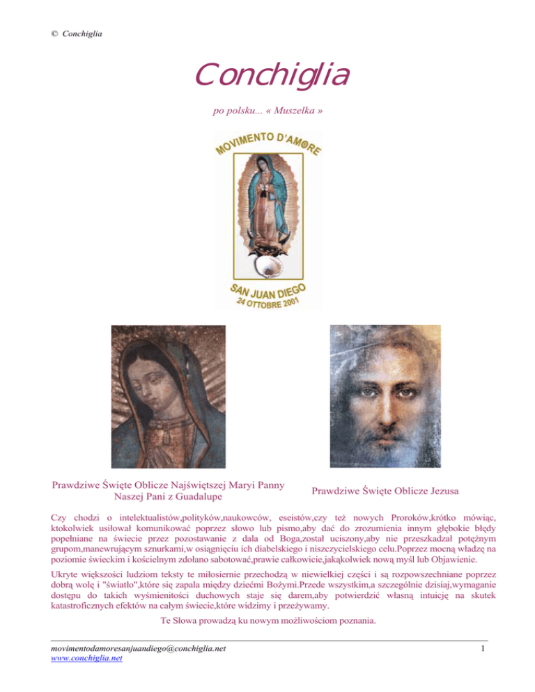 © Conchiglia Conchiglia po polsku... « Muszelka » Prawdziwe Święte Oblicze Najświętszej Maryi Panny Naszej Pani z Guadalupe Prawdziwe Święte Oblicze Jezusa Czy chodzi o intelektualistów,polityków,naukowców, eseistów,czy też nowych Proroków,krótko mówiąc, ktokolwiek usiłował komunikować poprzez słowo lub pismo,aby dać do zrozumienia innym głębokie błędy popełniane na świecie przez pozostawanie z dala od Boga,został uciszony,aby nie przeszkadzał potężnym grupom,manewrującym sznurkami,w osiągnięciu ich diabelskiego i niszczycielskiego celu.Poprzez mocną władzę na poziomie świeckim i kościelnym zdołano sabotować,prawie całkowicie,jakąkolwiek nową myśl lub Objawienie. Ukryte większości ludziom teksty te miłosiernie przechodzą w niewielkiej części i są rozpowszechniane poprzez dobrą wolę i "światło",które się zapala między dziećmi Bożymi.Przede wszystkim,a szczególnie dzisiaj,wymaganie dostępu do takich wyśmienitości duchowych staje się darem,aby potwierdzić własną intuicję na skutek katastroficznych efektów na całym świecie,które widzimy i przeżywamy. Te Słowa prowadzą ku nowym możliwościom poznania. [email protected] www.conchiglia.net 1 © Conchiglia WITAJ MÓJ PANIE BENTORNATO MIO SIGNORE Perły Miłości Bóg Ojciec ... i J.Ś. Papież Jan Paweł II do Conchiglii 03 kwiecień 2005 - 12.45 Dzień poświęcony Bożemu Miłosierdziu “ Człowiek Boga,który jest obok ciebie... teraz może mówić do ciebie z Mojej Woli. TO JA, OJCIEC.” “ Tak Conchiglio to ja... to ja, Karol... TWÓJ KOCHANY OJCIEC ŚWIĘTY JAN PAWEŁ I Z WOLI BOŻEJ MOGĘ SIĘ KOMUNIKOWAĆ Z TOBĄ. Bardzo stawiano ci przeszkody,córko... ale,jak widzisz,wszystko jest możliwe u Boga. To jest mój list do ciebie i do świata. To list ognisty to list poplamiony moją krwią i twoją krwią która jest tą samą krwią Chrystusa Jezusa. [email protected] www.conchiglia.net 2 © Conchiglia Zanim mogliśmy mówić poprzez ten sposób Ojciec pozwolił,żebym przyszedł do ciebie we śnie aby poddać próbie twoją pokorę duchową aż wewnątrz twej podświadomości. « Nagle mnie ujrzałaś... jak szedłem przechodząc przez wielką salę. Ta sala przedstawiała przedsionek stacji kolejowej i ja zamierzałem wsiąść do pociągu. Ty...nieustraszona i jednocześnie zdziwiona ... przybliżyłaś się pochwyciłaś moją rękę,aby ją ucałować i uklękłaś,aby otrzymać moje błogosławieństwo. NIE ZOSTAWIŁAŚ JUŻ MOJEJ RĘKI PODNIOSŁAŚ SIĘ I ODPROWADZIŁAŚ MNIE WSIADAJĄC ZE MNĄ DO POCIĄGU,MÓWIĄC JEDYNIE: JESTEM CONCHIGLIA. Mogłaś opowiedzieć mi co pragnęłaś... o sobie i co uważałaś za stosowne jednak ty usiadłaś u moich stóp w ciszy po tym jak ofiarowałaś mi szklankę wody. » Polecono ci napisać to aby dać do zrozumienia znaczenie duchowej pokory tym dzieciom,które zawsze usiłują wystawić się na pokaz... zwłaszcza w ważnych okazjach. A teraz powróćmy do mojego « listu ognia i krwi » ale wezwij jeszcze raz Ducha Świętego. TYLKO TWÓJ BISKUP MÓGŁ UMOŻLIWIĆ NASZE SPOTKANIE ALE NIE UCZYNIŁ TEGO! I TERAZ TO JA... SPOTKAŁEM SIĘ Z TOBĄ POPRZEZ OJCA. Moje ogniste słowa zdziwią ale Krew Chrystusa,która nas łączy,jest Boska i Krew Boska... powinna być chroniona powinna być broniona powinna być strzeżona powinna być adorowana przez wszystkie dieci Ziemi. Boska Krew to Cud Miłości (1) TO TRANSUBSTANCJACJA i cały świat ma uklęknąć teraz... W TYM DNIU POŚWIĘCONYM BOŻEMU MIŁOSIERDZIU aby prosić Boga o Miłosierdzie (2) za każdy typ grzechu osobistego i społecznego. Jedynie prosząc z pokorą o Miłosierdzie można będzie uniknąć niektórych nieszczęść które wkrótce spadną na Ziemię i na Ludzkość. [email protected] www.conchiglia.net 3 © Conchiglia I kto nie uwierzy w Miłosierdzie Boże (3) będzie walczyć twarzą w twarz z diabłem tracąc z hukiem... okazję powrotu do Boga. Mocny jest diabeł. JEST NA KRAWĘDZI DRZWI OD POKOJU MOJEGO NASTĘPCY! Zdołał dotrzeć aż tam. Czy wiecie jak zdołał dojść... tak,że nikt nie zdawał sobie z tego sprawy? Myślicie o różnych intrygach? Służba bezpieczeństwa? Nic z tych rzeczy! WSZEDŁ SPOKOJNIE I BEZ PRZESZKÓD PONIEWAŻ TEN,KTO KROCZY OBOK NIEGO NIE POTRAFI GO ROZPOZNAĆ,GDYŻ NIE JEST W STANIE ŁASKI BOŻEJ. Faktycznie indywidualna Łaska Boża jest największą ochroną,jaka może istnieć przeciw której diabeł nic nie może zrobić poza tym,co mu jest zezwolone przez Ojca... aby poddać próbie Jego wybrane dziecko. Teraz Conchiglio... nareszcie mam okazję pobłogosławić wszystkich stąd, z Nieba i w tę Świętą Niedzielę Pańską (4) razem z Najdostojniejszą Trójcą z ze Świętą Matką Maryją... błogosławię was w Imię Ojca Matki Syna i Ducha Świętego i wychwalam ... Ojca Matkę Syna i Ducha Świętego. Amen.” (1) Cud Eucharystyczny,który wydarzył się o godzinie 15.00, 23 maja 2003r. w miejscowości Ostina - Florencja, Włochy. (2) Odniesienie do « OBJAWIENIA » przekazanego Conchiglii: 05 kwiecień 2002r. - 17.40 - Jezus Pierwszy piątek miesiąca poświęcony Najświętszemu Sercu "… OJCIEC GORĄCO PRAGNIE SERCA CZŁOWIEKA. To dlatego pozwala On nawet... żeby człowiek popełniał błędy. Serce człowieka musi zwrócić się do Ojca,mówiąc: « Boże Miłosierny... zlituj się nad tym człowiekiem,który stoi naprzeciw Ciebie. zlituj się nad tym człowiekiem,który ciągle błądzi. [email protected] www.conchiglia.net 4 © Conchiglia Zmiłuj się za każdym razem kiedy widzisz moje błędy i dopomóż mi kochać Cię i doświadczyć... doskonałej skruchy za wszystkie moje grzechy,które Cię obraziły. Boże... zlituj się nade mną. Dio... zmiłuj się nad tym biednym grzesznikiem który szuka Twojej pomocy, albowiem w Tobie pokłada nadzieję i Tobie ufa. Amen. » Otóż Conchiglio... to jest święta modlitwa na cześć Nieskończonego Miłosierdzia Bożego. Ta modlitwa jest d