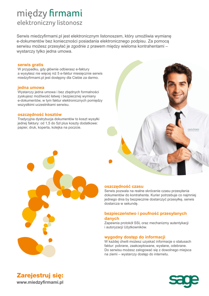między firmami elektroniczny listonosz Serwis miedzyfirmami.pl jest elektronicznym listonoszem, który umożliwia wymianę e-dokumentów bez konieczności posiadania elektronicznego podpisu. Za pomocą serwisu możesz przesyłać je zgodnie z prawem między wieloma kontrahentami – wystarczy tylko jedna umowa. serwis gratis W przypadku, gdy głównie odbierasz e-faktury a wysyłasz nie więcej niż 5 e-faktur miesięcznie serwis miedzyfirmami.pl jest dostępny dla Ciebie za darmo. jedna umowa Wystarczy jedna umowa i bez zbędnych formalności zyskujesz możliwość łatwej i bezpiecznej wymiany e-dokumentów, w tym faktur elektronicznych pomiędzy wszystkimi uczestnikami serwisu. oszczędność kosztów Tradycyjna dystrybucja dokumentów to koszt wysyłki jednej faktury: od 1,5 do 5zł plus koszty dodatkowe: papier, druk, koperta, kolejka na poczcie. między firmami elektroniczny listonosz oszczędność czasu Serwis pozwala na realne skrócenie czasu przesyłania dokumentów do kontrahenta. Kurier potrzebuje co najmniej jednego dnia by bezpiecznie dostarczyć przesyłkę, serwis dostarcza w sekundę. bezpieczeństwo i poufność przesyłanych danych Zapewnia protokół SSL oraz mechanizmy autentykacji i autoryzacji Użytkowników. wygodny dostęp do informacji W każdej chwili możesz uzyskać informacje o statusach faktur: pobrane, zaakceptowane, wysłane, odebrane. Do serwisu możesz zalogować się z dowolnego miejsca na ziemi – wystarczy dostęp do internetu. Zarejestruj się: www.miedzyfirmami.pl między firmami elektroniczny listonosz Aktualne wersje Systemu Zarządzania Forte, Systemu Symfonia i Symfonia Start zostały przystosowane do zaawansowanej współpracy z serwisem i zapewniają: Pełną integrację procesów biznesowych z serwisem: od momentu wystawienia faktury, poprzez jej wysłanie, odebranie, akceptację, zadekretowanie po zaksięgowanie. To wszystko w ramach pracy w aplikacji, bez potrzeby uruchamiania narzędzi zewnętrznych (strona www, poczta e-mail, dodatkowe oprogramowanie). Dodatkowe korzyści dla naszych klientów Możliwość mapowania użytkowników oprogramowania z użytkownikami serwisu. Automatyczną aktualizację danych o kontrahentach przystępujących do serwisu. Kontrolę wykorzystania wykupionych pakietów podczas wysyłki dokumentów. Bezbłędne wprowadzenie danych o dokumencie w systemie informaty– cznym odbiorcy. dzy firmami niczny listonosz Zarejestruj się: www.miedzyfirmami.pl