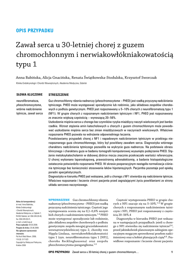 OPIS PRZYPADKU Zawał serca u 30‑letniej chorej z guzem chromochłonnym i nerwiakowłókniakowatością typu 1 Anna Babińska, Alicja Gnacińska, Renata Świątkowska‑Stodulska, Krzysztof Sworczak Klinika Endokrynologii i Chorób Wewnętrznych, Akademia Medyczna, Gdańsk SŁOWA KLUCZOWE STRESZCZENIE neurofibromatoza, pheochromocytoma, wtórne nadciśnienie tętnicze, zawał serca Guz chromochłonny rdzenia nadnerczy (pheochromocytoma – PHEO) jest rzadką przyczyną nadciśnienia tętniczego. PHEO może występować sporadycznie lub rodzinnie, jako składowa zespołów chorobo‑ wych o podłożu genetycznym. PHEO jest rozpoznawany u 5–10% chorych z neurofibromatozą typu 1 (NF1). W grupie chorych z rozpoznanym nadciśnieniem tętniczym i NF1, PHEO jest rozpoznawany ze znacznie większą częstością – wynoszącą 20–56%. Uszkodzenie mięśnia serca u chorego bez czynników ryzyka miażdżycy naczyń wieńcowych jest bardzo rzadkie. Wzrost stężenia amin katecholowych u chorych z guzem chromochłonnym może powodo‑ wać uszkodzenie mięśnia serca bez zmian miażdżycowych w naczyniach wieńcowych. Właściwe rozpoznanie PHEO pozwala na wdrożenie odpowiedniego leczenia. Przedstawiamy przypadek chorej z NF1 i napadowym nadciśnieniem tętniczym w przebiegu nie‑ rozpoznanego guza chromochłonnego, który był powikłany zawałem serca. Diagnostyka wtórnego charakteru nadciśnienia tętniczego pozwoliła na wykrycie guza nadnercza. Na podstawie obrazu klinicznego i charakteru guza w badaniu tomografii komputerowej wysunięto podejrzenie PHEO. Stę‑ żenie metoksykatecholamin w dobowej zbiórce moczu znacznie przekraczało wartości referencyjne. U chorej wykonano laparoskopową, prawostronną adrenalektomię, a badanie histopatologiczne ostatecznie potwierdziło rozpoznanie PHEO. W okresie pooperacyjnym nastąpiła normalizacja ciśnie‑ nia tętniczego bez konieczności stosowania leków hipotensyjnych. Pacjentka pozostaje pod opieką poradni specjalistycznych. Diagnostyka w kierunku PHEO jest wskazana, jeśli u chorego z NF1 stwierdza się nadciśnienie tętnicze. Właściwe rozpoznanie i leczenie chroni pacjenta przed zagrażającymi życiu powikłaniami ze strony układu sercowo‑naczyniowego. Adres do korespondencji: dr med. Anna Babińska, Klinika Endokrynologii i Chorób Wewnętrznych, Akademia Medyczna, ul. Dębinki 7, 78-952 Gdańsk, tel: 058‑349‑28‑40, fax: 058‑349‑28‑41, e‑mail: [email protected] Praca wpłynęła: 04.03.2008. Przyjęta do druku: 25.06.2008. Nie zgłoszono sprzeczności interesów. Pol Arch Med Wewn. 2008; 118 (9): 517-523 Copyright by Medycyna Praktyczna, Kraków 2008 WPROWADZENIE Guz chromochłonny rdzenia nadnerczy (pheochromocytoma – PHEO) jest rzadką przyczyną nadciśnienia tętniczego. Częstość jego występowania ocenia się na 0,1–0,6% wszyst‑ kich chorych z nadciśnieniem tętniczym.1-4 PHEO może występować sporadycznie lub rodzinnie, jako składowa zespołów chorobowych o podłożu genetycznym: zespołu mnogiej gruczolakowatości wewnątrzwydzielniczej typu 2, choroby von Hippla‑Lindaua, nerwiakowłókniakowatości typu 1 (syn. neurofibromatoza typu 1 [NF1], choroba Recklinghausena) oraz zespołu pheochromocytoma‑paraganglioma.1-3 Częstość występowania PHEO w grupie cho‑ rych z NF1 szacuje się na 5–10%.1- 3 W grupie chorych z rozpoznanym nadciśnieniem tętni‑ czym i NF1, PHEO jest rozpoznawany z często‑ ścią 20–56%.4 Diagnostyka w kierunku PHEO jest wskaza‑ na w następujących przypadkach: jeżeli u chore‑ go z NF1 stwierdza się nadciśnienie tętnicze2,4 , przed jakimkolwiek planowanym zabiegiem ope‑ racyjnym mogącym sprowokować przełom nadci‑ śnieniowy oraz u kobiet planujących ciążę4,5 . Pra‑ widłowe rozpoznanie i leczenie chroni pacjenta OPIS PRZYPADKU Zawał serca u 30‑letniej chorej z guzem chromochłonnym… 1 RYCINA 1 Tomografia komputerowa jamy brzusznej. W prawym nadnerczu masa patolo‑ giczna o wymia‑ rach 57×57×42 mm, o niejednorodnej struktu‑ rze, ulegająca wzmocnie‑ niu po podaniu kontrastu 2 przed zagrażającymi życiu powikłaniami ze stro‑ ny układu sercowo-naczyniowego.4,5 OPIS PRZYPADKU Przedstawiamy przypadek 30-letniej pacjentki z NF1 rozpoznaną w 2001 roku. W wywiadach stwierdzono u niej występujące od 1,5 roku napadowe nadciśnienie, ze wzrostem wartości ciśnienia skurczowego >200 mm Hg (niezależnie od wysiłku fizycznego, posiłku czy sy‑ tuacji stresowych), z towarzyszącym bólem głowy, uczuciem kołatania serca, bladością skóry, wymi‑ otami oraz drżeniem kończyn górnych. Objawy te pojawiały się u chorej mniej więcej raz w tygodniu. Zgodnie z podaną przez pacjentkę informacją, nie zażywała ona amfetaminy ani kokainy. Z powodu nadciśnienia tętniczego chorą le‑ czono inhibitorem konwertazy angiotensyny. Od 5 miesięcy była również leczona z powodu objawów sugerujących padaczkę (preparaty kwa‑ su walproinowego). Pacjentkę hospitalizowano w pozaakademic‑ kim oddziale kardiologii, gdzie została przyjęta z powodu silnych dolegliwości bólowych za most‑ kiem z promieniowaniem do okolicy między łopatkowej, z towarzyszącym drętwieniem i drże‑ niem kończyn górnych, z dusznością, wymiotami oraz wzrostem wartości ciśnienia tętniczego (RR) do 230/100 mm Hg. W badaniu przedmiotowym stwierdzono na skórze całego ciała liczne plamy koloru kawy z mlekiem (café au lait) oraz guzki skórno‑podskórne, o utkaniu nerwiakowłóknia‑ ków w badaniu histopatologicznym wykonanym kilka lat wcześniej. Wywiad rodzinny w kierunku NF1 był negatywny. W badaniu EKG stwierdzono: rytm zatokowy 100/min, zakłócony rytmem komorowym, z ze‑ społami QS w odprowadzeniach V1 i V2 oraz unie‑ sieniem odcinka ST w odprowadzeniach V2 i V3. Stężenie troponiny I w surowicy było zwiększone (0,33 ng/ml, norma: do 0,01 ng/ml). Na podsta‑ wie wywiadu i badań laboratoryjnych nie stwier‑ 