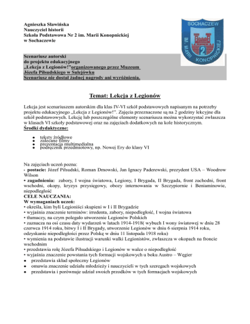 Agnieszka Sławińska Nauczyciel historii Szkoła Podstawowa Nr 2 im. Marii Konopnickiej w Sochaczewie Scenariusz autorski do projektu edukacyjnego „Lekcja z Legionów!”organizowanego przez Muzeum Józefa Piłsudskiego w Sulejówku Scenariusz nie dostał żadnej nagrody ani wyróżnienia. Temat: Lekcja z Legionów Lekcja jest scenariuszem autorskim dla klas IV-VI szkół podstawowych napisanym na potrzeby projektu edukacyjnego „Lekcja z Legionów!”. Zajęcia przeznaczone są na 2 godziny lekcyjne dla szkół podstawowych. Lekcję lub poszczególne elementy scenariusza można wykorzystać zwłaszcza w klasach VI szkoły podstawowej oraz na zajęciach dodatkowych na kole historycznym. Środki dydaktyczne: teksty źródłowe zalecane filmy prezentacja multimedialna podręcznik przedmiotowy, np. Nowej Ery do klasy VI Na zajęciach uczeń pozna: • postacie: Józef Piłsudski, Roman Dmowski, Jan Ignacy Paderewski, prezydent USA – Woodrow Wilson • zagadnienia: zabory, I wojna światowa, Legiony, I Brygada, II Brygada, front zachodni, front wschodni, okopy, kryzys przysięgowy, obozy internowania w Szczypiornie i Beniaminowie, niepodległość CELE NAUCZANIA: W wymaganiach uczeń: • określa, kim byli Legioniści skupieni w I i II Brygadzie • wyjaśnia znaczenie terminów: irredenta, zabory, niepodległość, I wojna światowa • tłumaczy, na czym polegało utworzenie Legionów Polskich • zaznacza na osi czasu daty wydarzeń w latach 1914-1918( wybuch I wony światowej w dniu 28 czerwca 1914 roku, bitwy I i II Brygady, utworzenie Legionów w dniu 6 sierpnia 1914 roku, odzyskanie niepodległości przez Polskę w dniu 11 listopada 1918 roku) • wymienia na podstawie ilustracji warunki walki Legionistów, zwłaszcza w okopach na froncie wschodnim • przedstawia rolę Józefa Piłsudskiego i Legionów w walce o niepodległość • wyjaśnia znaczenie powstania tych formacji wojskowych u boku Austro – Węgier przedstawia skład społeczny Legionów omawia znaczenie udziału młodzieży i nauczycieli w tych szeregach wojskowych przedstawia i porównuje udział swoich przodków w tych formacjach wojskowych Uczniowie doskonalą umiejętności; pracy z mapą analizy różnego typu źródeł, w tym fotograficznych i ikonograficznych pracy indywidualnej i zbiorowej Metody i formy pracy: analiza źródeł ikonograficznych – praca z ikonografią praca indywidualna i zbiorowa – praca z tekstami źródłowymi rozmowa nauczająca prezentacja Dodatkowe materiały: zdjęcia mapa prezentacja multimedialna I. WSTĘP Na wstępie nauczyciel przybliża uczniom temat lekcji – lekcję zaczyna od poproszenia o przeczytania tekstu źródłowego w zmodułu wstęp. Każdy uczeń idnywidualnie odpowiada na pytania źródłowe zamieszczone pod tekstem i wspólnie z nauczycielem omawia na forum klasy. Nauczyciel podkreśla, że odzyskanie niepodległości nie było możliwe bez utworzenia polskich formacji wojskowych pod auspicjami Austro – Węgier. Prowadzący krótko przedstawia sytuację międynarodową oraz trzech najważniejszych działaczy: Romana Dmowskiego, Jana Ignacego Padrewskiego oraz Józefa Piłsudskiego i ich wizje na wywaleczeniw wolności. II. ROZWINIĘCIE Następnie prowadzący dzieli klasę na grupy, dobierając teksty indywidualnie do potrzeb uczniów. Grupy mogą konsultować się z nauczycielem, korzystać z dostępnej prezentacji multimedialnej, mogą prowadzić rozmowy ze sobą. III. ZAKOŃCZENIE Na zakończenie nauczyciel wraz z uczniami podsumowuje lekcje – każda z grup dokonuje prezentacji swoich osiągnięć, w połączeniu z wyświetlaną przez nauczyciela prezentacją multimedialną. Każda grupa wypełnia swoją kartę pracy – jest to bardzo ważne dla uzyskania efektu końcowego. Nauczyciel cały czas jest aktywny, podsumowuje każde wystąpienie i pomaga dzieciom przy przedstawianiu swojej pracy dotyczącej konkretnego problemu poruszanego w module. Praca domowa może być dowolnie zadana. Prowadzący w tym przypadku zadał odnalezienie w historii rodzinnej przodków, którzy walczyli w Legionach – prentacja osiągnięć nastąpi na kółku historycznym (może nastąpić na następnej lekcji). MODUŁ - WSTĘP Andrzej Ajenkiel, Romana Dmowskiego i Józefa Piłsudskiego spór o Polskę w: „Do niepodległości. Wizje – drogi – spełnienie”, Pod Red. Wojciecha Wrzesińskiego, Wydawnictwo Sejmowe, Warszawa 1998, s. 216. Piłsudski od końca lipca 1914 r. mobilizował strzelców i drużyniaków, którzy mu się też podporządkowali. Próbując dokonać analizy posunięć Józefa Piłsudskiego w tym okresie , zwrócić trzeba uwagę na dwa pokrywające się kierunki. Pierwszy, to choćby dążenie do symbolicznego rzucenia na szalę wydarzeń polskiego czynu zbrojnego. Pierwszy historyczny rozkaz wydany przez Józefa Piłsudskiego brzmiał: „Żołnierze! […] Spotkał was ten zaszczyt niezmierny, że pierwsi pójdziecie do Królestwa i przestąpicie granicę rosyjskiego zaboru, jako czołowa kolumna wojska polskiego, idącego walczyć za oswobodzenie ojczyzny [..] wszyscy jesteście równi wobec ofiar, jakie ponieść macie”. Oznaczał on, że Komendant widzi w I Kompani Kadrowej samodzielną polską siłę wojskową walczącą o oswobodzenie ziem zaboru rosyjskiego. Piłsudski liczył, że uda mu się samodzielnie utrzymać na choćby maleńkim skrawku Królestwa, dzięki czemu mógłby uzyskać bazę do dalszych działań, co zarazem wzmocni jego pozycję wobec Austriaków, traktowanych przezeń od początku jako sojusznik z konieczności. Temu samemu celowi - uniezależnienia się zarówno od Austriaków, jak i galicyjskiej bazy politycznej – posłużyło pewne posunięcie (podobno zamierzone jako rzeczywiste), które stało się ostatecznie mającą krótki żywot polityczną mistyfikacją. Chodzi o odezwę informującą, iż w Warszawie utworzył się Rząd Narodowy, który mianował Piłsudskiego Komendantem polskich sił zbrojnych. […]