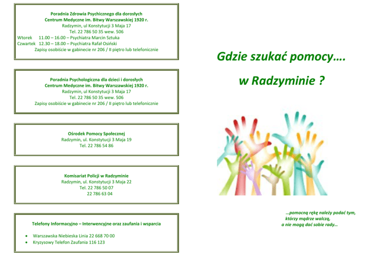 Poradnia Zdrowia Psychicznego dla dorosłych Centrum Medyczne im. Bitwy Warszawskiej 1920 r. Radzymin, ul Konstytucji 3 Maja 17 Tel. 22 786 50 35 wew. 506 Wtorek 11.00 – 16.00 – Psychiatra Marcin Sztuka Czwartek 12.30 – 18.00 – Psychiatra Rafał Osiński Zapisy osobiście w gabinecie nr 206 / II piętro lub telefonicznie Gdzie szukać pomocy…. Poradnia Psychologiczna dla dzieci i dorosłych Centrum Medyczne im. Bitwy Warszawskiej 1920 r. Radzymin, ul Konstytucji 3 Maja 17 Tel. 22 786 50 35 wew. 506 Zapisy osobiście w gabinecie nr 206 / II piętro lub telefonicznie w Radzyminie ? Ośrodek Pomocy Społecznej Radzymin, ul. Konstytucji 3 Maja 19 Tel. 22 786 54 86 Komisariat Policji w Radzyminie Radzymin, ul. Konstytucji 3 Maja 22 Tel. 22 786 50 07 22 786 63 04 Telefony Informacyjno – Interwencyjne oraz zaufania i wsparcia Warszawska Niebieska Linia 22 668 70 00 Kryzysowy Telefon Zaufania 116 123 …pomocną rękę należy podać tym, którzy mądrze walczą, a nie mogą dać sobie rady… Gminna Komisja ds. Rozwiązywania Problemów Alkoholowych Radzymin, ul Letnia 15 Tel. 22 243 05 47 Środa 15.00 – 19.00 Pełnomocnik Burmistrza ds. Rozwiązywania Problemów Alkoholowych Radzymin, ul Letnia 15 Tel. 22 243 05 47 Środa 11.00 – 19.00 Piątek 11.00 – 16.00 Grupy Wsparcia „Al. – Anon” Radzymin, ul Letnia 15 Tel. 22 243 05 47 Punkt Informacyjno – Konsultacyjny Instruktor terapii uzależnień mgr Joanna Lis Radzymin, ul Letnia 15 Tel. 22 243 05 47 Piątek 14.00 – 16.00 – Telefon zaufania / Indywidualne spotkania Piątek 16.00 – 20.00 – Spotkania grupowe (współuzależnieni) Punkt Informacyjno – Konsultacyjny dla rodzin Radzymin, ul Letnia 15 Tel. 22 243 05 47 Sobota 9.00 – 15.00 – Psycholog, Seksuolog kliniczny mgr Monika Stachura Sobota 8.00 – 14.00 – Pedagog, Socjoterapeuta mgr Beata Michalik Terminy spotkań ustalane telefonicznie Grupy Wsparcia „AA” Radzymin, ul Letnia 15 Tel. 22 243 05 47 Poniedziałek 18.00 – 20.00 Czwartek 17.00 – 19.00 Niedziela 17.00 – 19.00 / Mityng otwarty Punkt Informacyjno – Konsultacyjny dla osób uzależnionych Terapeuta mgr Mariusz Smerkowski Radzymin, ul Letnia 15 Tel. 22 243 05 47 Wtorek 14.00 – 16.00 – Telefon zaufania / Indywidualne spotkania Wtorek 16.00 – 19.00 – Spotkania grupowe Wtorek 17.00 – 19.00 Punkt Informacyjno – Konsultacyjny dla osób nieradzących sobie z emocjami Terapeuta Adam Dulnik Radzymin, ul Letnia 15 Tel. 22 243 05 47 Poniedziałek 17.00 – 20.00 Bezpłatne Porady Prawne mgr prawa Karol Boński Radzymin, ul Letnia 15 Tel. 22 243 05 47 Czwartek 17.00 – 20.00 – Dwa pierwsze czwartki w miesiącu Program Wzmacniania Rodzin „ Miłość i Granice” Bezpłatne zajęcia dla dzieci i młodzieży Radzymin, ul Letnia 15 Tel. 22 243 05 47 Środa 16.00 – 19.00 Sobota 12.00 – 16.00