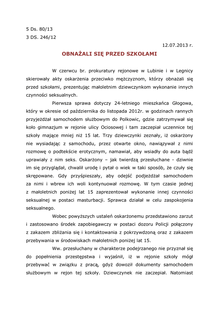 5 Ds. 80/13 3 DS. 246/12 12.07.2013 r. OBNAŻALI SIĘ PRZED SZKOŁAMI W czerwcu br. prokuratury rejonowe w Lubinie i w Legnicy skierowały akty oskarżenia przeciwko mężczyznom, którzy obnażali się przed szkołami, prezentując małoletnim dziewczynkom wykonanie innych czynności seksualnych. Pierwsza sprawa dotyczy 24-letniego mieszkańca Głogowa, który w okresie od października do listopada 2012r. w godzinach rannych przyjeżdżał samochodem służbowym do Polkowic, gdzie zatrzymywał się koło gimnazjum w rejonie ulicy Ociosowej i tam zaczepiał uczennice tej szkoły mające mniej niż 15 lat. Trzy dziewczynki zeznały, iż oskarżony nie wysiadając z samochodu, przez otwarte okno, nawiązywał z nimi rozmowę o podtekście erotycznym, namawiał, aby wsiadły do auta bądź uprawiały z nim seks. Oskarżony – jak twierdzą przesłuchane - dziwnie im się przyglądał, chwalił urodę i pytał o wiek w taki sposób, że czuły się skrępowane. Gdy przyśpieszały, aby odejść podjeżdżał samochodem za nimi i wbrew ich woli kontynuował rozmowę. W tym czasie jednej z małoletnich poniżej lat 15 zaprezentował wykonanie innej czynności seksualnej w postaci masturbacji. Sprawca działał w celu zaspokojenia seksualnego. Wobec powyższych ustaleń oskarżonemu przedstawiono zarzut i zastosowano środek zapobiegawczy w postaci dozoru Policji połączony z zakazem zbliżania się i kontaktowania z pokrzywdzoną oraz z zakazem przebywania w środowiskach małoletnich poniżej lat 15. Ww. przesłuchany w charakterze podejrzanego nie przyznał się do popełnienia przestępstwa i wyjaśnił, iż w rejonie szkoły mógł przebywać w związku z pracą, gdyż dowoził dokumenty samochodem służbowym w rejon tej szkoły. Dziewczynek nie zaczepiał. Natomiast 2 zdarzało się, że zwracał młodzieży uwagę, że nieprawidłowo przechodzi przez jezdnię. Ww. ma średnie wykształcenie, jest bezdzietnym kawalerem, pracuje, nie był dotąd karany. Drugie postępowanie dotyczy 51-letniego mężczyzny zamieszkującego w jednej z podlegnickich wsi, o wykształceniu średnim, przed tymczasowym aresztowaniem pracującego; ojca pięciorga dorosłych dzieci. Ww. w okresie od września do 4 grudnia 2012r. w Legnicy, nieopodal gimnazjum przy ul. Chojnowskiej, w celu zaspokojenia seksualnego prezentował 9 dziewczynkom poniżej lat 15 wykonanie czynności seksualnej w postaci masturbowania. Pierwsza informacja o mężczyźnie, który jeżdżąc samochodem koło szkoły zaczepia małe dziewczynki dotarła do Policji 14 listopada 2012r., po powiadomieniu przez szkołę w związku ze zgłoszeniem jednej z uczennic. Dziewczynka doznała szoku po kontakcie ze sprawcą, była zdenerwowana i płakała. Po zdarzeniu korzystała z pomocy jest więcej, psychologa. Ustalono wówczas, że pokrzywdzonych a mężczyzna rozebrany od pasa w dół nie tylko wołał dziewczynki, aby podeszły do jego samochodu pod pozorem zapytania o jakąś pobliską ulicę, ale również kilkakrotnie stał obnażony w kilku bramach w okolicy szkoły, a na widok małoletnich masturbował się. Zaczepionych przez oskarżonego dziewcząt było co najmniej kilkanaście. 9-ciu z nich z pewnością jednak ww. prezentował wykonanie tzw. innej czynności seksualnej. Mężczyznę zatrzymano 4 grudnia 2012r. Na zabezpieczonym u niego komputerze ujawniono też ponad 1.000 zdjęć zawierających treści pornograficzne z udziałem małoletnich poniżej lat 15. Oskarżonego na wniosek prokuratora aresztowano. Sąd uchylił ww. areszt decyzją z 29 marca br. 3 W oparciu o powyższe oskarżonemu przedstawiono zarzuty. Ww. przyznał, że wielokrotnie obnażał się przed uczennicami gimnazjum. Wiedział, że dziewczynki mają mniej niż 15 lat. Przyznał też, że przeglądał strony internetowe małoletnich. zawierające Zaprzeczył jednak, treści aby pornograficzne z w dziewczynek obecności udziałem masturbował się. Wskazał, że jego zachowanie wynikało z problemów natury osobistej. Powołany w sprawie lekarz seksuolog rozpoznał u oskarżonego pedofilię z cechami ekshibicjonizmu w przebiegu choroby alkoholowej. Ww. był w chwili czynów poczytalny i może stawać przed sądem. Obu oskarżonym grozi kara od 2 do 12 lat pozbawienia wolności. Ich sprawy rozpoznają sądy rejonowe Lubinie i w Legnicy.