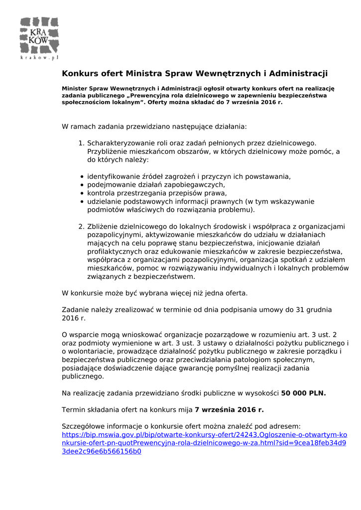 Konkurs ofert Ministra Spraw Wewnętrznych i Administracji Minister Spraw Wewnętrznych i Administracji ogłosił otwarty konkurs ofert na realizację zadania publicznego „Prewencyjna rola dzielnicowego w zapewnieniu bezpieczeństwa społecznościom lokalnym”. Oferty można składać do 7 września 2016 r. W ramach zadania przewidziano następujące działania: 1. Scharakteryzowanie roli oraz zadań pełnionych przez dzielnicowego. Przybliżenie mieszkańcom obszarów, w których dzielnicowy może pomóc, a do których należy: identyfikowanie źródeł zagrożeń i przyczyn ich powstawania, podejmowanie działań zapobiegawczych, kontrola przestrzegania przepisów prawa, udzielanie podstawowych informacji prawnych (w tym wskazywanie podmiotów właściwych do rozwiązania problemu). 2. Zbliżenie dzielnicowego do lokalnych środowisk i współpraca z organizacjami pozapolicyjnymi, aktywizowanie mieszkańców do udziału w działaniach mających na celu poprawę stanu bezpieczeństwa, inicjowanie działań profilaktycznych oraz edukowanie mieszkańców w zakresie bezpieczeństwa, współpraca z organizacjami pozapolicyjnymi, organizacja spotkań z udziałem mieszkańców, pomoc w rozwiązywaniu indywidualnych i lokalnych problemów związanych z bezpieczeństwem. W konkursie może być wybrana więcej niż jedna oferta. Zadanie należy zrealizować w terminie od dnia podpisania umowy do 31 grudnia 2016 r. O wsparcie mogą wnioskować organizacje pozarządowe w rozumieniu art. 3 ust. 2 oraz podmioty wymienione w art. 3 ust. 3 ustawy o działalności pożytku publicznego i o wolontariacie, prowadzące działalność pożytku publicznego w zakresie porządku i bezpieczeństwa publicznego oraz przeciwdziałania patologiom społecznym, posiadające doświadczenie dające gwarancję pomyślnej realizacji zadania publicznego. Na realizację zadania przewidziano środki publiczne w wysokości 50 000 PLN. Termin składania ofert na konkurs mija 7 września 2016 r. Szczegółowe informacje o konkursie ofert można znaleźć pod adresem: https://bip.mswia.gov.pl/bip/otwarte-konkursy-ofert/24243,Ogloszenie-o-otwartym-ko nkursie-ofert-pn-quotPrewencyjna-rola-dzielnicowego-w-za.html?sid=9cea18feb34d9 3dee2c96e6b566156b0 Powered by TCPDF (www.tcpdf.org)