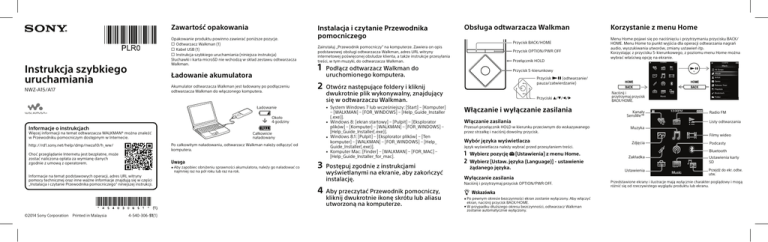 Zawartość opakowania Opakowanie produktu powinno zawierać poniższe pozycje. ÿOdtwarzacz Walkman (1) ÿKabel USB (1) ÿInstrukcja szybkiego uruchamiania (niniejsza instrukcja) Słuchawki i karta microSD nie wchodzą w skład zestawu odtwarzacza Walkman. Instrukcja szybkiego uruchamiania Instalacja i czytanie Przewodnika pomocniczego Przycisk BACK/HOME Zainstaluj „Przewodnik pomocniczy” na komputerze. Zawiera on opis podstawowej obsługi odtwarzacza Walkman, adres URL witryny internetowej poświęconej obsłudze klienta, a także instrukcje przesyłania treści, w tym muzyki, do odtwarzacza Walkman. 1 Podłącz odtwarzacz Walkman do uruchomionego komputera. 2 Otwórz następujące foldery i kliknij dwukrotnie plik wykonywalny, znajdujący się w odtwarzaczu Walkman. Ładowanie akumulatora Akumulator odtwarzacza Walkman jest ładowany po podłączeniu odtwarzacza Walkman do włączonego komputera. NWZ-A15/A17 ˎ System Windows 7 lub wcześniejszy: [Start] – [Komputer] – [WALKMAN] – [FOR_WINDOWS] – [Help_Guide_Installer (.exe)]. ˎ Windows 8: [ekran startowy] – [Pulpit] – [Eksplorator plików] – [Komputer] – [WALKMAN] – [FOR_WINDOWS] – [Help_Guide_Installer(.exe)]. ˎ Windows 8.1: [Pulpit] – [Eksplorator plików] – [Ten komputer] – [WALKMAN] – [FOR_WINDOWS] – [Help_ Guide_Installer(.exe)]. ˎ Komputer Mac: [Finder] – [WALKMAN] – [FOR_MAC] – [Help_Guide_Installer_for_mac]. Ładowanie Około 4 godziny Informacje o instrukcjach Więcej informacji na temat odtwarzacza WALKMAN® można znaleźć w Przewodniku pomocniczym dostępnym w Internecie. Całkowicie naładowany Po całkowitym naładowaniu, odtwarzacz Walkman należy odłączyć od komputera. http://rd1.sony.net/help/dmp/nwza10/h_ww/ Choć przeglądanie Internetu jest bezpłatne, może zostać naliczona opłata za wymianę danych zgodnie z umową z operatorem. Uwaga ˎAby zapobiec obniżeniu sprawności akumulatora, należy go naładować co najmniej raz na pół roku lub raz na rok. 3 Informacje na temat podstawowych operacji, adres URL witryny pomocy technicznej oraz inne ważne informacje znajdują się w części „Instalacja i czytanie Przewodnika pomocniczego” niniejszej instrukcji. 4 ©2014 Sony Corporation Printed in Malaysia 4-540-306-51(1) Obsługa odtwarzacza Walkman Postępuj zgodnie z instrukcjami wyświetlanymi na ekranie, aby zakończyć instalację. Aby przeczytać Przewodnik pomocniczy, kliknij dwukrotnie ikonę skrótu lub aliasu utworzoną na komputerze. Przycisk OPTION/PWR OFF Przełącznik HOLD Korzystanie z menu Home Menu Home pojawi się po naciśnięciu i przytrzymaniu przycisku BACK/ HOME. Menu Home to punkt wyjścia dla operacji odtwarzania nagrań audio, wyszukiwania utworów, zmiany ustawień itp. Korzystając z przycisku 5-kierunkowego, z poziomu menu Home można wybrać właściwą opcję na ekranie. Przycisk 5-kierunkowy Przycisk àê (odtwarzanie/ pauza/zatwierdzanie) Przyciski Ă/è/î/Ô Włączanie i wyłączanie zasilania Naciśnij i przytrzymaj przycisk BACK/HOME. Kanały SensMe™ Włączanie zasilania Listy odtwarzania Przesuń przełącznik HOLD w kierunku przeciwnym do wskazywanego przez strzałkę i naciśnij dowolny przycisk. Wybór języka wyświetlacza Muzyka Filmy wideo Zdjęcia Język wyświetlacza należy wybrać przed przesyłaniem treści. 1 2 Wybierz pozycję Radio FM [Ustawienia] z menu Home. Wybierz [Ustaw. języka (Language)] - ustawienie żądanego języka. Wyłączanie zasilania Naciśnij i przytrzymaj przycisk OPTION/PWR OFF. ¼Wskazówka ˎPo pewnym okresie bezczynności ekran zostanie wyłączony. Aby włączyć ekran, naciśnij przycisk BACK/HOME. ˎW przypadku dłuższego okresu bezczynności, odtwarzacz Walkman zostanie automatycznie wyłączony. Podcasty Bluetooth Zakładka Ustawienia Ustawienia karty SD Przejdź do ekr. odtw. utw. Przedstawione ekrany i ilustracje mają wyłącznie charakter poglądowy i mogą różnić się od rzeczywistego wyglądu produktu lub ekranu. Części i elementy sterujące ̗ Gniazdo WM-PORT Do podłączania kabla USB (wchodzi w skład zestawu) lub urządzeń peryferyjnych (nie wchodzą w skład zestawu). ̘ Wyświetlacz ̙ Przycisk VOL (głośność) +*1/– Aby zwiększyć głośność, naciśnij przycisk VOL +, a aby ją zmniejszyć naciśnij przycisk VOL –. ̚ Przycisk OPTION/PWR OFF (opcje/wyłączanie zasilania) Do wyświetlania menu opcji. Naciśnięcie i przytrzymanie tego przycisku spowoduje wyłączenie ekranu i przełączenie odtwarzacza Walkman w tryb czuwania. ̛ Przełącznik HOLD ̜ Kontrolka ̝ Gniazdo karty microSD Informacje dotyczące regulacji głośności (tylko w przypadku krajów/regionów stosujących się do dyrektyw europejskich) Celem alarmu dźwiękowego i ostrzeżenia [Sprawdź poziom głośności] jest ochrona słuchu użytkownika w przypadku zwiększenia po raz pierwszy głośności powyżej poziomu szkodliwego dla słuchu. Sygnalizację dźwiękową i ostrzeżenie można anulować naciskając dowolny przycisk. Uwaga ˎGłośność można zwiększyć po anulowaniu alarmu i ostrzeżenia. ˎPo wstępnym ostrzeżeniu alarm i ostrzeżenie pojawią się ponownie po każdych 20 łącznych godzinach, w czasie których głośność przekraczała poziom szkodliwy dla słuchu. W takim przypadku głośność jest obniżana automatycznie. ˎJeśli ustawiony poziom głośności jest szkodliwy dla słuchu i odtwarzacz Walkman zostanie wyłączony, automatycznie zostanie wybrany bezpieczny poziom. Rozwiązywanie problemów Środki ostrożności Jeśli odtwarzacz Walkman nie działa zgodnie z oczekiwaniami, należy spróbować wykonać poniższe czynności w celu rozwiązania problemu. Informacje na temat praw i znaków towarowych 1 Odszukaj objawy problemu w części „Rozwiązywanie problemów” w Przewodniku pomocniczym (dokument HTML) i wypróbuj proponowane tam działania naprawcze. 2 Podłącz odtwarzacz Walkman do komputera, aby naładować akumulator. 3 Naciśnij przycisk RE