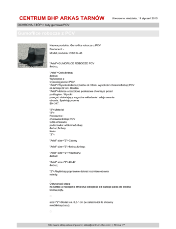 CENTRUM BHP ARKAS TARNÓW Utworzono: niedziela, 11 styczeń 2015 OCHRONA STÓP > buty gumowe/PCV Gumofilce robocze z PCV Nazwa produktu: Gumofilce robocze z PCV Producent: Model produktu: OS/014-46 "Arial">GUMOFILCE ROBOCZE PCV "Arial">Opis: Wykonane z wysokiej jakości PCV. "Arial">Wysokość butów ok 33cm, wysokość cholewki PCV ok. 22 cm. Bardzo "Arial">dobrze urzeźbiona podeszwa chroniąca przed poślizgiem. Wysoki przegub ułatwiający wygodne wkładanie i zdejmowanie obuwia. Spełniają normę EN-347. "2">Materiał "2">: Podeszwa i cholewka: PCV Góra cholewki, podszewka: włóknina Kolor "2">: "Arial" size="2">Czarny "Arial" size="2"> "Arial" size="2">Rozmiary: "Arial" size="2">40-47 "2">Aby poprawnie dobrać rozmiaru obuwia należy: Odrysować stopę na kartce a następnie zmierzyć odległość od dużego palca do środka końca pięty. size="2">Dodać ok. 0,5-1cm (w zależności ile chcemy mieć luzu). http://www.sklep.arkas-bhp.com | [email protected] | | Strona 1/7 CENTRUM BHP ARKAS TARNÓW Utworzono: niedziela, 11 styczeń 2015 OCHRONA STÓP > buty gumowe/PCV Gumofilce robocze z PCV size="2">Na podstawie otrzymanego wyniku wyszukać w naszej tabeli rozmiar obuwia. "2">TABELA ROZMIARÓW GUMOFILCÓW "WIDTH: 262pt; BORDER-COLLAPSE: collapse; mso-yfti-tbllook: 1184; mso-padding-alt: 0cm 0cm 0cm 0cm" cellspacing="0" cellpadding="0" width="349" border="0"> "HEIGHT: 26.25pt; mso-yfti-irow: 0; mso-yfti-firstrow: yes"> "BORDER-RIGHT: black 1pt solid; PADDING-RIGHT: 0cm; BORDER-TOP: black 1pt solid; PADDING-LEFT: 0cm; BACKGROUND: #c6d9f1; PADDING-BOTTOM: 0cm; BORDER-LEFT: black 1pt solid; WIDTH: 54pt; PADDING-TOP: 0cm; BORDER-BOTTOM: black 1pt solid; HEIGHT: 26.25pt" width="72"> "MARGIN: 0cm 0cm 0pt; LINE-HEIGHT: normal; TEXT-ALIGN: center" align="center"> "FONT-SIZE: 10pt; FONT-FAMILY: 'Arial','sans-serif'; mso-fareast-font-family: 'Times New Roman'; mso-fareast-language: PL"> Rozmiar buta: "FONT-SIZE: 12pt; FONT-FAMILY: 'Times New Roman','serif'; mso-fareast-font-family: 'Times New Roman'; mso-fareast-language: PL"> prefix = o ns = "urn:schemas-microsoft-com:office:office" /> "BORDER-RIGHT: black 1pt solid; PADDING-RIGHT: 0cm; BORDER-TOP: black 1pt solid; PADDING-LEFT: 0cm; BACKGROUND: #c6d9f1; PADDING-BOTTOM: 0cm; BORDER-LEFT: #c0c0c0; WIDTH: 26pt; PADDING-TOP: 0cm; BORDER-BOTTOM: black 1pt solid; HEIGHT: 26.25pt; mso-border-left-alt: solid #ECE9D8 .5pt" width="35"> "MARGIN: 0cm 0cm 10pt; LINE-HEIGHT: normal; TEXT-ALIGN: center; mso-margin-top-alt: auto; mso-margin-bottom-alt: auto" align="center"> "FONT-SIZE: 10pt; FONT-FAMILY: 'Arial','sans-serif'; mso-fareast-font-family: 'Times New Roman'; mso-fareast-language: PL"> 40 "BORDER-RIGHT: black 1pt solid; PADDING-RIGHT: 0cm; BORDER-TOP: black 1pt solid; PADDING-LEFT: 0cm; BACKGROUND: #c6d9f1; PADDING-BOTTOM: 0cm; BORDER-LEFT: #c0c0c0; WIDTH: 26pt; PADDING-TOP: 0cm; BORDER-BOTTOM: black 1pt solid; HEIGHT: 26.25pt; mso-border-left-alt: solid #ECE9D8 .5pt" width="35"> "MARGIN: 0cm 0cm 10pt; LINE-HEIGHT: normal; TEXT-ALIGN: center; http://www.sklep.arkas-bhp.com | [email protected] | | Strona 2/7 CENTRUM BHP ARKAS TARNÓW Utworzono: niedziela, 11 styczeń 2015 OCHRONA STÓP > buty gumowe/PCV Gumofilce robocze z PCV mso-margin-top-alt: auto; mso-margin-bottom-alt: auto" align="center"> "FONT-SIZE: 10pt; FONT-FAMILY: 'Arial','sans-serif'; mso-fareast-font-family: 'Times New Roman'; mso-fareast-language: PL"> 41 "BORDER-RIGHT: black 1pt solid; PADDING-RIGHT: 0cm; BORDER-TOP: black 1pt solid; PADDING-LEFT: 0cm; BACKGROUND: #c6d9f1; PADDING-BOTTOM: 0cm; BORDER-LEFT: #c0c0c0; WIDTH: 26pt; PADDING-TOP: 0cm; BORDER-BOTTOM: black 1pt solid; HEIGHT: 26.25pt; mso-border-left-alt: solid #ECE9D8 .5pt" width="35"> "MARGIN: 0cm 0cm 10pt; LINE-HEIGHT: normal; TEXT-ALIGN: center; mso-margin-top-alt: auto; mso-margin-bottom-alt: auto" align="center"> "FONT-SIZE: 10pt; FONT-FAMILY: 'Arial','sans-serif'; mso-fareast-font-family: 'Times New Roman'; mso-fareast-language: PL"> 42 "BORDER-RIGHT: black 1pt solid; PADDING-RIGHT: 0cm; BORDER-TOP: black 1pt solid; PADDING-LEFT: 0cm; BACKGROUND: #c6d9f1; PADDING-BOTTOM: 0cm; BORDER-LEFT: #c0c0c0; WIDTH: 26pt; PADDING-TOP: 0cm; BORDER-BOTTOM: black 1pt solid; HEIGHT: 26.25pt; mso-border-left-alt: solid #ECE9D8 .5pt" width="35"> "MARGIN: 0cm 0cm 10pt; LINE-HEIGHT: normal; TEXT-ALIGN: center; mso-margin-top-alt: auto; mso-margin-bottom-alt: auto" align="center"> "FONT-SIZE: 10pt; FONT-FAMILY: 'Arial','sans-serif'; mso-fareast-font-family: 'Times New Roman'; mso-fareast-language: PL"> 43 "BORDER-RIGHT: black 1pt solid; PADDING-RIGHT: 0cm; BORDER-TOP: black 1pt solid; PADDING-LEFT: 0cm; BACKGROUND: #c6d9f1; PADDING-BOTTOM: 0cm; BORDER-LEFT: #c0c0c0; WIDTH: 26pt; PADDING-TOP: 0cm; BORDER-BOTTOM: black 1pt solid; HEIGHT: 26.25pt; mso-border-left-alt: solid #ECE9D8 .5pt" width="35"> "MARGIN: 0cm 0cm 10pt; LINE-HEIGHT: normal; TEXT-ALIGN: center; mso-margin-top-alt: auto; mso-margin-bottom-alt: auto" align="center"> "FONT-SIZE: 10pt; FONT-FAMILY: 'Arial','sans-serif'; mso-fareast-font-family: 'Times New Roman'; mso-fareast-language: PL"> 44 "BORDER-RIGHT: black 1pt solid; PADDING-RIGHT: 0cm; BORDER-TOP: black 1pt solid; PADDING-LEFT: 0cm; BACKGROUND: #c6d9f1; PADDING-BOTTOM: 0cm; BORDER-LEFT: #c0c0c0; WIDTH: 26pt; PADDING-TOP: 0cm; BORDER-BOTTOM: black 1pt solid; HEIGHT: 26.25pt; mso-border-left-alt: solid #ECE9D8 .5pt" width="35"> http://www.sklep.arkas-bhp.com | [email protected] | | Strona 3/7 CENTRUM BHP ARKAS TARNÓW Utworzono: niedziela, 11 styczeń 2015 OCHRONA STÓP > buty gumowe/PCV Gumofilce robocze z PCV "MARGIN: 0cm 0cm 10pt; LINE-HEIGHT: normal; TEXT-ALIGN: center; mso-margin-top-alt: auto; mso-margin-bottom-alt: auto" align="center"> "FONT-SIZE: 10pt; FONT-FAMILY: 'Arial','sans-serif'; mso-fareast-font-family: 'Times New Roman'; mso-fareast-language: PL"> 45 "BORDER-RIGHT: black 1pt solid; PADDING-RIGHT: 0cm; BORDER-TOP: black 1pt solid; PADDING-LEFT: 0cm; BACKGROUND: #c6d9f1; PADDING-BOTTOM: 0cm; BORDER-LE