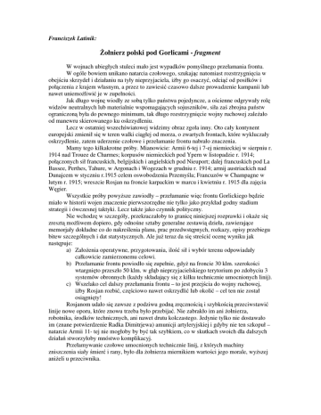 Franciszek Latinik: ołnierz polski pod Gorlicami - fragment W wojnach ubiegłych stuleci mało jest wypadków pomy lnego przełamania frontu. W ogóle bowiem unikano natarcia czołowego, szukaj c natomiast rozstrzygni cia w obej ciu skrzydeł i działaniu na tyły nieprzyjaciela, i by go osaczy , odci od posiłków i poł czenia z krajem własnym, a przez to zawiesi czasowo dalsze prowadzenie kampanii lub nawet uniemo liwi je w zupełno ci. Jak długo wojn wiodły ze sob tylko pa stwa pojedyncze, a o cienne odgrywały rol widzów neutralnych lub materialnie wspomagaj cych sojuszników, siła za zbrojna pa stw ograniczon była do pewnego minimum, tak długo rozstrzygni cie wojny ruchowej zale ało od manewru skierowanego ku oskrzydleniu. Lecz w ostatniej wszech wiatowej widzimy obraz zgoła inny. Oto cały kontynent europejski zmienił si w teren walki ci głej od morza, o zwartych frontach, które wykluczały oskrzydlenie, zatem uderzenie czołowe i przełamanie frontu nabrało znaczenia. Mamy tego kilkakrotne próby. Mianowicie: Armii 6-tej i 7-ej niemieckiej w sierpniu r. 1914 nad Trouee de Charmes; korpusów niemieckich pod Ypern w listopadzie r. 1914; poł czonych sił francuskich, belgijskich i angielskich pod Nieuport; dalej francuskich pod La Bassee, Perthes, Tahure, w Argonach i Wogezach w grudniu r. 1914; armij austriackich nad Dunajcem w styczniu r.1915 celem oswobodzenia Przemy la; Francuzów w Champagne w lutym r. 1915; wreszcie Rosjan na froncie karpackim w marcu i kwietniu r. 1915 dla zaj cia W gier. Wszystkie próby powy sze zawiodły – przełamanie wi c frontu Gorlickiego b dzie miało w historii wojen znaczenie pierwszorz dne nie tylko jako przykład godny stadium strategii i ówczesnej taktyki. Lecz tak e jako czynnik polityczny. Nie wchodz w szczegóły, przekraczałoby to granic niniejszej rozprawki i oka e si zreszt mo liwem dopiero, gdy odno ne sztaby generalne zestawi dzieła, zawieraj ce memorjały dokładne co do nakre lenia planu, prac przedwst pnych, rozkazy, opisy przebiegu bitew szczególnych i dat statystycznych. Ale ju teraz da si stre ci ocen wyniku jak nast puje: a) Zało enia operatywne, przygotowania, ilo sił i wybór terenu odpowiadały całkowicie zamierzonemu celowi. b) Przełamanie frontu powiodło si zupełnie, gdy na froncie 30 klm. szeroko ci wtargni to przeszło 50 klm. w gł b nieprzyjacielskiego terytorium po zdobyciu 3 systemów obronnych (ka dy składaj cy si z kilku technicznie umocnionych linij). c) Wszelako cel dalszy przełamania frontu – to jest przej cia do wojny ruchowej, i by Rosjan rozbi , cz ciowo nawet oskrzydli lub okoli – cel ten nie został osi gni ty! Rosjanom udało si zawsze z podziwu godn zr czno ci i szybko ci przeciwstawi linije nowe oporu, które znowu trzeba było przebija . Nie zabrakło im ani ołnierza, robotnika, rodków technicznych, ani nawet drutu kolczastego. Jedynie tylko nie dostawało im (znane potwierdzenie Radka Dimitrjewa) amunicji artyleryjskiej i gdyby nie ten szkopuł – natarcie Armii 11- tej nie mogłoby by by tak szybkiem, co w skutkach swoich dla dalszych działa stworzyłoby mnóstwo komplikacyj. Przełamywanie czołowe umocnionych technicznie linij, z których machiny zniszczenia siały mier i rany, było dla ołnierza miernikiem warto ci jego morale, wy szej ani eli u przeciwnika. Franciszek Latinik: ołnierz polski pod Gorlicami Wojna ruchowa z mo liwo ci oskrzydlenia i akcji na tyły jest łatwiejsz , albowiem w pochodzie naprzód omija si ufortyfikowane silnie odcinki, atakuj c na nieprzyjaciela w najsłabszych punktach z boku; kosztuje to wprawdzie wi cej potu, ale mniej krwi ludzkiej. a) Wynik strategiczny byłby zapewne wi kszy, gdyby Armija 4-ta austriacka mogła wcze niej sforsowa Dunajec i posuwa si pr dzej ni Armija 3-ia Boroevica. Stało si odwrotnie i dlatego X Korpus niemiecki gen. Emmicha ofensyw swoj na Dukl nie zdołał zagrozi tyłom rosyjskiego frontu karpackiego, gdy gen. Boroevic za wcze nie rozpocz ł p dzi przed sob Moskali, skutkiem czego główna ich masa uciekła. Nale y przecie wzi pod uwag , e Armija 4-ta miała trudne warunki sforsowania Dunajca i Białki i jeszcze dalsz drog ni Korpus Gwardyjski i VI Austriacki, które nie były w stanie nad y Korpusowi X. Nadto rosyjski front karpacki, flankowany przez Korpus X Emmicha, zagro ony odci ciem, zwijał si szybko, armija za Boroevica, nie chc c traci kontaktu z nieprzyjacielem, musiała mu siedzie wci na karku. Dlatego te wszelkie rozumowania i pogl dy na temat, co byłoby lepiej i co zrobi wypadało? maj tylko warto gimnastyki mózgowej w kombinacjach i rozwi zaniu tak trudnych problemów, jakich dostarcza zwykła wojna. Strategia i taktyka musz uzupełnia si wzajemnie. Cz sto przecie jest to niepodobne, gdy strategik nie mo e przewidzie zawsze wszystkich nieprzyjacielskich ruchów i zarz dze , a taktyk znów powinien wykorzysta wszelk sposobno do pobicia przeciwnika. W ofensywie spod Gorlic ka dy spełnił swój obowi zek, pocz wszy od głównego dowódcy a po piechura – nagrod ich trudu i bohaterstwa było zwyci stwo. Akt pierwszy ofensywy Mackennsena nie miał jeszcze donio lejszego znaczenia politycznego. W ka dym razie usuni to zagro enia W gier; Turcja uszła niebezpiecze stwa ekspansji armii rosyjskiej z Odessy na Bosfor, przeznaczone bowiem na ten cel siły musiano odesła do Galicji; stanowisko nieprzyjazne Rumunji doznało zmniejszenia. O Polsce wówczas w wielkim wiecie politycznym nikt zapewne jeszcze nie my lał... Jednak w duszach ołnierzy naszych, którzy, bij c si pod dowództwem austriackim, oczyszczali ziemi swoj z naje d cy, budziły si wzniosłe uczucia nadzieji, e ich krwawy znój przyczyni si do odzyskania wolno ci Ojczyzny. Tak my lał zawsze i wsz dzie i dlatego szedł tak ofiarnie ołnierz polski! Cyt. za: Klimecki Michał, Gorlice 1915, Warszawa 1991. 2