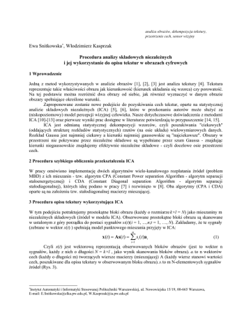 analiza obrazów, dekompozycja tekstury, przestrzenie cech, sensor wizyjny Ewa Snitkowska, Włodzimierz Kasprzak Procedura analizy składowych niezależnych i jej wykorzystanie do opisu tekstur w obrazach cyfrowych 1 Wprowadzenie Jedną z metod wykorzystywanych w analizie obrazów [1], [2], [3] jest analiza tekstury [4]. Tekstura reprezentuje takie właściwości obrazu jak kierunkowość (kierunek układania się wzorca) czy porowatość. Na tej podstawie można rozróżnić dwa obrazy od siebie, jak również wyznaczyć w danym obrazie obszary spełniające określone warunki. Zaproponowane zostanie nowe podejście do pozyskiwania cech tekstur, oparte na statystycznej analizie składowych niezależnych (ICA) [5], [6], które w przekonaniu autorów może służyć za (niskopoziomowy) model percepcji wizyjnej człowieka. Nasze dotychczasowe doświadczenia z metodami ICA [10]-[13] oraz pierwsze wyniki prac dostępne w literaturze potwierdzają to przypuszczenie [14, 15]. ICA jest odmianą statystycznej dekompozycji wzorców, czyli poszukiwania "ciekawych" (oddających strukturę rozkładów statystycznych) rzutów (na osie układu) wielowymiarowych danych. Rozkład Gaussa jest najmniej ciekawy a kierunki najmniej gaussowskie są "najciekawsze". Obszary w przestrzeni nie pokrywane przez niezależne składowe są wypełniane przez szum Gaussa - znajdując kierunki niegaussowskie znajdujemy efektywnie niezależne składowe - czyli docelowe osie przestrzeni cech. 2 Procedura szybkiego obliczenia przekształcenia ICA W pracy omówiono implementację dwóch algorytmów wielo-kanałowego rozplatania źródeł (problem MBD) z ich mieszanin - tzw. algorytm CPA (Constant Power separation Algorithm - algorytm separacji stałoenergetycznej) i CDA (Constant Diagonal separation Algorithm - algorytm separacji stałodiagonalnej), których ideę podano w pracy [7] i rozwinięto w [8]. Oba algorytmy (CPA i CDA) oparte są na założeniu tzw. stałodiagonalnej macierzy mieszającej. 3 Procedura opisu tekstury wykorzystująca ICA W tym podejściu potraktujemy prostokątne bloki obrazu (każdy o rozmiarze k×l = N) jako mieszaniny m niezależnych składowych (źródeł w modelu ICA). Obserwowane prostokątne bloki obrazu są skanowane w ustalonym z góry porządku do postaci sygnałów xi(t)(i = 1, …,n;t = 1, …, N). Zakładamy, że te sygnały (zebrane w wektor x(t) ) spełniają model punktowego mieszania przyjęty w ICA: m x (t ) As( t ) si ( t )a i (1) i 1 Czyli x(t) jest wektorową reprezentacją obserwowanych bloków obrazów (jest to wektor n sygnałów, każdy z nich o długości N = k×l , jako wynik skanowania bloków obrazu). ai to n wektorów cech (każdy o długości m) tworzących wiersze macierzy (mieszającej) A (każdy wiersz stanowi wartości cech, poszukiwane dla opisu tekstury w obserwowanym bloku obrazu). si to m N-elementowych sygnałów źródeł (Rys. 3). Instytut Automatyki i Informatyki Stosowanej Politechniki Warszawskiej, ul. Nowowiejska 15/19, 00-665 Warszawa, E-mail: [email protected], [email protected] Rysunek 3 Ilustracja składania tekstury obrazu z niezależnych składowych: xi - obserwowany i-ty blok obrazu; ai współczynniki wymieszania źródeł (tu: wartości cech obserwowanego bloku obrazu); s1, s2 ,..., sm, - źródła w ICA (ich 2-wymiarowa ilustracja) niezależne składowe (wektory bazowe). Dysponując obserwacjami danymi w postaci kolejnych bloków obrazu xi(t) stosujemy algorytm ICA pozwalający na jednoczesną estymację nieznanych niezależnych składowych s i pewnej macierzy W. Po "zamrożeniu" macierzy W określany jest ostateczny wektor wyjściowy y, taki, że: ˆs y W x; W A 1 . (2) Macierz W znaleziona w procesie "nauczenia" systemu składowych niezależnych nie jest przez nas dalej brana pod uwagę. Dopiero w fazie aktywnej pracy systemu detekcji cech tekstury celem jest ustalenie dla każdego analizowanego bloku obrazu jego wektora cech ai: m x (t ) ai s (t ) si (t )ai (3) i 1 Ten problem sprowadza się do standardowego problemu identyfikacji kanału przesyłowego o wejściu s i wyjściu x. Podsumujmy własności metody ICA w procesie opisu tekstury obrazu: (1) ICA znajduje najbardziej "nie-Gaussowską" dekompozycję obrazu; (2) funkcje bazowe (źródła s) są dopasowane do konkretnej klasy obrazów; (3) wektory si posiadają naturalną interpretację po przekształceniu ich w bloki obrazu - są detektorami krawędzi w obrazie - interesujący aspekt dla "biologicznych badań percepcji człowieka". Aby uzyskać redukcję rozmiaru przestrzeni cech w stosunku do rozmiaru oryginalnego bloku obrazu, należy zastosować obróbkę wstępną typową dla kompresji obrazu, np. w postaci PCA. Dla przykładu blok o rozmiarze 12 x 12 prowadzi do wektora obserwacji o długości 144; w procesie PCA można wybrać np. 50 największych składowych głównych, dokonać kompresji wektorów x do rozmiaru 50x1 i znaleźć w procesie ICA macierz W o rozmiarze 50 x 50. Oczywiście w celu 2-wymiarowej ilustracji wektorów bazowych (wierszy macierzy W) należy najpierw zdekomprymować każdy 50elementowy wektor do postaci 144-elementowego wektora i dopiero wtedy zamieniać je na bloki 12 x 12elementowe. 4 Testy Celem eksperymentów jest weryfikacja idei zastosowania ICA dla detekcji cech tekstur a także analiza porównawcza poprawności detekcji cech (tzn. czy odpowiednie jest "rozdzielenie" cech dla różnych tekstur i "zwartość" obszarów w przestrzeni cech odpowiadających poszczególnym teksturom) dla trzech metod: (1) macierzy spójności (standardowa metoda [9]) (2) filtracji Gabora; (3) ICA (po uprzedniej kompresji - zmianie rozdzielczości). Dla standardowego zbioru 20 tekstur danych blokami obrazu o rozmiarach 12 x 12 określiliśmy 50 funkcji bazowych (źródeł) stosując metodę FastICA (po uprzedniej kompresji wektorów danych do 50). Obrazy dla wektorów bazowych (składowych niezależnych w ICA) charakteryzują się: (1) sinusoidalną strukturą o różnych c