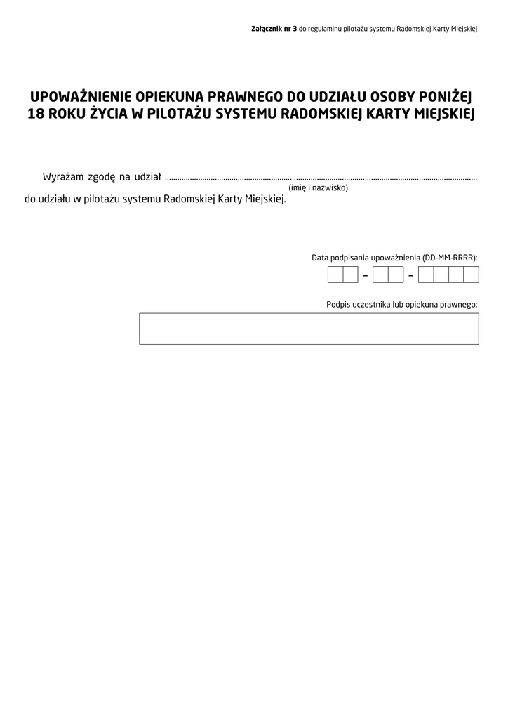 Załącznik nr 3 do regulaminu pilotażu systemu Radomskiej Karty Miejskiej UPOWAŻNIENIE OPIEKUNA PRAWNEGO DO UDZIAŁU OSOBY PONIŻEJ 18 ROKU ŻYCIA W PILOTAŻU SYSTEMU RADOMSKIEJ KARTY MIEJSKIEJ Wyrażam zgodę na udział …………………………………………………………………………………………………………………………………… (imię i nazwisko) do udziału w pilotażu systemu Radomskiej Karty Miejskiej. Data podpisania upoważnienia (DD-MM-RRRR): – – Podpis uczestnika lub opiekuna prawnego: