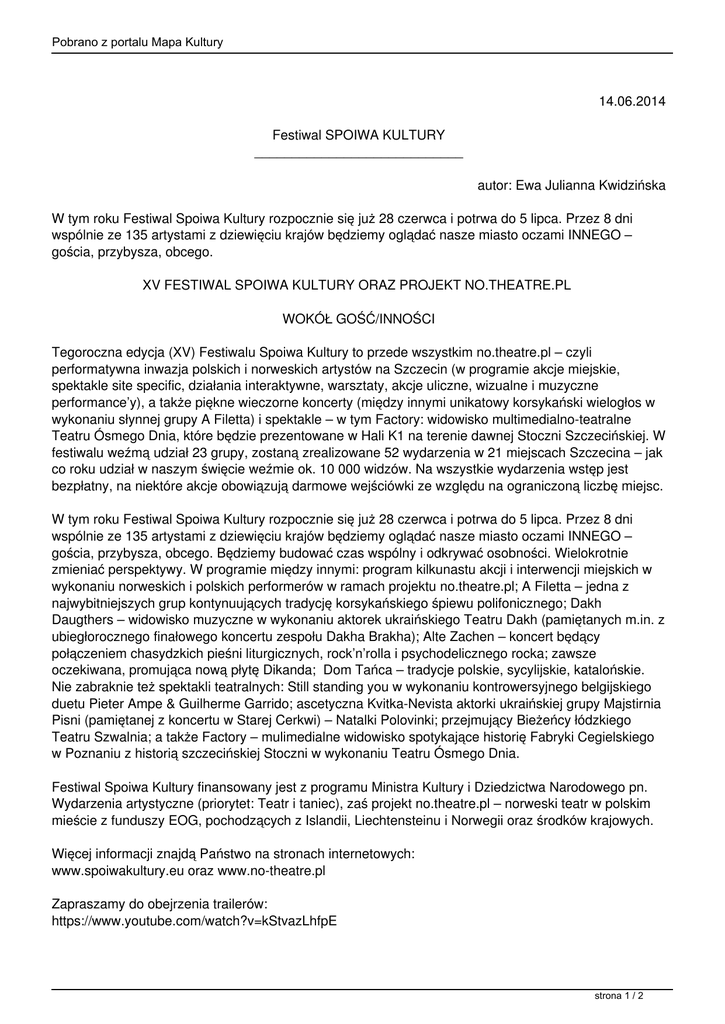 Pobrano z portalu Mapa Kultury 14.06.2014 Festiwal SPOIWA KULTURY ____________________________ autor: Ewa Julianna Kwidzińska W tym roku Festiwal Spoiwa Kultury rozpocznie się już 28 czerwca i potrwa do 5 lipca. Przez 8 dni wspólnie ze 135 artystami z dziewięciu krajów będziemy oglądać nasze miasto oczami INNEGO – gościa, przybysza, obcego. XV FESTIWAL SPOIWA KULTURY ORAZ PROJEKT NO.THEATRE.PL WOKÓŁ GOŚĆ/INNOŚCI Tegoroczna edycja (XV) Festiwalu Spoiwa Kultury to przede wszystkim no.theatre.pl – czyli performatywna inwazja polskich i norweskich artystów na Szczecin (w programie akcje miejskie, spektakle site specific, działania interaktywne, warsztaty, akcje uliczne, wizualne i muzyczne performance’y), a także piękne wieczorne koncerty (między innymi unikatowy korsykański wielogłos w wykonaniu słynnej grupy A Filetta) i spektakle – w tym Factory: widowisko multimedialno-teatralne Teatru Ósmego Dnia, które będzie prezentowane w Hali K1 na terenie dawnej Stoczni Szczecińskiej. W festiwalu weźmą udział 23 grupy, zostaną zrealizowane 52 wydarzenia w 21 miejscach Szczecina – jak co roku udział w naszym święcie weźmie ok. 10 000 widzów. Na wszystkie wydarzenia wstęp jest bezpłatny, na niektóre akcje obowiązują darmowe wejściówki ze względu na ograniczoną liczbę miejsc. W tym roku Festiwal Spoiwa Kultury rozpocznie się już 28 czerwca i potrwa do 5 lipca. Przez 8 dni wspólnie ze 135 artystami z dziewięciu krajów będziemy oglądać nasze miasto oczami INNEGO – gościa, przybysza, obcego. Będziemy budować czas wspólny i odkrywać osobności. Wielokrotnie zmieniać perspektywy. W programie między innymi: program kilkunastu akcji i interwencji miejskich w wykonaniu norweskich i polskich performerów w ramach projektu no.theatre.pl; A Filetta – jedna z najwybitniejszych grup kontynuujących tradycję korsykańskiego śpiewu polifonicznego; Dakh Daugthers – widowisko muzyczne w wykonaniu aktorek ukraińskiego Teatru Dakh (pamiętanych m.in. z ubiegłorocznego finałowego koncertu zespołu Dakha Brakha); Alte Zachen – koncert będący połączeniem chasydzkich pieśni liturgicznych, rock’n’rolla i psychodelicznego rocka; zawsze oczekiwana, promująca nową płytę Dikanda; Dom Tańca – tradycje polskie, sycylijskie, katalońskie. Nie zabraknie też spektakli teatralnych: Still standing you w wykonaniu kontrowersyjnego belgijskiego duetu Pieter Ampe & Guilherme Garrido; ascetyczna Kvitka-Nevista aktorki ukraińskiej grupy Majstirnia Pisni (pamiętanej z koncertu w Starej Cerkwi) – Natalki Polovinki; przejmujący Bieżeńcy łódzkiego Teatru Szwalnia; a także Factory – mulimedialne widowisko spotykające historię Fabryki Cegielskiego w Poznaniu z historią szczecińskiej Stoczni w wykonaniu Teatru Ósmego Dnia. Festiwal Spoiwa Kultury finansowany jest z programu Ministra Kultury i Dziedzictwa Narodowego pn. Wydarzenia artystyczne (priorytet: Teatr i taniec), zaś projekt no.theatre.pl – norweski teatr w polskim mieście z funduszy EOG, pochodzących z Islandii, Liechtensteinu i Norwegii oraz środków krajowych. Więcej informacji znajdą Państwo na stronach internetowych: www.spoiwakultury.eu oraz www.no-theatre.pl Zapraszamy do obejrzenia trailerów: https://www.youtube.com/watch?v=kStvazLhfpE strona 1 / 2 Pobrano z portalu Mapa Kultury https://www.youtube.com/watch?v=DBON5F-DNoE https://www.youtube.com/watch?v=v3QcREQ8XVU strona 2 / 2