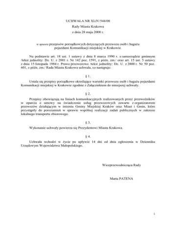 UCHWAŁA NR XLIV/544/08 Rady Miasta Krakowa z dnia 28 maja 2008 r. w sprawie przepisów porządkowych dotyczących przewozu osób i bagaŜu pojazdami Komunikacji miejskiej w Krakowie. Na podstawie art. 18 ust. 1 ustawy z dnia 8 marca 1990 r. o samorządzie gminnym /tekst jednolity: Dz. U. z 2001 r. Nr 142 poz. 1591, z późn. zm./ oraz art. 15 ust. 5 ustawy z dnia 15 listopada 1984 r. Prawo przewozowe /tekst jednolity: Dz. U. z 2000 r. Nr 50 poz. 601, z późn. zm./ Rada Miasta Krakowa uchwala, co następuje: § 1. Ustala się przepisy porządkowe określające warunki przewozu osób i bagaŜu pojazdami Komunikacji miejskiej w Krakowie zgodnie z Załącznikiem do niniejszej uchwały. § 2. Przepisy obowiązują na liniach komunikacyjnych realizowanych przez przewoźników w oparciu o umowy na świadczenie usług przewozowych zawarte z organizatorem przewozów działającym w imieniu Gminy Miejskiej Kraków oraz Miast i Gmin, które przystąpiły do porozumień w sprawie wspólnej realizacji zadań publicznych w zakresie lokalnego transportu zbiorowego. § 3. Wykonanie uchwały powierza się Prezydentowi Miasta Krakowa. § 4. Uchwała wchodzi w Ŝycie po upływie 14 dni od dnia ogłoszenia w Dzienniku Urzędowym Województwa Małopolskiego. Wiceprzewodnicząca Rady Marta PATENA 1 Załącznik do uchwały Nr XLIV/544/08 Rady Miasta Krakowa z dnia 28 maja 2008 r. PRZEPISY PORZĄDKOWE DOTYCZĄCE PRZEWOZU OSÓB I BAGAśU POJAZDAMI KOMUNIKACJI MIEJSKIEJ W KRAKOWIE ROZDZIAŁ I POSTANOWIENIA OGÓLNE 4. Opłatę za przejazd (naleŜność przewozową) §1 1. Przedmiotem niniejszych przepisów pasaŜer uiszcza poprzez zakup odpowiedniego jest określenie biletu. zasad korzystania z usług przewozowych oraz wykonywania 5. PasaŜer jest zobowiązany do przestrzegania przewozów ustaleń w Komunikacji miejskiej w zakresie cen biletów w Krakowie, organizowanej i nadzorowanej i innych opłat, uprawnień do przejazdów przez Zarząd Dróg i Transportu w Krakowie bezpłatnych na zawartych taryfowych obowiązujących w Komunikacji z uprawnionymi przewoźnikami. Przewozy miejskiej w Krakowie, określonych odrębną Komunikacji uchwałą Rady Miasta Krakowa. podstawie umów miejskiej w Krakowie i ulgowych oraz przepisów realizowane są w obszarze Gminy Miejskiej 6. Przewoźnik jest zobowiązany umieścić Kraków oraz miast i gmin, które przystąpiły do w pojeździe w miejscu widocznym dla porozumień w zakresie lokalnego transportu pasaŜerów zbiorowego. przepisach porządkowych a takŜe informację 2. Przez określenie „pojazdy Komunikacji z adresem, pod który naleŜy kierować skargi miejskiej w Krakowie” naleŜy rozumieć i wnioski lub reklamacje z tytułu niewykonania autobusy, tramwaje i inne środki transportowe lub skierowane przewozu do obsługi miejskich linii informację nienaleŜytego przez o obowiązujących wykonania przewoźnika, umowy a osoba komunikacyjnych oraz linii aglomeracyjnych kierująca pojazdem powinna posiadać czytelny objętych porozumieniami międzygminnymi identyfikator. 3. PasaŜerowie, osoby kierujące pojazdami Komunikacji miejskiej w Krakowie, osoby kontrolujące bilety oraz personel nadzoru ruchu zobowiązani są do przestrzegania niniejszych przepisów. 2 R O Z D Z I A Ł II PRAWA I OBOWIĄZKI PASAśERA ORAZ PRZEWOŹNIKA pojazdu. §2 wysiadanie 2. PasaŜer, który zajmie miejsce oznaczone: z niego dozwolone jest tylko na odpowiednio „dla osoby niepełnosprawnej” lub „dla osoby oznakowanych przystankach, po całkowitym z dzieckiem na ręku”, jeśli nie ma ku temu zatrzymaniu pojazdu. uprawnień, obowiązany jest zwolnić je, w razie Wsiadanie do pojazdu i zgłoszenia się osoby, dla której miejsce takie §3 1. PasaŜerowie: jest przeznaczone. 1) mogą wsiadać do pojazdu i wysiadać 3. z niego wszystkimi drzwiami miejsca pojazdach stojące powinni niskopodłogowych wyposaŜonych w stanowisko dla podróŜnych niepełnosprawnych przeznaczonymi do tego celu, 2) zajmujący W wózkach poruszających inwalidzkich pasaŜer się na powinien w czasie jazdy trzymać się uchwytów lub umoŜliwić takim osobom ustawienie wózka poręczy, w wyznaczonym miejscu. 3) zamierzający przystanku wysiąść z na 4. Dziecko Ŝądanie” w wózku pojazdu oznaczonym „na przewoŜone dziecięcym w pojeździe powinno powiadamiają o tym kierującego pojazdem zabezpieczone poprzez wypadnięciu. W przypadku braku takiego naciśnięcie odpowiednio oznakowanego przycisku, zabezpieczenia szelkami, być zapobiegającymi dziecko naleŜy wyjąć a zamierzający wsiąść do pojazdu na takim z wózka. przystanku dają znak podniesioną ręką. 5. Znalazca rzeczy zgubionej w pojeździe Czynności powinien przekazać ją kierującemu pojazdem, powyŜsze dokonane w czasie powinny przez zostać pasaŜera zapewniającym bezpieczne zatrzymanie pojazdu na przystanku, 4) w trakcie wsiadania, przebywania który zobowiązany znalezionych, którego adres powinien zostać podany w umieszczonej informacji dla pasaŜerów. stosować się do zamieszczonych przez §4 pojeździe i wysiadania przewoźnika informacji o charakterze Zabrania się pasaŜerom: porządkowym, 1. wsiadania 5) nie powinni: zajmować miejsca w pobliŜu kierującego pojazdem aby nie ograniczać jego pola widzenia, rozmawiać z nim oraz utrudniać kierującemu prowadzenie przekazać rzecz w miejsce przeznaczone dla rzeczy powinni w jest do pojazdu w i pojeździe wysiadania z niego po sygnale odjazdu, 2. jazdy na stopniach lub zewnętrznych częściach pojazdu, 3. otwierania drzwi pojazdu w czasie jazdy, 3 4. zanieczyszczania pojazdu lub niszczenia jego urządzeń i wyposaŜenia, 2. zobowiązany jest do posiadania biletów i prowadzenia ich sprzedaŜy na zasadach 5. wychylania się z pojazdu i opierania się o drzwi podczas jazdy, określonych w przepisach przyjętych uchwałą Rady Miasta Krakowa, o której 6. spoŜywania artykułów Ŝywnościowych, mowa w § 1 ust. 5. mogących zabrudzić innych pasaŜerów lub KaŜdy bilet sprzeda