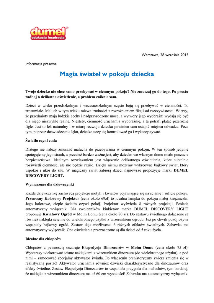 Warszawa, 28 września 2015 Informacja prasowa Magia świateł w pokoju dziecka Twoje dziecko nie chce samo przebywać w ciemnym pokoju? Nie zmuszaj go do tego. Po prostu zadbaj o delikatne oświetlenie, a problem zniknie sam. Dzieci w wieku przedszkolnym i wczesnoszkolnym często boją się przebywać w ciemności. To zrozumiałe. Maluch w tym wieku miewa trudności z rozróżnieniem fikcji od rzeczywistości. Wierzy, że przedmioty mają ludzkie cechy i nadprzyrodzone moce, a wytwory jego wyobraźni wydają się być dla niego niezwykle realne. Niestety, ciemność uruchamia wyobraźnię, a ta potrafi płatać przeróżne figle. Jest to lęk naturalny i w miarę rozwoju dziecka powinien sam ustąpić miejsca odwadze. Poza tym, poprzez doświadczenie lęku, dziecko uczy się kontrolować go i wykorzystywać. Światło czyni cuda Dlatego nie należy zmuszać malucha do przebywania w ciemnym pokoju. W ten sposób jedynie spotęgujemy jego strach, a przecież bardzo ważne jest, aby dziecko we własnym domu miało poczucie bezpieczeństwa. Idealnym rozwiązaniem jest włączenie delikatnego oświetlenia, które subtelnie rozświetli ciemność, ale nie będzie raziło. Dzięki niemu możemy wykreować bajkowy świat, który uspokoi i ukoi do snu. W magiczny świat zabiorą dzieci najnowsze propozycje marki DUMEL DISCOVERY LIGHT. Wymarzone dla dziewczynki Każdą dziewczynkę zachwycą projekcje motyli i kwiatów pojawiające się na ścianie i suficie pokoju. Przenośny Kolorowy Projektor (cena około 69zł) to idealna lampka do pokoju małej księżniczki. Jego kolorowe, cieple światło ożywi pokój. Projektor wyświetla 8 różnych projekcji. Posiada automatyczny wyłącznik. Dla zwolenników kinkietów marka DUMEL DISCOVERY LIGHT proponuje Kwiatowy Ogród w Moim Domu (cena około 80 zł). Do zestawu świetlnego dołączone są również naklejki ścienne do wielokrotnego użytku z wizerunkiem ogrodu. Już po chwili pokój ożywi wspaniały bajkowy ogród. Zestaw daje możliwości 6 różnych efektów świetlnych. Zabawka ma automatyczny wyłącznik. Oba oświetlenia przeznaczone są dla dzieci od 5 roku życia. Idealne dla chłopców Chłopców z pewnością oczaruje Ekspedycja Dinozaurów w Moim Domu (cena około 75 zł). Wystarczy udekorować ścianę naklejkami z wizerunkiem dinozaura (do wielokrotnego użytku), a pod nimi – zamocować specjalny aktywator światła. Po włączeniu prehistoryczny zwierz zmienia się w realistyczną postać! Aktywator uruchamia również dźwięki charakterystyczne dla dinozaurów oraz efekty świetlne. Zestaw Ekspedycja Dinozaurów to wspaniała przygoda dla maluchów, tym bardziej, że naklejka z wizerunkiem dinozaura ma aż 60 cm wysokości! Zabawka ma automatyczny wyłącznik. Świetnie sprawdzi się również Pochodnia w Twoim Domu (cena około 54 zł). Zabawkę, właśnie jak prawdziwą pochodnię, montuje się na specjalnym uchwycie na ścianie, a po włączeniu realistyczny migający „płomień” nadaje pomieszczeniu tajemniczy klimat. Czas na nocne poszukiwanie skarbów, z pochodnią, która rozświetli drogę w ciemności! Oba oświetlenia przeznaczone są dla dzieci od 5 roku życia. Dla nieco starszych Nieco starsze dzieci zachwycą się kinkietami w formie kuli ziemskiej i księżyca. Kula Ziemska (cena około 75 zł) pokazuje rozmieszczenie oświetlenia na globie oraz jego natężenie. Światła na naszej planecie zapalane są od wschodu na zachód. W przypadku Księżyca można odsłaniać jego kolejne fazy. Oba kinkiety przeznaczone są dla dzieci od 6 roku życia. Dla fanów kultowego filmu Gwiezdne Wojny, z okazji wejścia do kin nowego odcinka, firma DUMEL (na licencji Star Wars) przygotowała 4 różne świetle Miecze (cena około 99 zł)! Wszystkie wydają dźwięk charakterystyczny dla mieczy Star Wars. Można je zabrać w każde miejsce, a po zakończonej zabawie umocować na ścianie. Dostępne są w różnych kolorach. Przeznaczone dla dzieci od 6 roku życia. Firma DUMEL od ponad 9 lat jest importerem zabawek i akcesoriów dla dzieci. Oferuje ponad 1000 zabawek od grzechotek, gryzaków po figurki, maskotki, jeździki czy zdalnie sterowane modele. Zabawki firmy DUMEL pobudzają wyobraźnię dziecka poprzez możliwość beztroskiej zabawy i wykorzystania jego niekończących się pomysłów. Zespół stworzony przez firmę to ludzie wykwalifikowani, którzy potrafią dobrać zabawkę odpowiednią do rozwoju psychicznego i motorycznego dziecka. Głównym celem firmy jest sprzedaż zabawek bezpiecznych, edukacyjnych, które będą z dzieckiem od dnia narodzin do momentu kiedy stanie się samodzielne. Szczególną uwagę firma zwraca na bezpieczeństwo swoich produktów. Dlatego każda zabawka z oferty firmy DUMEL wykonana jest z najwyższej jakości surowców, odpowiada europejskim normom bezpieczeństwa oraz posiada certyfikat CE. Ambasadorką marki DUMEL Discovery jest Katarzyna Cichopek. Aktorka, która sama jest mamą, chętnie dzieli się spostrzeżeniami, a także podsuwa własne pomysły, bierze czynny udział w tworzeniu zabawek DUMEL. Ambasadorem marek DUMELoraz Silverlit jest Marcin Łopucki - Mistrz Polski, Mistrz Europy oraz Pierwszy WiceMistrz Świata w Fitnessie Męskim, członek Kadry Narodowej, instruktor oraz trener sportowy. www.dumel.com.pl Serwis PR: Magdalena Ćwikła ul. Rosoła 40 m. 5 02-786 Warszawa tel.: 785-409-803 e-mail: [email protected]