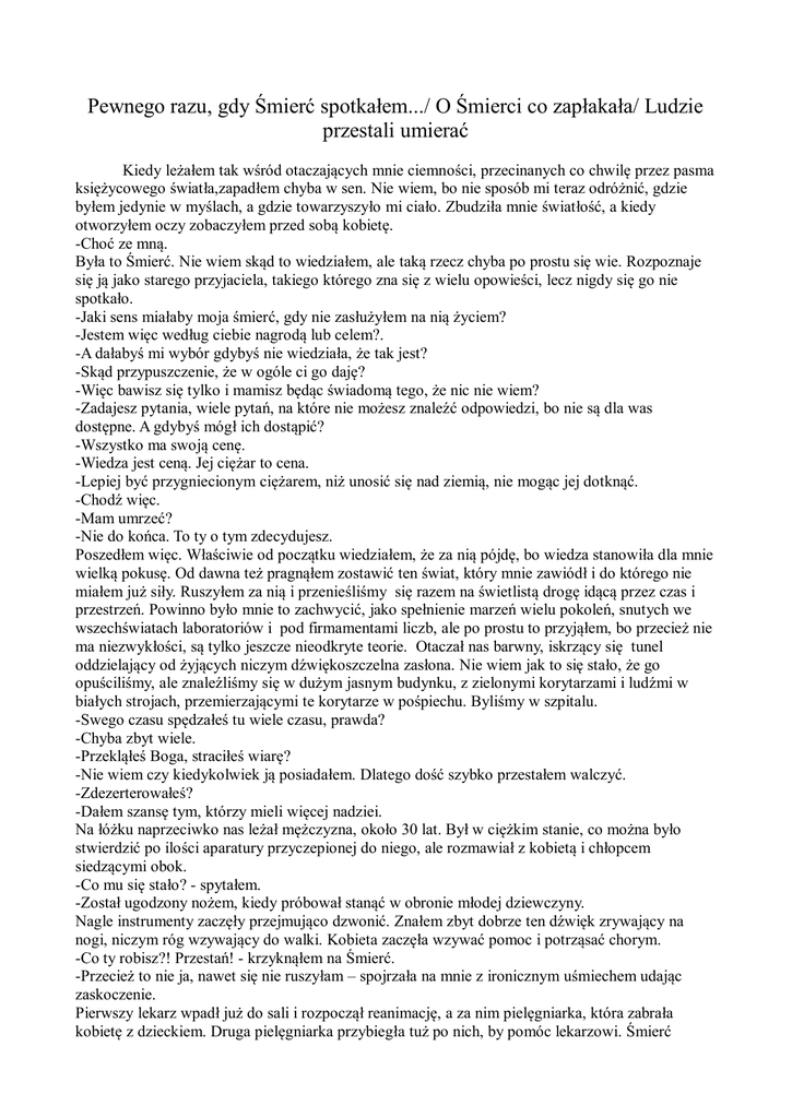 Pewnego razu, gdy Śmierć spotkałem.../ O Śmierci co zapłakała/ Ludzie przestali umierać Kiedy leżałem tak wśród otaczających mnie ciemności, przecinanych co chwilę przez pasma księżycowego światła,zapadłem chyba w sen. Nie wiem, bo nie sposób mi teraz odróżnić, gdzie byłem jedynie w myślach, a gdzie towarzyszyło mi ciało. Zbudziła mnie światłość, a kiedy otworzyłem oczy zobaczyłem przed sobą kobietę. -Choć ze mną. Była to Śmierć. Nie wiem skąd to wiedziałem, ale taką rzecz chyba po prostu się wie. Rozpoznaje się ją jako starego przyjaciela, takiego którego zna się z wielu opowieści, lecz nigdy się go nie spotkało. -Jaki sens miałaby moja śmierć, gdy nie zasłużyłem na nią życiem? -Jestem więc według ciebie nagrodą lub celem?. -A dałabyś mi wybór gdybyś nie wiedziała, że tak jest? -Skąd przypuszczenie, że w ogóle ci go daję? -Więc bawisz się tylko i mamisz będąc świadomą tego, że nic nie wiem? -Zadajesz pytania, wiele pytań, na które nie możesz znaleźć odpowiedzi, bo nie są dla was dostępne. A gdybyś mógł ich dostąpić? -Wszystko ma swoją cenę. -Wiedza jest ceną. Jej ciężar to cena. -Lepiej być przygniecionym ciężarem, niż unosić się nad ziemią, nie mogąc jej dotknąć. -Chodź więc. -Mam umrzeć? -Nie do końca. To ty o tym zdecydujesz. Poszedłem więc. Właściwie od początku wiedziałem, że za nią pójdę, bo wiedza stanowiła dla mnie wielką pokusę. Od dawna też pragnąłem zostawić ten świat, który mnie zawiódł i do którego nie miałem już siły. Ruszyłem za nią i przenieśliśmy się razem na świetlistą drogę idącą przez czas i przestrzeń. Powinno było mnie to zachwycić, jako spełnienie marzeń wielu pokoleń, snutych we wszechświatach laboratoriów i pod firmamentami liczb, ale po prostu to przyjąłem, bo przecież nie ma niezwykłości, są tylko jeszcze nieodkryte teorie. Otaczał nas barwny, iskrzący się tunel oddzielający od żyjących niczym dźwiękoszczelna zasłona. Nie wiem jak to się stało, że go opuściliśmy, ale znaleźliśmy się w dużym jasnym budynku, z zielonymi korytarzami i ludźmi w białych strojach, przemierzającymi te korytarze w pośpiechu. Byliśmy w szpitalu. -Swego czasu spędzałeś tu wiele czasu, prawda? -Chyba zbyt wiele. -Przekląłeś Boga, straciłeś wiarę? -Nie wiem czy kiedykolwiek ją posiadałem. Dlatego dość szybko przestałem walczyć. -Zdezerterowałeś? -Dałem szansę tym, którzy mieli więcej nadziei. Na łóżku naprzeciwko nas leżał mężczyzna, około 30 lat. Był w ciężkim stanie, co można było stwierdzić po ilości aparatury przyczepionej do niego, ale rozmawiał z kobietą i chłopcem siedzącymi obok. -Co mu się stało? - spytałem. -Został ugodzony nożem, kiedy próbował stanąć w obronie młodej dziewczyny. Nagle instrumenty zaczęły przejmująco dzwonić. Znałem zbyt dobrze ten dźwięk zrywający na nogi, niczym róg wzywający do walki. Kobieta zaczęła wzywać pomoc i potrząsać chorym. -Co ty robisz?! Przestań! - krzyknąłem na Śmierć. -Przecież to nie ja, nawet się nie ruszyłam – spojrzała na mnie z ironicznym uśmiechem udając zaskoczenie. Pierwszy lekarz wpadł już do sali i rozpoczął reanimację, a za nim pielęgniarka, która zabrała kobietę z dzieckiem. Druga pielęgniarka przybiegła tuż po nich, by pomóc lekarzowi. Śmierć powoli ruszyła w ich stronę i mijała tych fanatyków życia w białych kitlach jakby nie istnieli. Patrzyłem z napięciem na to co robią i wracały do mnie wspomnienia tych wszystkich ludzi, o których kiedyś walczyłem ja. Wtedy kiedy jeszcze miałem siłę i chęć i wiarę w wartość życia. Śmierć pochyliła się nad chorym i musnęła delikatnie jego czoło, jakby go całując. W tym momencie aparaty wydały z siebie przenikliwy i bezlitośnie jednostajny dźwięk. Ilekroć taki dźwięk rozlegał się w szpitalu zdawało się, że wszystko milkło. Wszyscy zatrzymywali się w refleksji nad kolejnym dowodem ludzkiej bezradności i daremności. Przeciągły pisk mógł zagłuszyć tylko jeden dźwięk. Rozpacz. -Dlaczego? - spytałem chyba nie oczekując odpowiedzi, bo nigdy jej na to pytanie nie otrzymałem. -Przyszedł jego czas. Poza tym nie on jeden. Chcesz znać dzisiejszą listę obecności w kostnicy? Oprócz kilku starców jeszcze zadźgany chłopak, zastrzelona dziewczyna, dziecko z wadą serca... -Boże, jaka ty jesteś okrutna! - powiedziałem to jednocześnie osuwając się i zakrywając głowę dłońmi. - Dlaczego? Dlaczego tyle cierpienia, dlaczego tyle okrucieństwa? -Boga nie ma co wzywać. Taki jest świat. Właściwie nie moja wina. - powiedziała siadając na parapecie i zapalając papierosa – nie ja ich w końcu zabijam. Siebie zmieńcie, nie mnie. -To ty zabierasz życie. Samo chyba sobie dziecko wady serca nie wymyśliło? Dlaczego opuszczeni rodzice mają cierpieć przez jakiegoś idiotę? Spojrzała się na mnie tylko i wypuściła dym ustami. Nie byliśmy już w sali. Staliśmy przed szpitalem, patrząc na SOR i na ulicę w oddali. Nie było tu wielu zabudowań. Szpitale zawsze są oddalone od normalnego życia. -Wiesz, co? Musisz zrozumieć, że to właśnie cierpienie jest tym co czyni was ludźmi. Nie widzisz? Cierpienie sprawia, że prawdziwie czujesz, prawdziwie myślisz i zadajesz pytania. Musisz cierpieć, aby zaznać szczęścia. Jednak życie w szczęściu, to jak słuchanie muzyki zza ściany. Słyszysz ją tak ogólnie, może rozpoznasz jej brzmienie. Lecz umkną ci tony najwyższe i najniższe, nie przeżyjesz jej i nie poczujesz. To jak patrzeć na cień próbując rozpoznać przedmiot, będący jego przyczyną. Aby żyć, musisz cierpieć. Taka jest wasza klątwa. -Ty nią jesteś. -Ja jestem wolnością. -To skąd zło? Uśmiechnęła się z pobłażaniem kręcąc głową, po czym ruszyła znów w drogę, a ja za nią. Znaleźliśmy się na zatłoczonej, brudnej ulicy