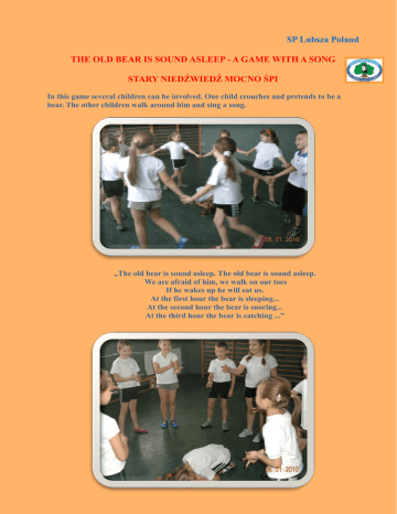 SP Lubsza Poland THE OLD BEAR IS SOUND ASLEEP - A GAME WITH A SONG STARY NIEDŹWIEDŹ MOCNO ŚPI In this game several children can be involved. One child crouches and pretends to be a bear. The other children walk around him and sing a song. „The old bear is sound asleep. The old bear is sound asleep. We are afraid of him, we walk on our toes If he wakes up he will eat us. At the first hour the bear is sleeping... At the second hour the bear is snoring... At the third hour the bear is catching ...” After the last verse of the song the child who is the bear „wakes up” and chase children. All children run away. The child caught by „the bear” sits in the middle of the circle and the game starts again. STARY NIEDŹWIEDŹ MOCNO ŚPI THE OLD BEAR IS SOUND ASLEEP - A GAME WITH A SONG Jedno z dzieci kuca skulone i udaje śpiącego niedźwiedzia. Reszta dzieci chodzi w koło "niedźwiedzia" i powtarza słowa piosenki: Stary niedźwiedź mocno śpi, stary niedźwiedź mocno śpi, my się go boimy, na palcach chodzimy, jak się zbudzi to nas zje, jak się zbudzi, to nas zje. Pierwsza godzina niedźwiedź śpi, druga godzina niedźwiedź chrapie. trzecia godzina niedźwiedź łapie! W tym czasie niedźwiedź się budzi i biegnie w stronę dzieci. Dzieci uciekają, żeby nie dać się złapać niedźwiedziowi. Dziecko, które zostanie złapane przez niedźwiedzia, zostaje "niedźwiedziem". Gra rozpoczyna się od nowa.