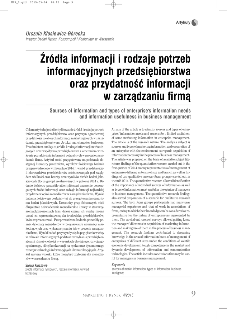 MiR_2.qxd 2015-03-24 18:12 Page 9 Artykuły Urszula Kłosiewicz-Górecka Instytut Badań Rynku, Konsumpcji i Koniunktur w Warszawie Źródła informacji i rodzaje potrzeb informacyjnych przedsiębiorstwa oraz przydatność informacji w zarządzaniu firmą Sources of information and types of enterprise's information needs and information usefulness in business management Celem artykułu jest zidentyfikowanie źródeł i rodzaju potrzeb informacyjnych przedsiębiorstw oraz przyczyn ograniczonej przydatności niektórych informacji marketingowych w zarządzaniu przedsiębiorstwem. Artykuł ma charakter badawczy. Przedmiotem analizy są źródła i rodzaje informacji marketingowych oraz współpraca przedsiębiorstwa z otoczeniem w zakresie pozyskiwania informacji potrzebnych w procesie zarządzania firmą. Artykuł został przygotowany na podstawie dostępnej literatury przedmiotu, wyników ilościowego badania przeprowadzonego w I kwartale 2014 r. wśród przedstawicieli kierownictwa przedsiębiorstw zróżnicowanych pod względem wielkości oraz branży oraz wyników dwóch badań jakościowych (focus group) zrealizowanych w połowie 2014 r. Badanie ilościowe pozwoliło zidentyfikować znaczenie poszczególnych źródeł informacji oraz rodzaje informacji najbardziej przydatne w opinii menedżerów w zarządzaniu firmą. Wyniki badania ilościowego posłużyły też do przygotowania scenariusza badań jakościowych. Uczestnicy grup fokusowych mieli długoletnie doświadczenie menedżerskie i pracy w stowarzyszeniach/zrzeszeniach firm, dzięki czemu ich wiedzę można uznać za reprezentatywną dla środowiska przedsiębiorców, które reprezentowali. Przeprowadzone badania pozwoliły poznać dylematy menedżerów w pozyskiwaniu informacji marketingowych oraz wykorzystywaniu ich w procesie zarządzania firmą. Wyniki badań przyczyniły się do pogłębienia wiedzy w zakresie informacyjnych podstaw zarządzania przedsiębiorstwami różnej wielkości w warunkach chwiejnego rozwoju gospodarczego, silnej konkurencji na rynku oraz dynamicznego rozwoju technologii informacyjnych i komunikacyjnych. Artykuł zawiera wnioski, które mogą być użyteczne dla menedżerów w zarządzaniu firmą. An aim of the article is to identify sources and types of enterprises' information needs and reasons for a limited usefulness of some marketing information in enterprise management. The article is of the research nature. The analysis' subject is sources and types of marketing information and cooperation of an enterprise with the environment as regards acquisition of information necessary in the process of business management. The article was prepared on the basis of available subject literature, findings of the quantitative research carried out in the first quarter of 2014 among representatives of management of enterprises differing in terms of size and branch as well as findings of two qualitative surveys (focus groups) carried out in the mid-2014. The quantitative research allowed identification of the importance of individual sources of information as well as types of information most useful in the opinion of managers in business management. The quantitative research findings also served preparation of a scenario for qualitative research surveys. The both focus groups participants had many-year managerial experience and that of work in associations of firms, owing to which their knowledge can be considered as representative for the milieu of entrepreneurs represented by them. The carried out research surveys allowed getting know the managers' dilemmas in acquisition of marketing information and making use of them in the process of business management. The research findings contributed to deepening knowledge in the area of information bases of management of enterprises of different sizes under the conditions of volatile economic development, tough competence in the market and dynamic development of information and communication technologies. The article includes conclusions that may be useful for managers in business management. Słowa kluczowe Keywords źródła informacji rynkowych, rodzaje informacji, wywiad biznesowy sources of market information, types of information, business intelligence MARKETING I RYNEK 4/2015 9 MiR_2.qxd 2015-03-24 18:12 Page 10 Artykuły We współczesnym świecie biznesu znaczenie informacji trudno byłoby przecenić, choć zmienia się jej postrzeganie. Na przełomie wieków XX i XXI ukazało się wiele publikacji, w których informacja była przedmiotem rozważań naukowych, np.: z P.F. Drucker uważał, że utrzymanie postępu wiąże się z zapotrzebowaniem na informacje, które powszechnie uznaje się za czwarty czynnik produkcji (oprócz ziemi, kapitału, pracy), od którego zależy sprawne funkcjonowanie przedsiębiorstwa (Beatty, 2004, s. 136–137); z P. Kotler określił informację kluczowym elementem w marketingu, a prowadzenie działalności marketingowej oraz tworzenie skutecznej strategii wiązał z pozyskiwaniem i przetwarzaniem informacji (Kotler, 2005, s. 123); z B. Sojkin wskazywał na niedocenianie systematycznego gromadzenia i opracowywania informacji (bazy danych) i pomijania znaczenia informacji jako czynnika tworzącego wartość dodaną dla klienta, pośrednika, dostawcy i samego przedsiębiorstwa (Sojkin, 2009, s. 16). Dynamiczny rozwój technologii informacyjnych i komunikacyjnych oraz nasilająca się w Polsce konkurencja oraz rosnąca niepewność w zakresie kształtowania się uwarunkowań funkcjonowania przedsiębiorstwa na rynku sprawiają, że z jednej strony rośnie świadomość menedżerów co do znaczenia informacji dla zarządzania firmą, z drugiej zaś wzmagają się trudności w pozyskaniu potrzebnych informacji marketingowych. Głównym celem artykułu jest zidentyfikowanie źródeł i rodzaju potrzeb informacyjnych przedsiębiorstw oraz przyczyn ograniczonej przydatności dostępnych informacji marketingowych w zarządzaniu przedsię